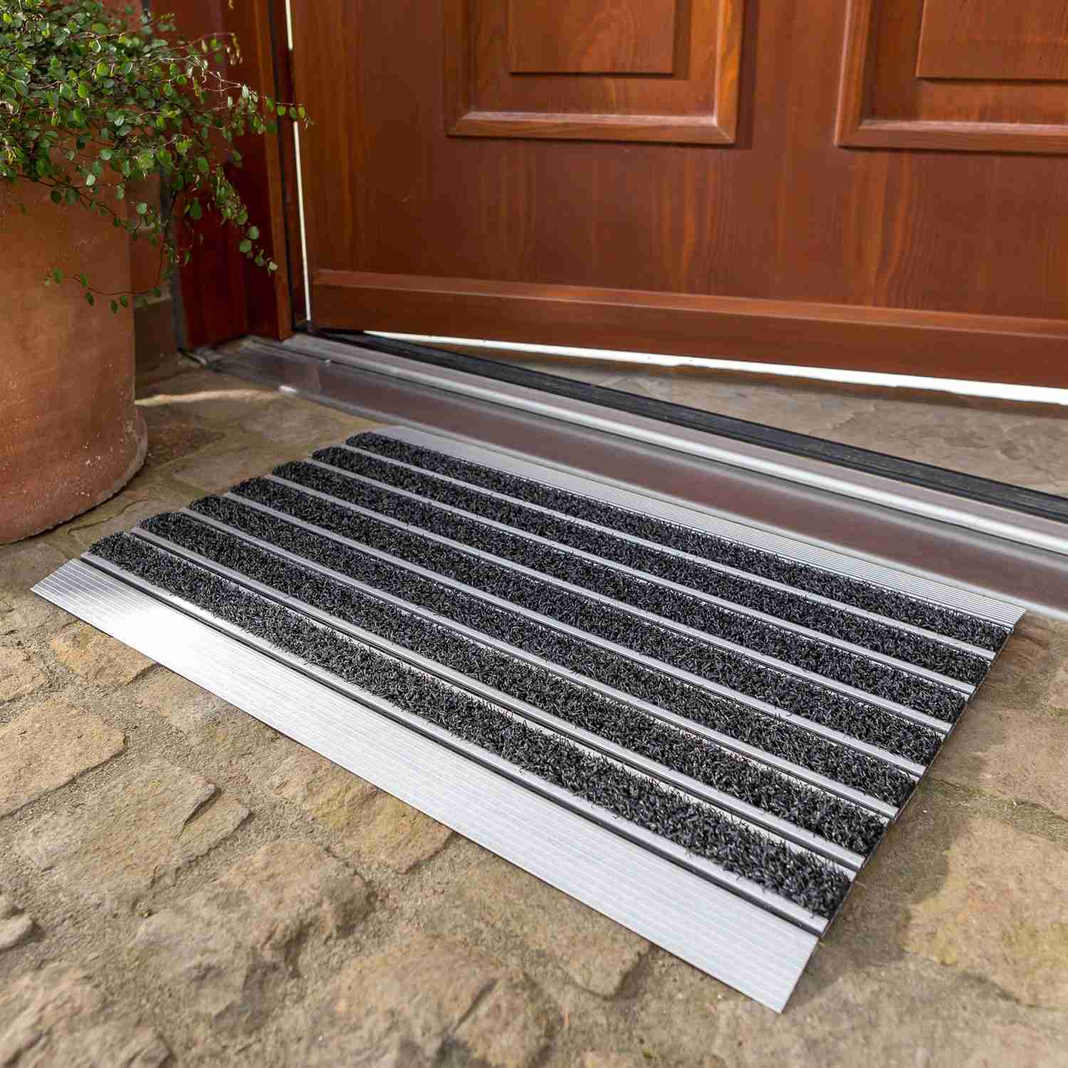 Aliminium Fußmatte mit hochwirksamer Grobfaser Rib Einlage oder feiner Scrape Einlage. Eis sicherer Blickfang für Gäste und ein optisches Highlight an Ihrer Haustür. Die Matte fängt Grob und Feinschmutz zuverlässig auf und verhindert, dass dieser mit in die Wohnung getragen wird.