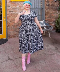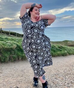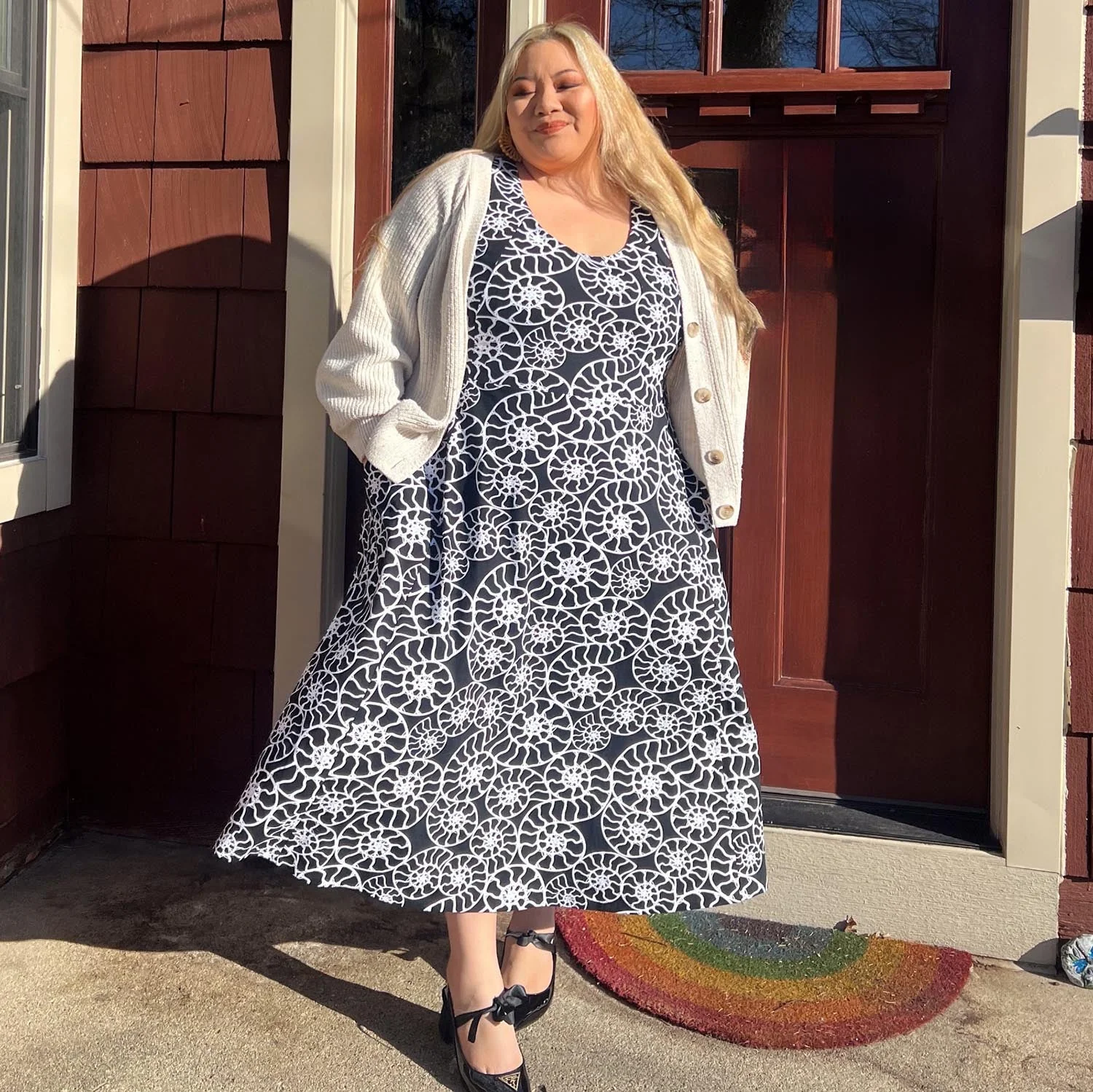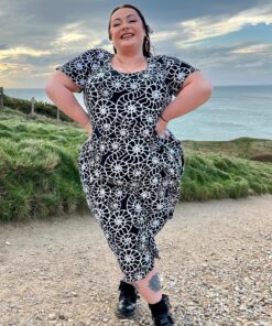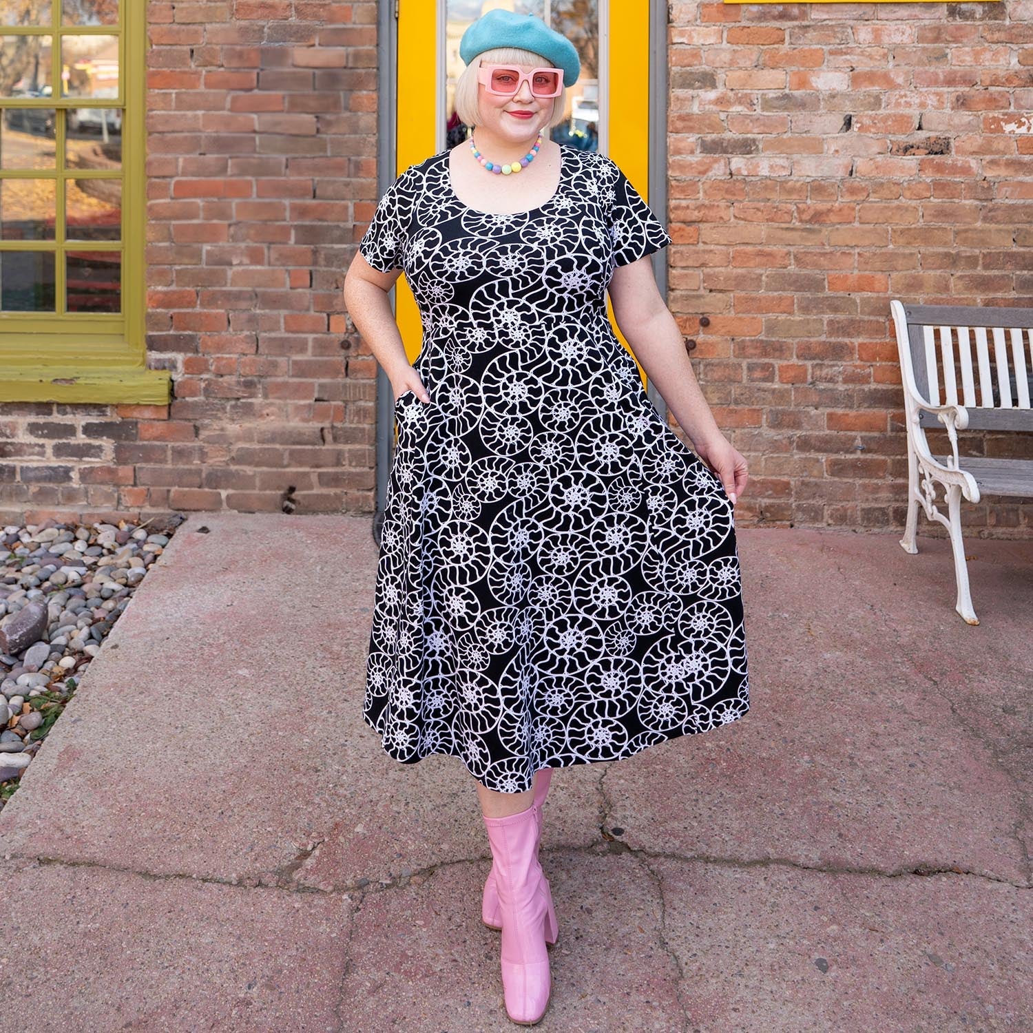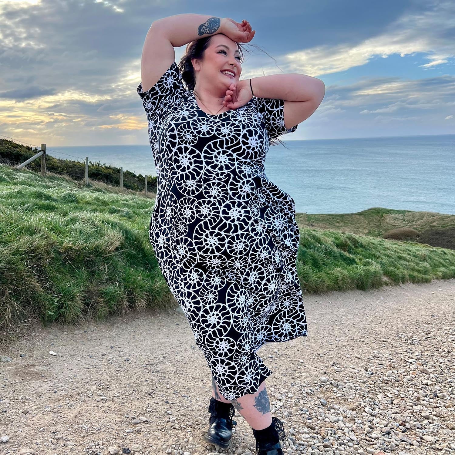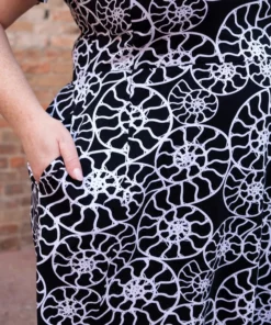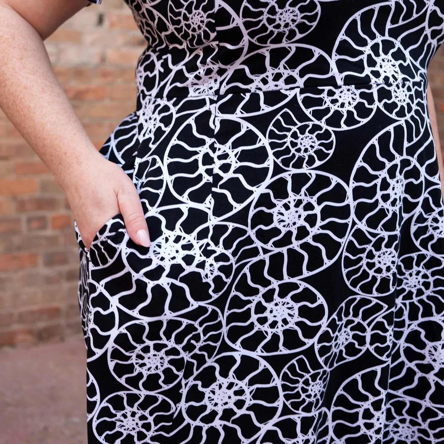 Das Ammonite A-Linien-Kleid ist ein prähistorisches Meisterwerk, das Ihre Garderobe in die nächste Ära katapultiert. Mit einem beeindruckenden schwarzen Grundton und einem handgezeichneten weißen Ammonitenmuster, das den gesamten Stoff ziert, ist dieses Kleid eine Hommage an die wunderschönen versteinerten Spiralen, die die Zeit überdauert haben.