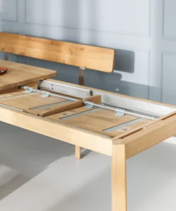 Wir nutzen bewährte Qualitätskomponenten für Massivholztische. Die Erweiterungsplatten haben eingefräste Griffe, wodurch sie sich von einer Person leicht ausklappen lassen. Auch im ausgefahrenen Zustand büßt der Tisch nicht an Stabilität und Standfestigkeit ein.