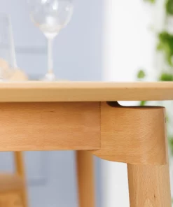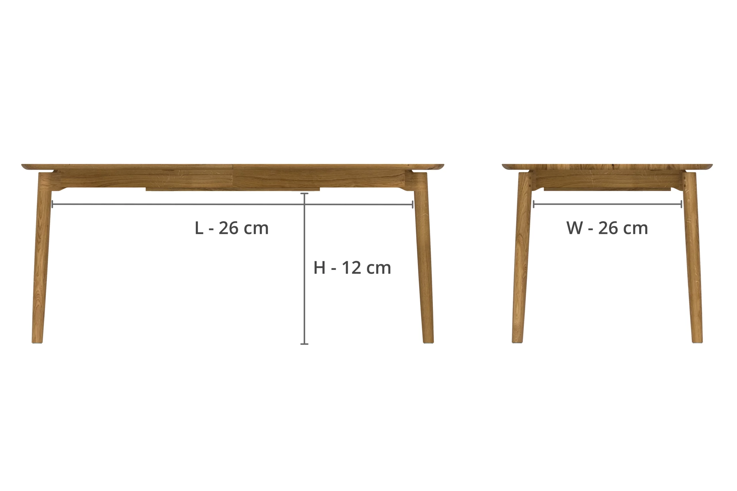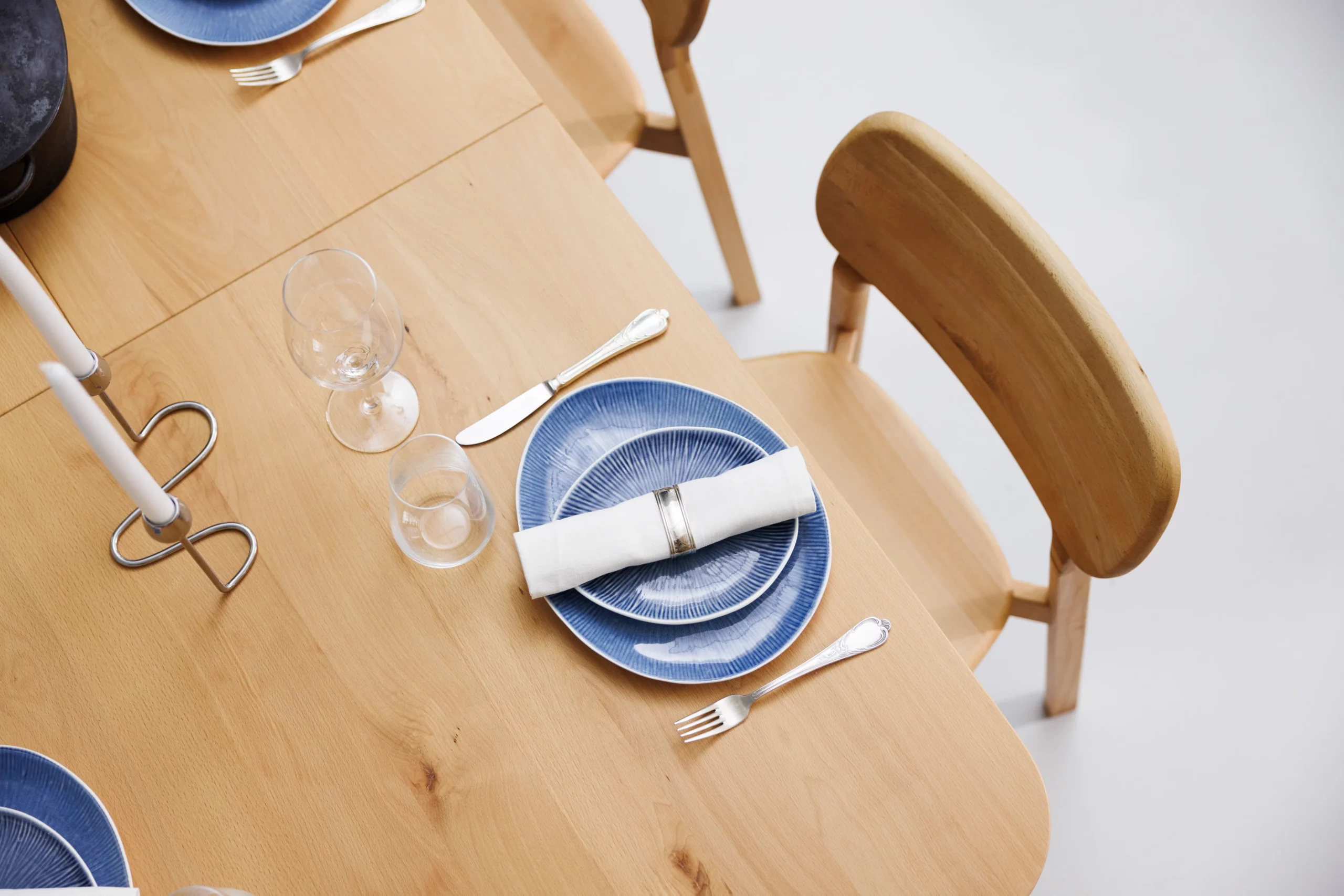 Der Tischauszug befindet sich in der Tischmitte und besteht aus zwei Massivholzplatten. Die Erweiterungsplatten haben eingefräste Griffe, wodurch sie sich von einer Person leicht ausklappen lassen. Auch im ausgefahrenen Zustand büßt der Tisch nicht an Stabilität und Standfestigkeit ein.