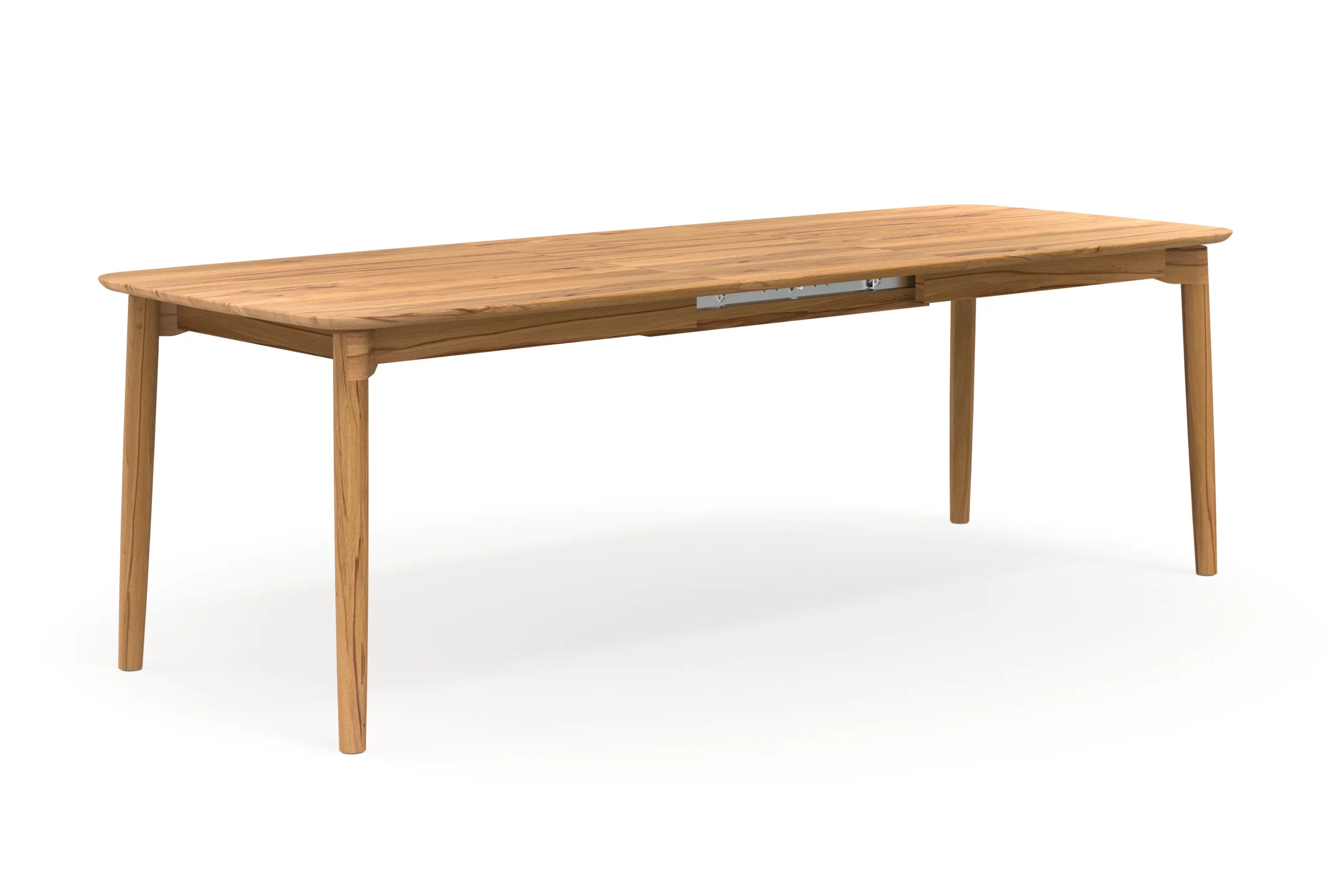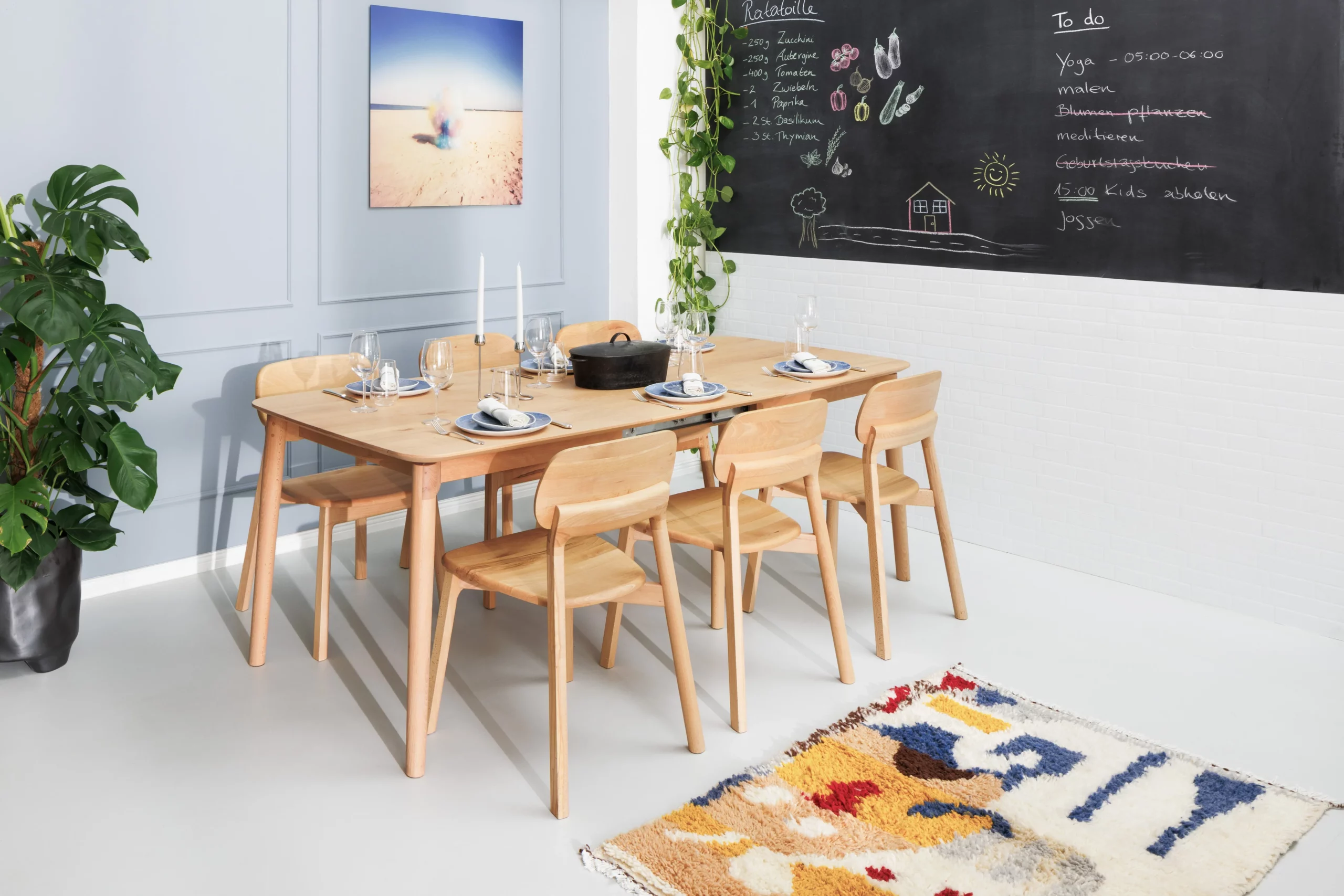 Der Tischauszug befindet sich in der Tischmitte und besteht aus zwei Massivholzplatten. Die Erweiterungsplatten haben eingefräste Griffe, wodurch sie sich von einer Person leicht ausklappen lassen. Auch im ausgefahrenen Zustand büßt der Tisch nicht an Stabilität und Standfestigkeit ein.