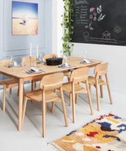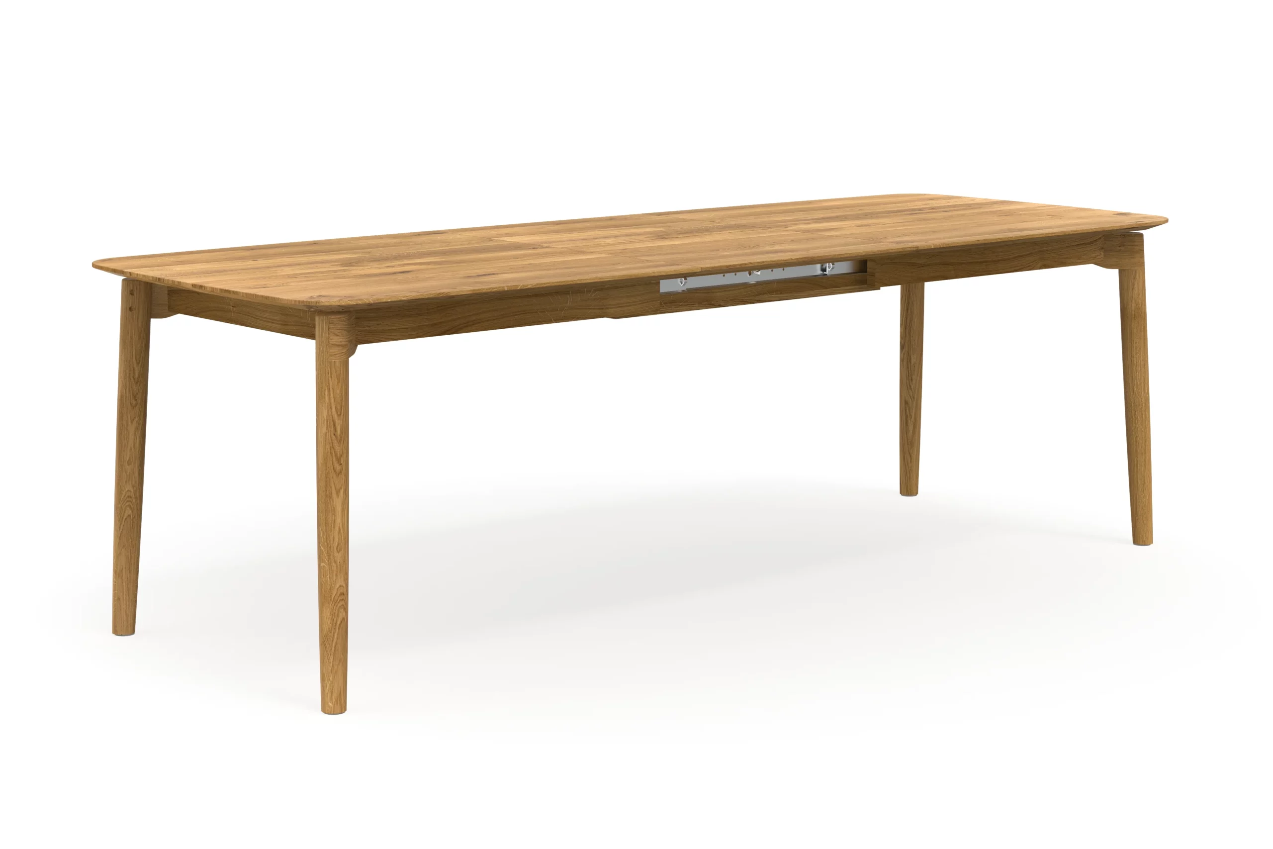 Der Tischauszug befindet sich in der Tischmitte und besteht aus zwei Massivholzplatten. Die Erweiterungsplatten haben eingefräste Griffe, wodurch sie sich von einer Person leicht ausklappen lassen. Auch im ausgefahrenen Zustand büßt der Tisch nicht an Stabilität und Standfestigkeit ein.