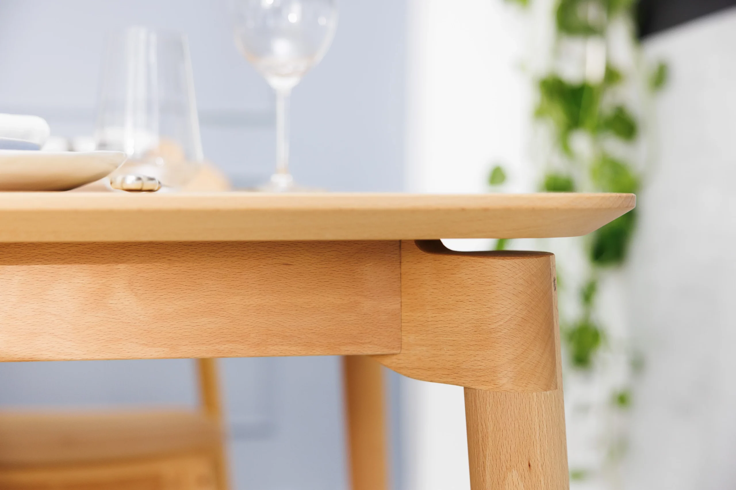 Die runden, leicht schräg gestellten Holzbeine verjüngen sich leicht zum Boden hin und sind über eine “glatte Eckplatte” mit sichtbaren Holzdübeln mit dem Tischrahmen verbunden. Der Spalt verleiht dem Tisch eine fast schwebende Leichtigkeit, die durch die schmale Schweizer Kante besonders betont wird.