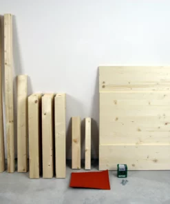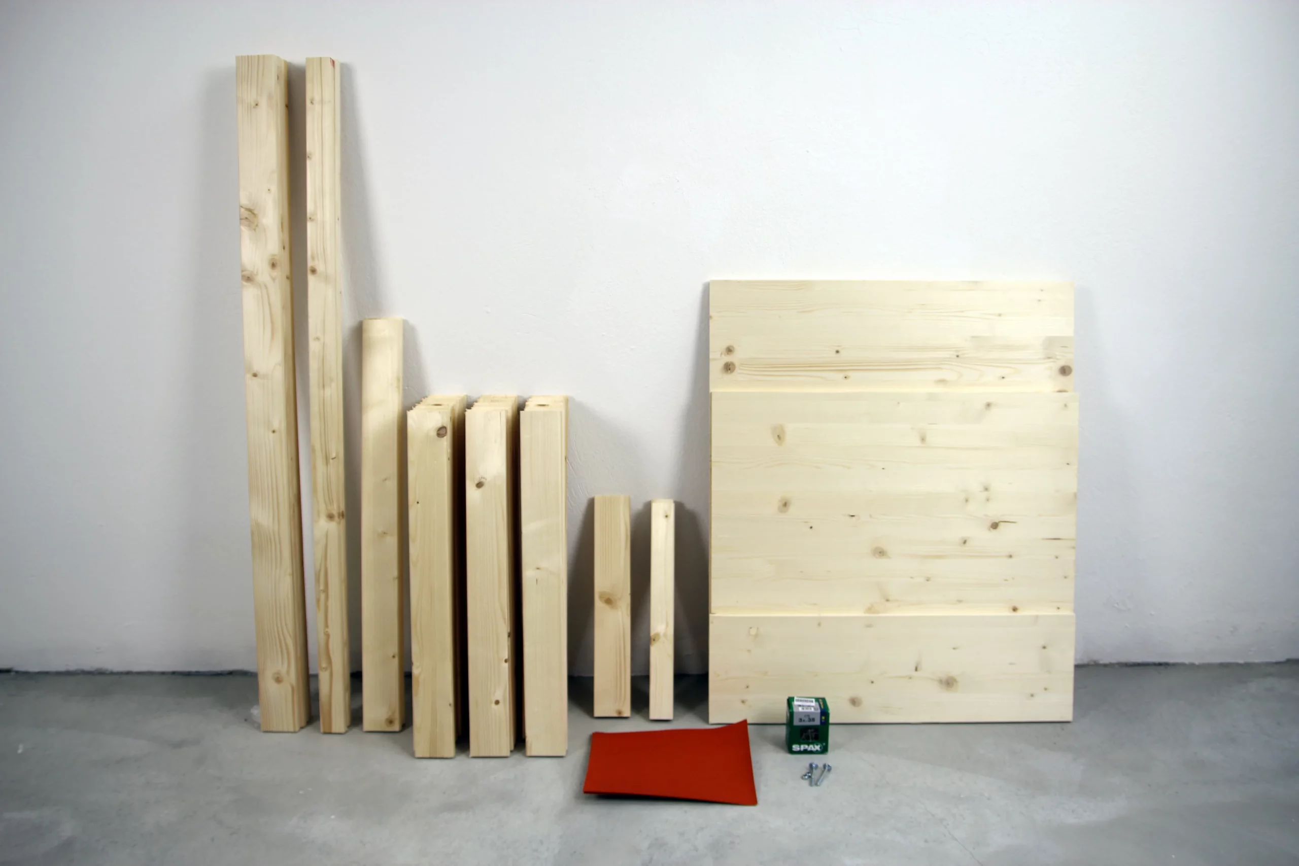 Das Bett wird aus zwei Sorten Holzlatten, einem Brett und nur einer Sorte Holzschrauben gebaut – alles Standardgrößen, die es in jedem Baumarkt gibt. Als Werkzeug reicht eine Stichsäge und ein guter Akkubohrer. Aber schau es dir selbst an: