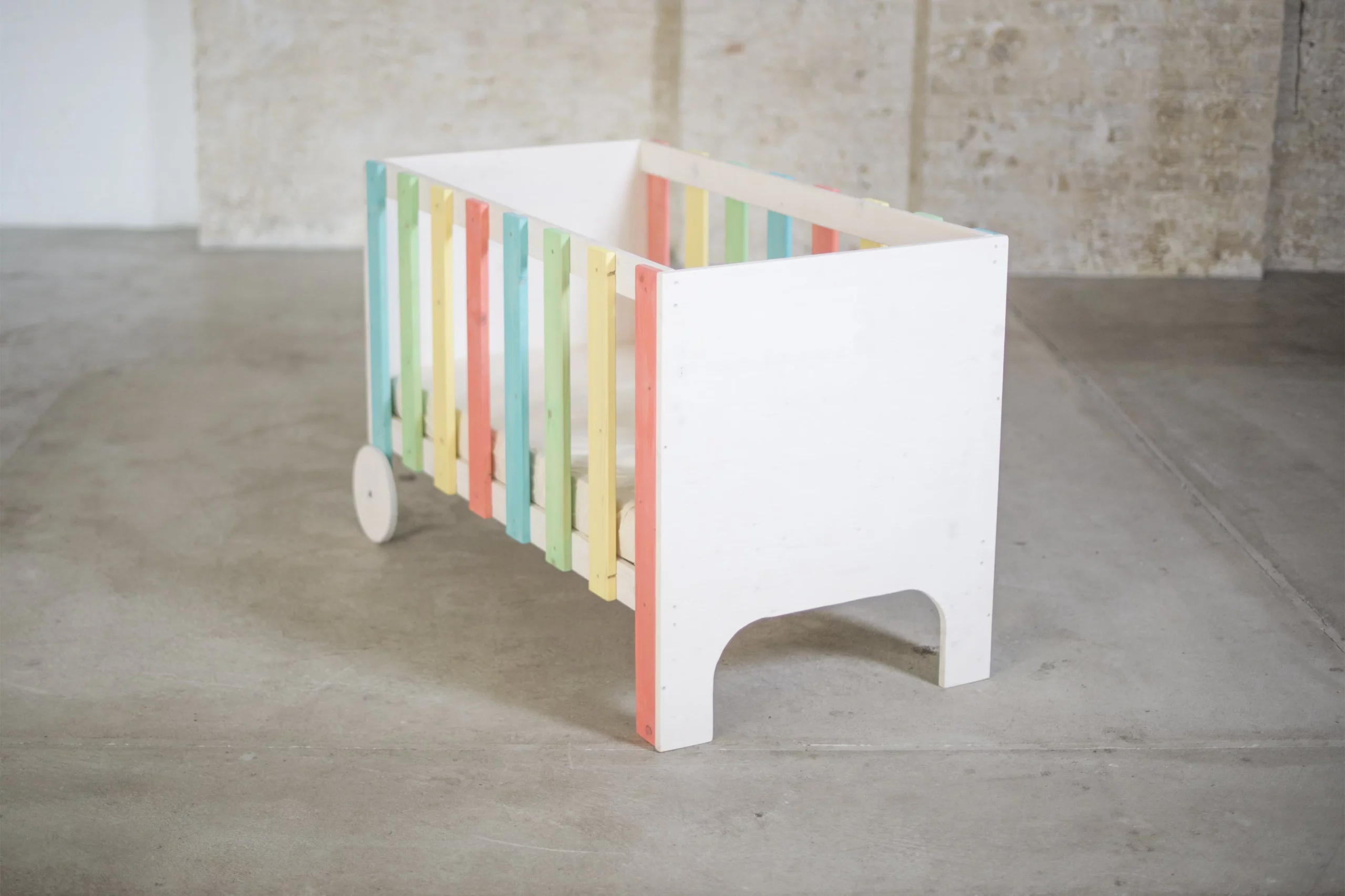 Das Babybett ist für Matratzen mit der handelsüblichen Größe von 120x60cm geeignet und lässt sich durch die Rollen einfach im Zimmer verschieben.