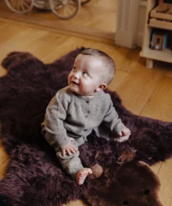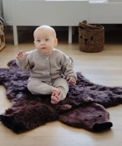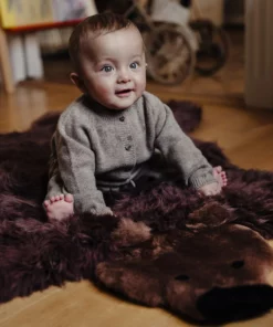 Der von Lammfell gemachte Bär wird mit seinem schokoladebraunen neuseeländischen Lammfell, schwarzen Schnauze und Pfoten wunderschön neben dem Bett aussehen und Ihr Kind wird garantiert viel Spaß damit haben.