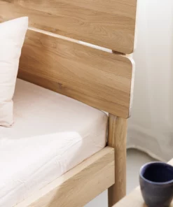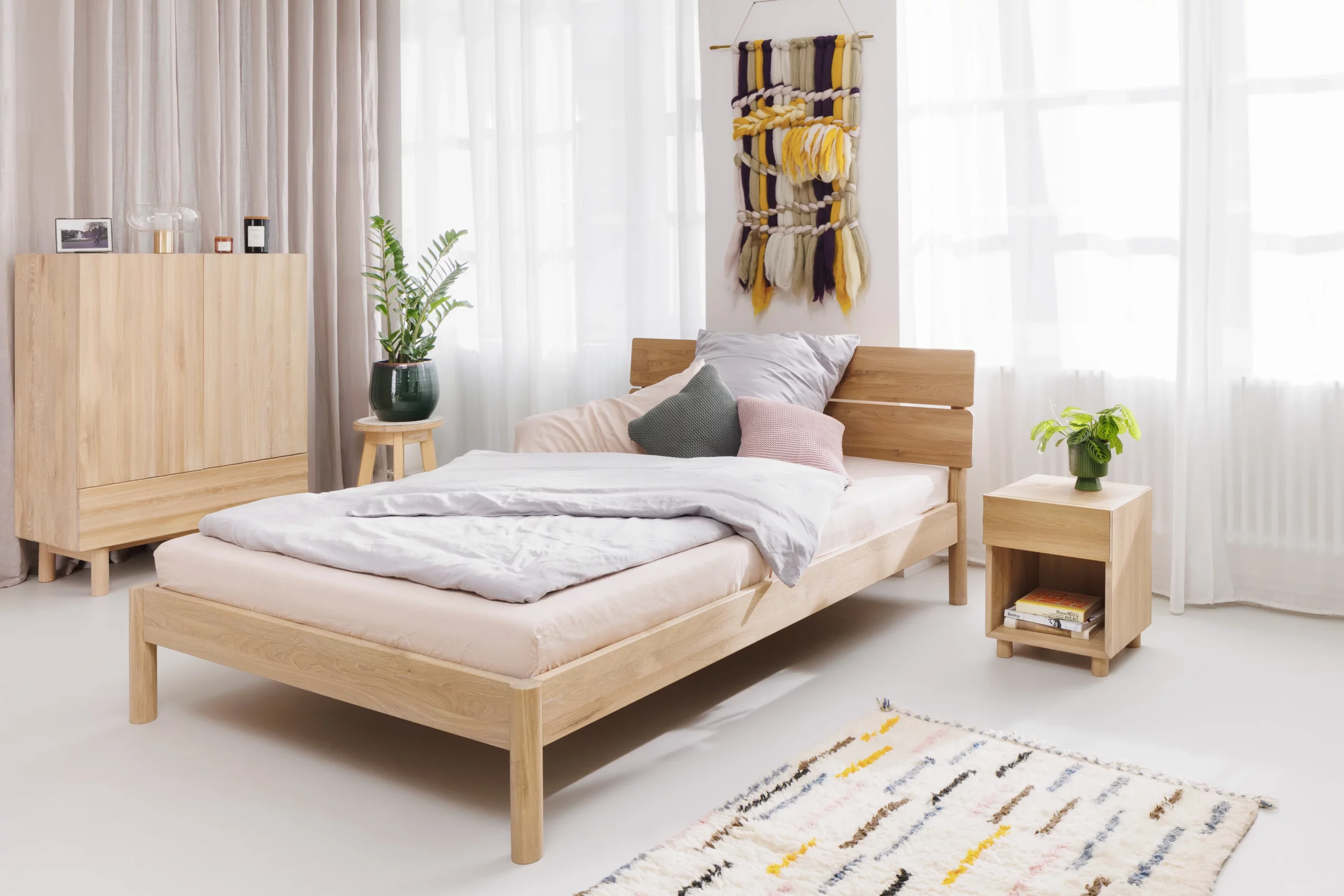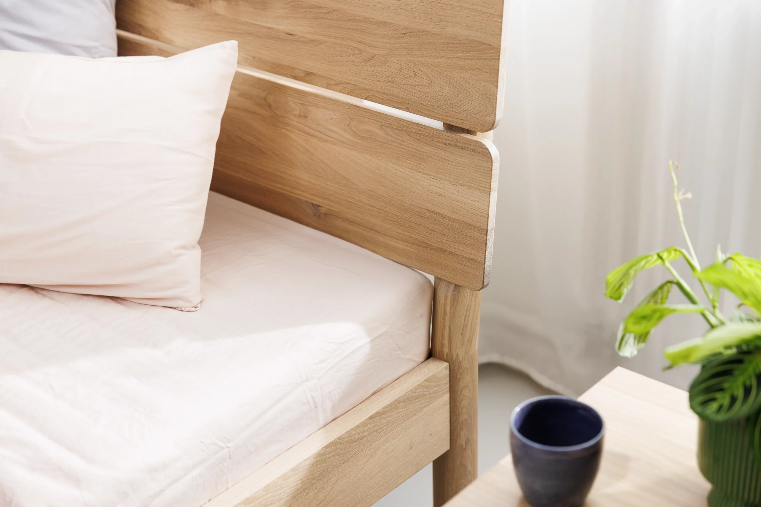 Für Ærø verwenden wir FSC oder PEFC zertifiziertes, 28mm starkes Eichenholz. Eiche zeichnet sich durch hohe Stabilität und Härte aus. Dadurch wird das Bett trotz des schlanken, leichten Designs äußerst stabil und belastbar.