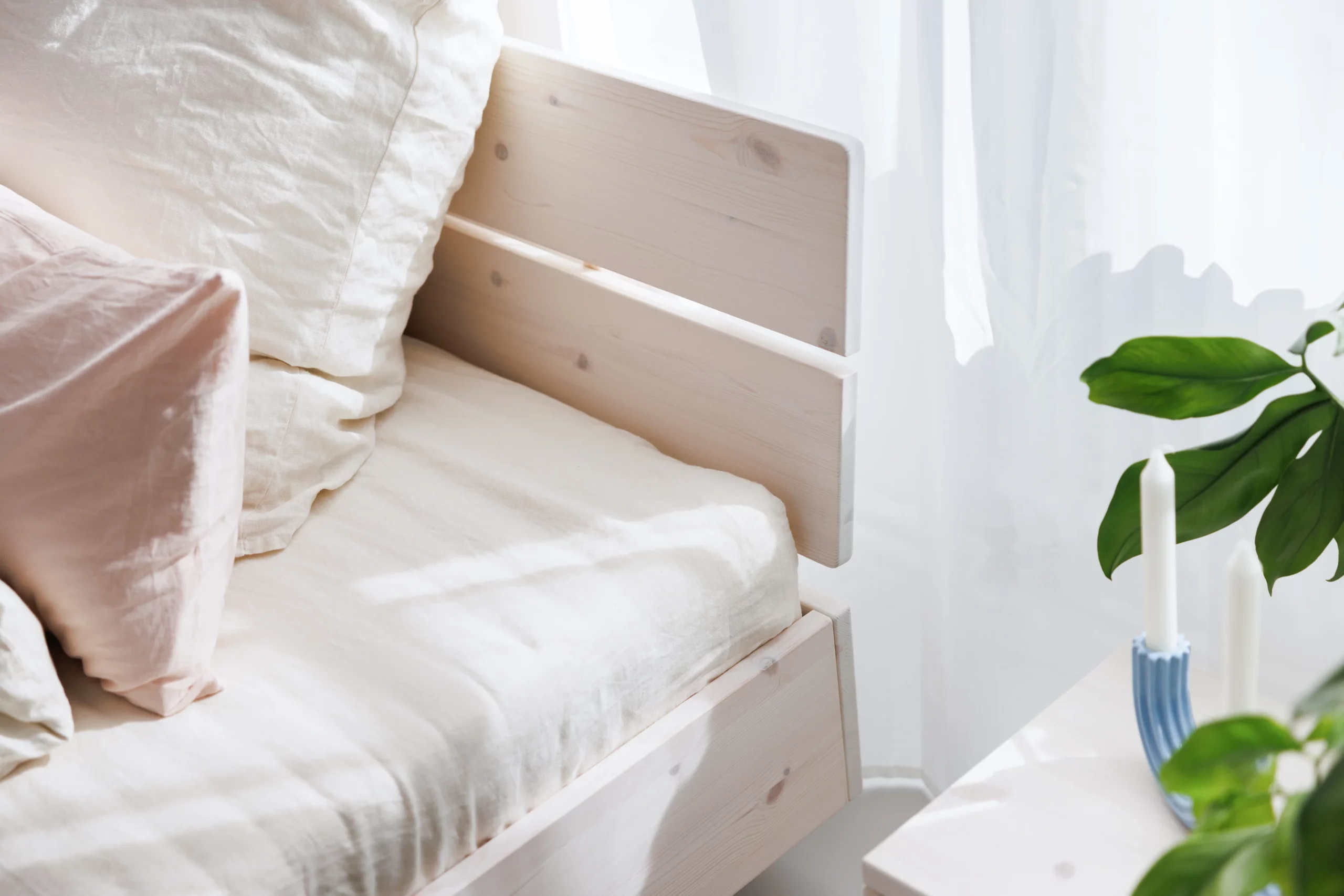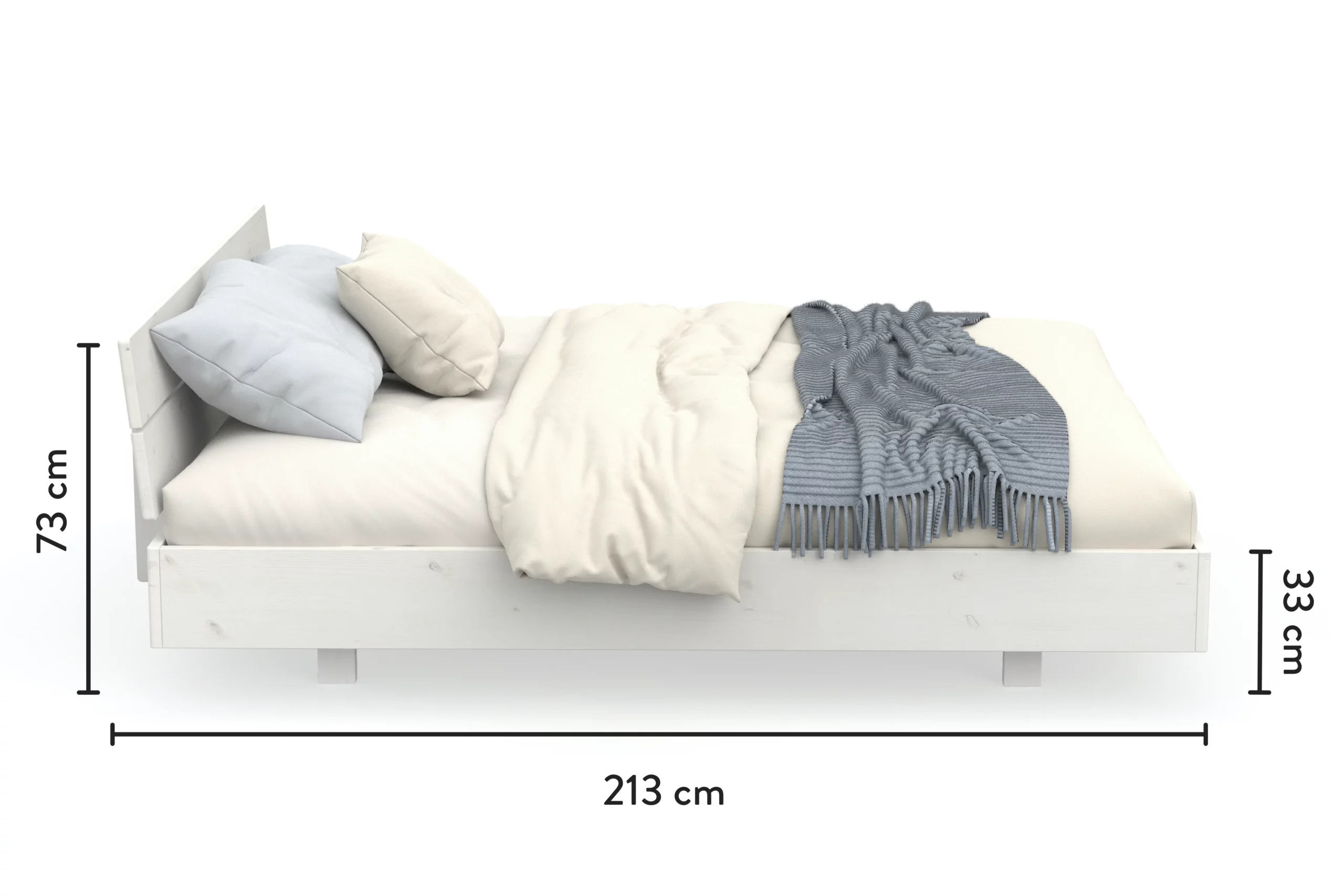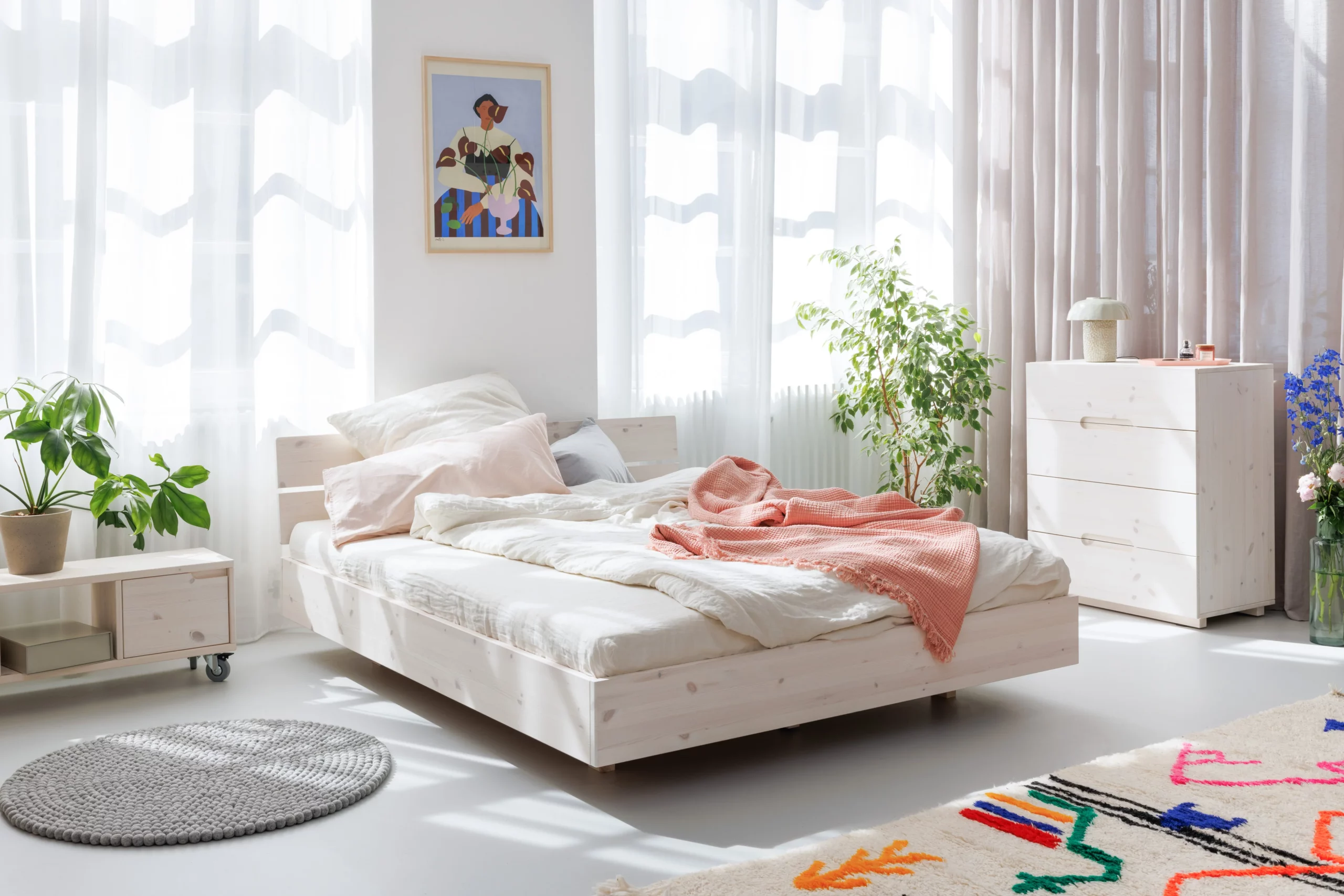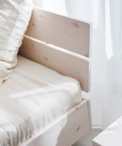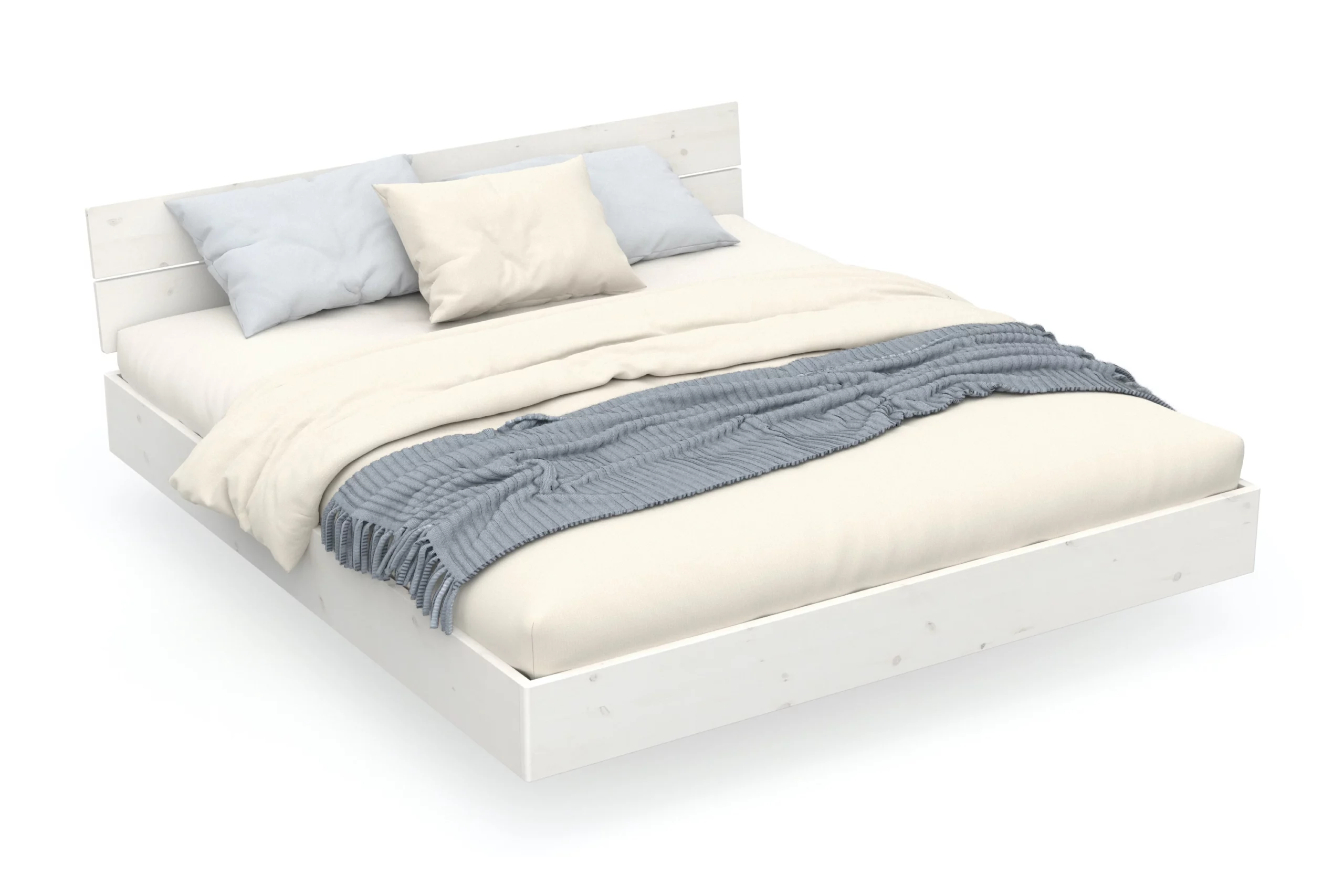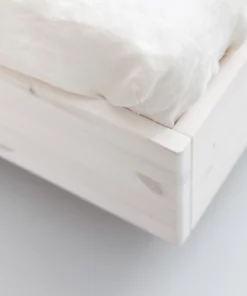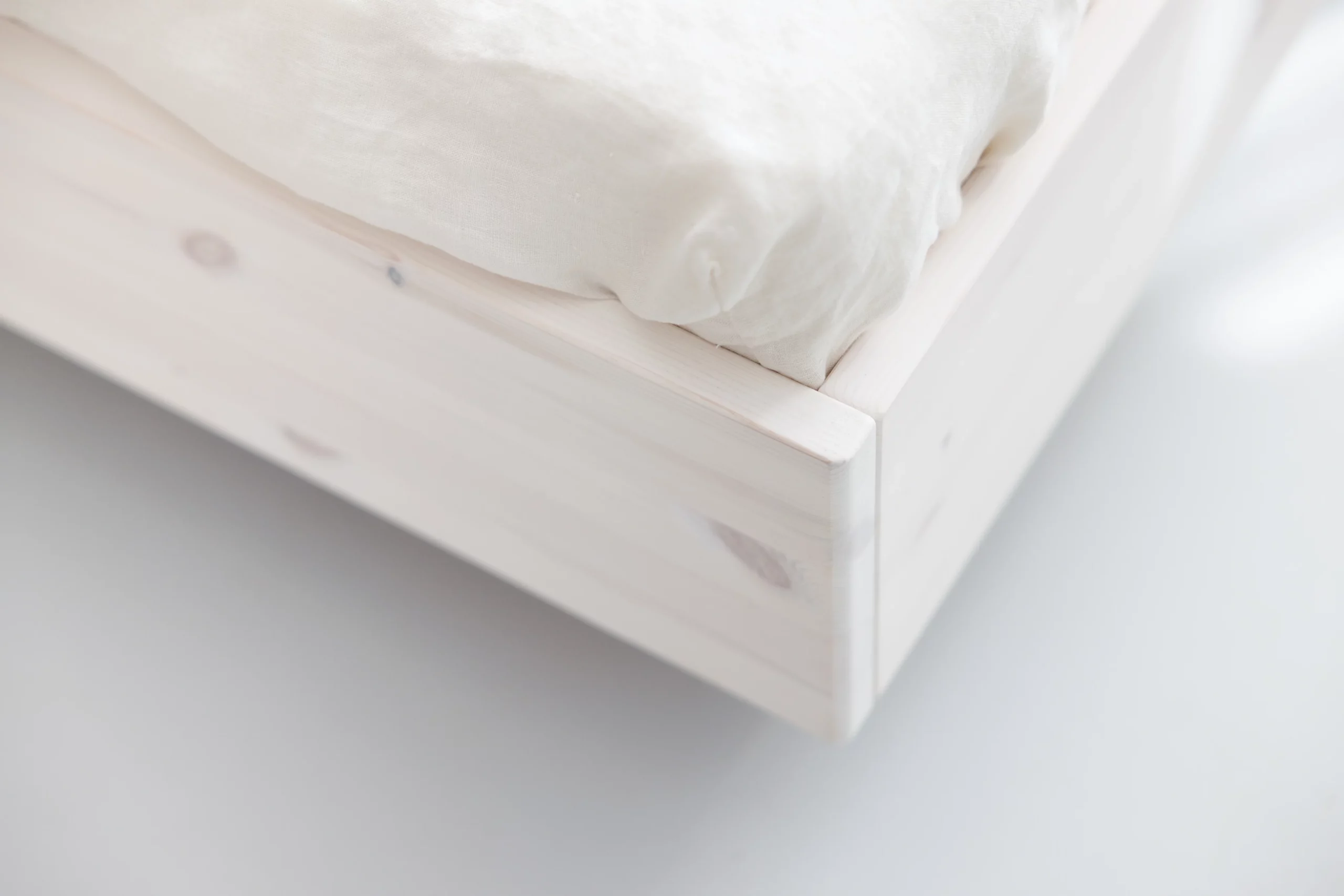Das Bett Swebe macht aus der Ferne den Eindruck als würde es schweben, weil die Füße leicht versetzt unter dem Bett stehen. Der schlichte Rahmen ist mit einer weißen, leicht durchschimmernden ökologischen Lasur behandelt und fügt sich problemlos in die meisten Umgebungen ein.