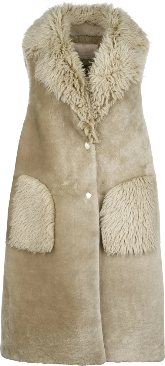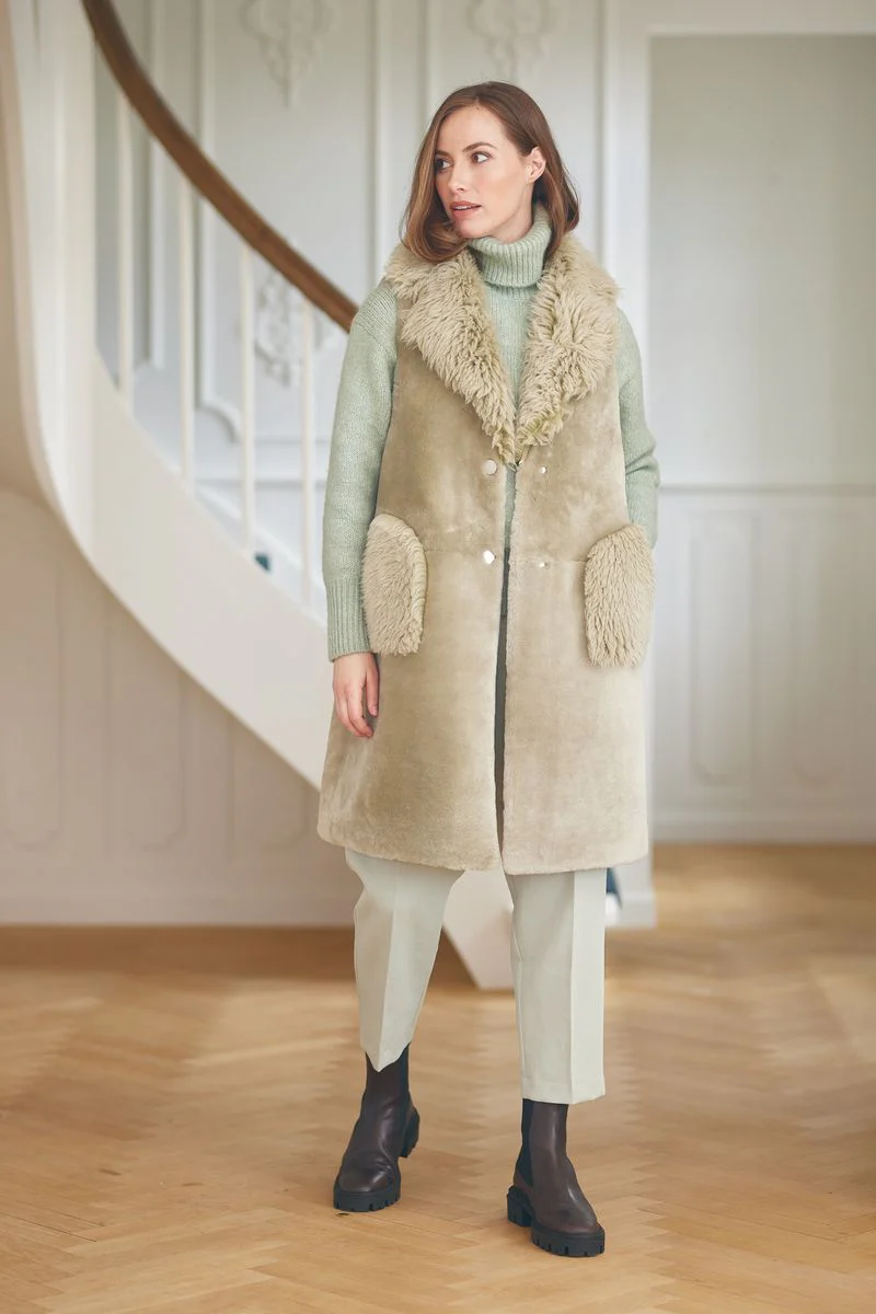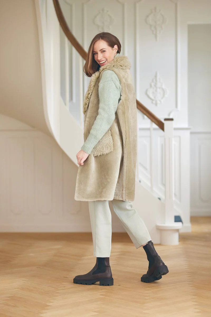 Dawn schließt mit zwei Druckknöpfen und hat einen großen, schönen Kragen aus Langhaar Schaffell. Das macht die Weste extrem bequem und warm. Die Weste hat zwei Taschen auf der Vorderseite und sie sind mit dem schönen Langhaar Schaffell wie der Kragen bedeckt.