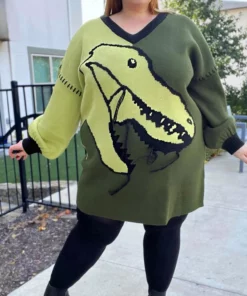 Nicht bewegen! Sein Stil basiert auf purem Style. Das Rex-Jumper-Kleid stampft episch in Ihre Garderobe mit dem beeindruckendsten gestrickten Dinosaurier.