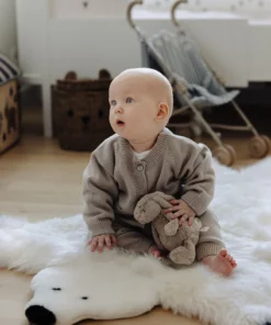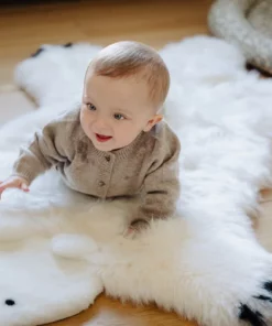 Der Eisbär ist von dem feinsten neuseeländischen Lammfell gemacht. Das Lammfell ist medizinisch gegerbt, was bedeutet, dass es perfekt für zarte Kinderhaut ist und dass es auch die Waschmaschine vertragen kann, falls das nötig wird.