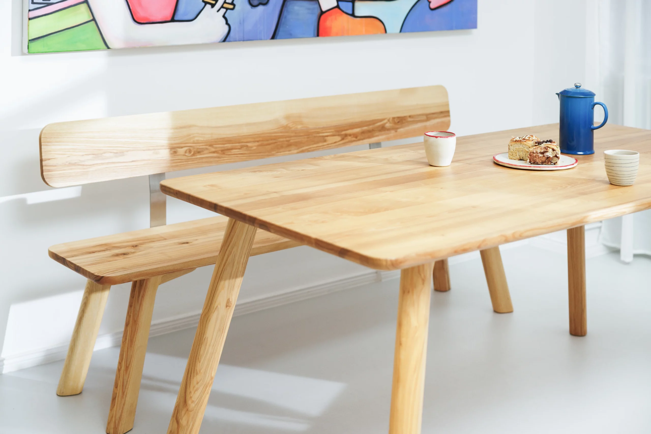 Der Esstisch Form A wird aus massivem zertifiziertem Massivholz in einer Holzart deiner Wahl gefertigt. Durch die durchgehende Verleimung langer Holzstücke kommt die Maserung der Edelhölzer besonders gut zur Geltung. Die zargenlose Tischplatte wird auf der Unterseite mit Gratleisten verstärkt, damit sie sich nicht verzieht und schön gerade bleibt.