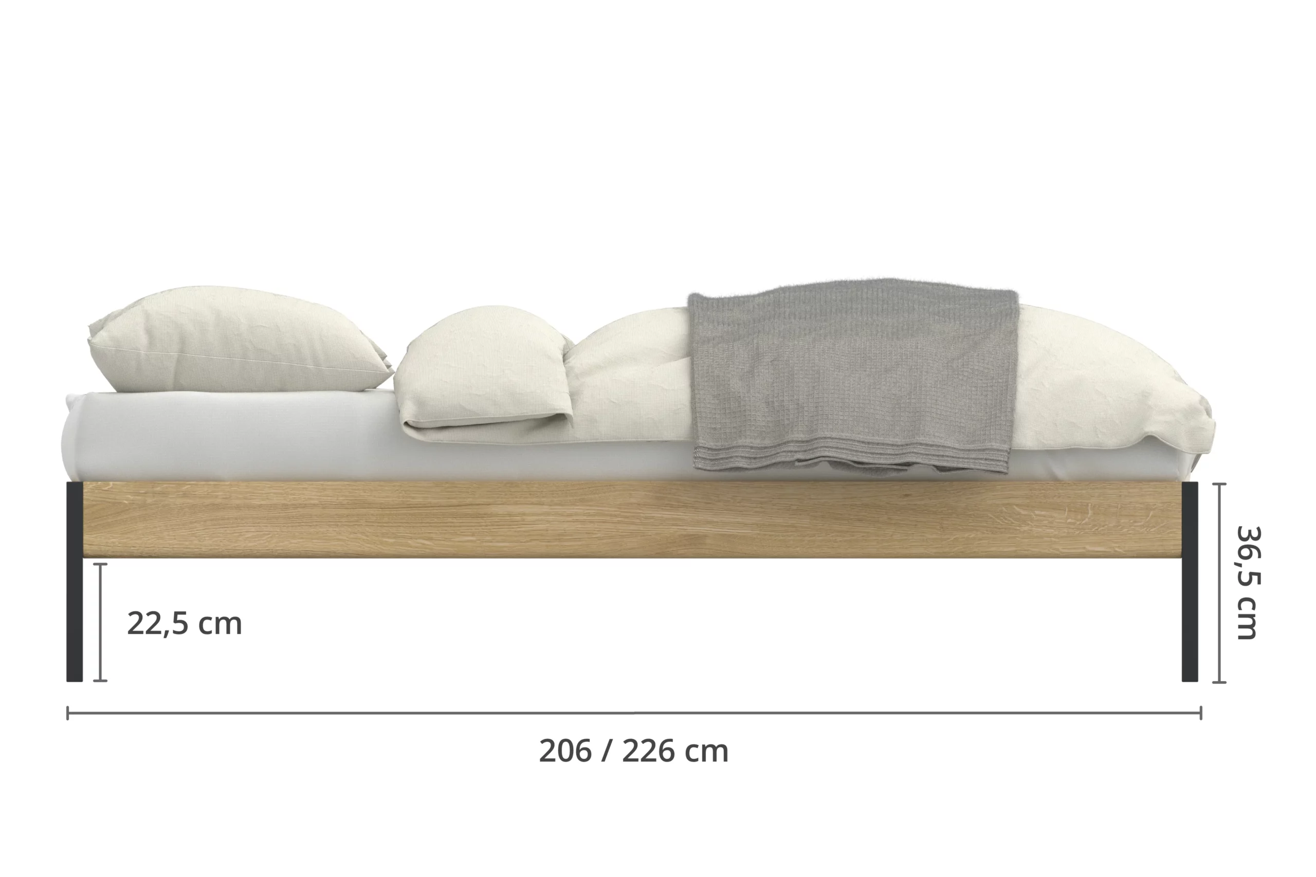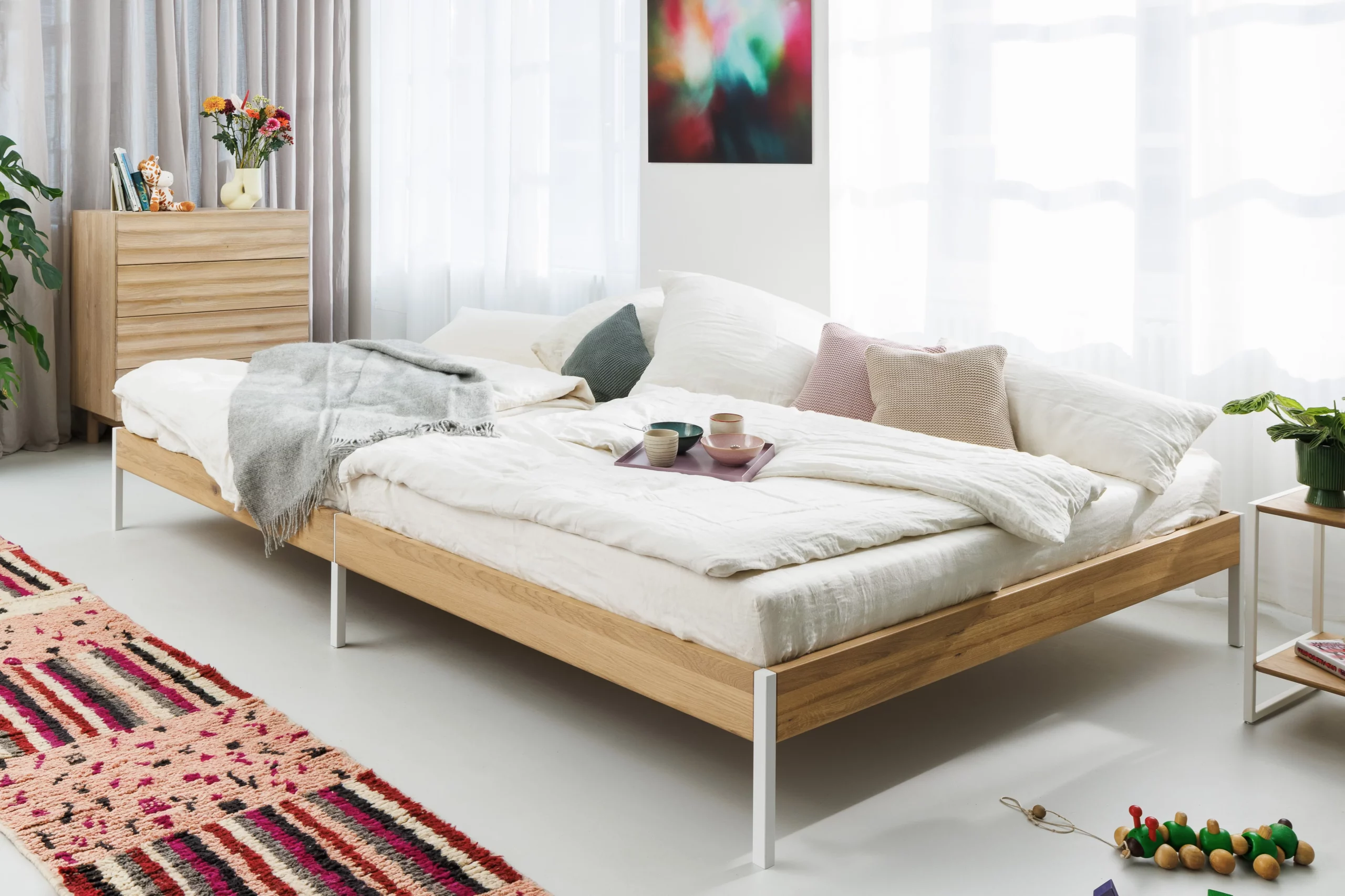 Das Familienbett basiert auf der bewährten Luna Bett-Konstruktion und ist dank stabiler Beine aus weiß oder schwarz beschichtetem Stahl in Kombination mit edlem Eichenholz sehr schlicht. Die Matratze liegt bei diesem Plattformbett direkt oben auf, so dass es nicht wuchtig erscheint und es trotzdem eine angenehme Komforthöhe erreicht. Der Holzrahmen wird an der Unterkante weich abgerundet.