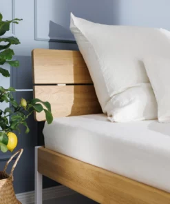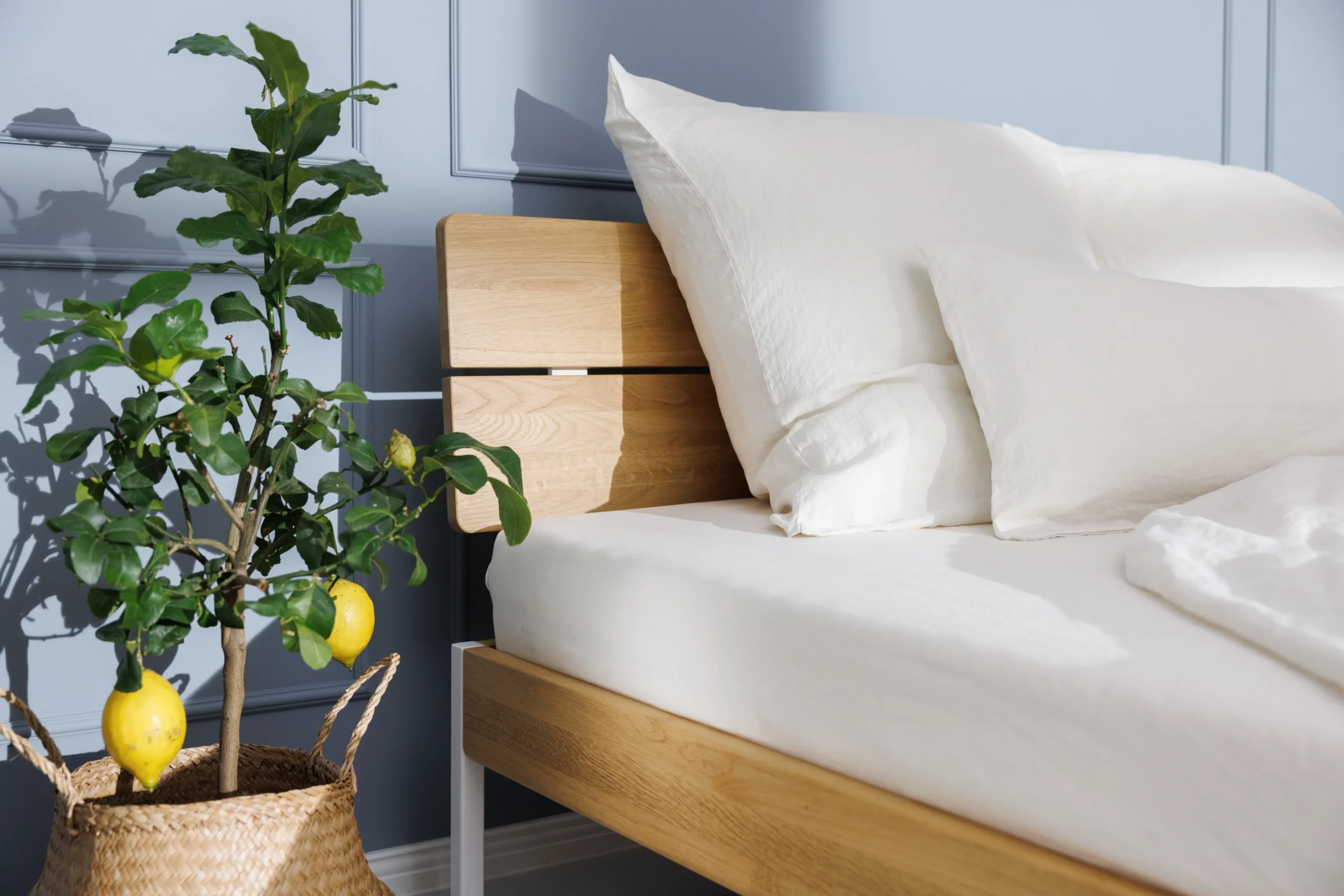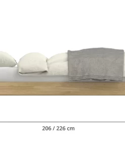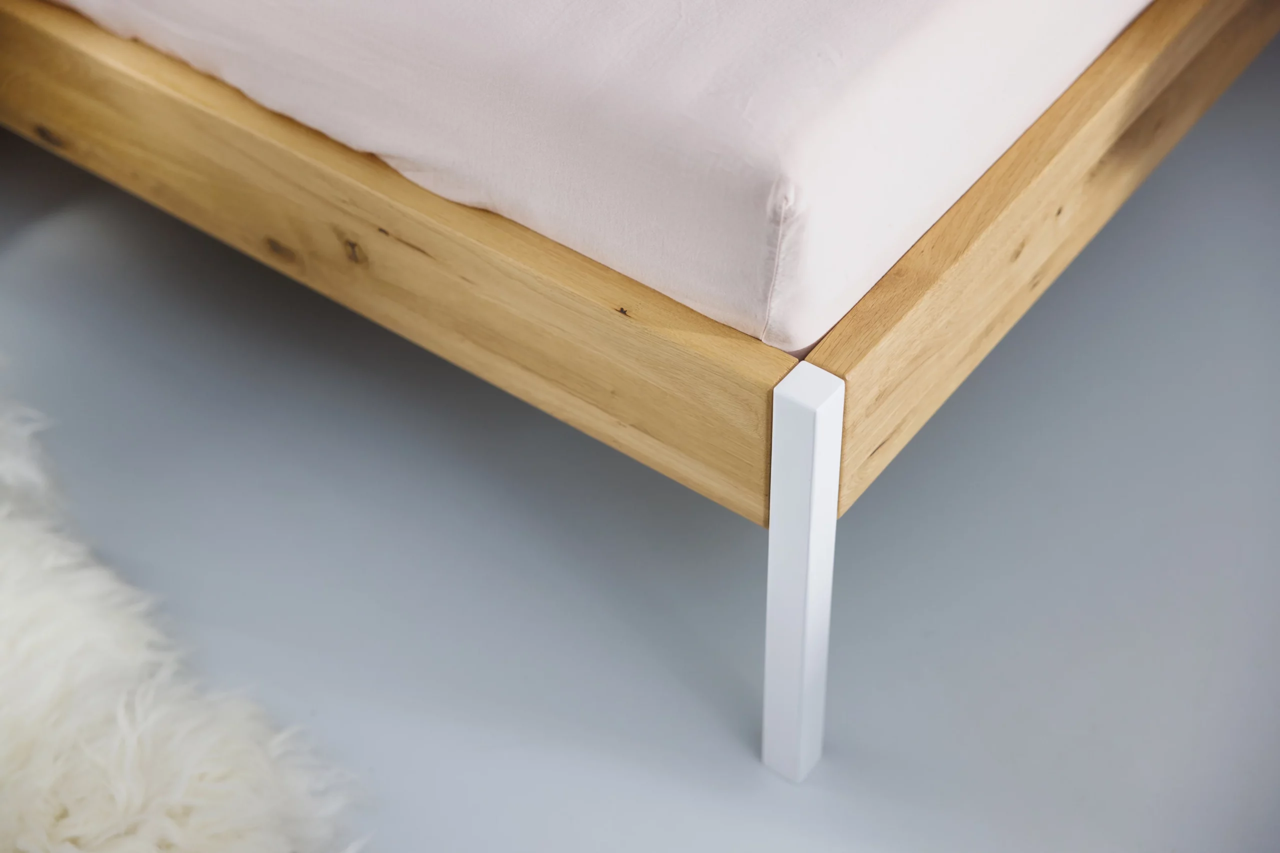 Der Bettrahmen wird aus massiver, sorgfältig selektierter Eiche gefertigt. Die Oberfläche wird mit einem ökologischen, leicht weiß-pigmentierten Möbelöl behandelt, so dass es resistent gegen Verschmutzung wird und das Holz trotzdem weiter „atmen” kann.