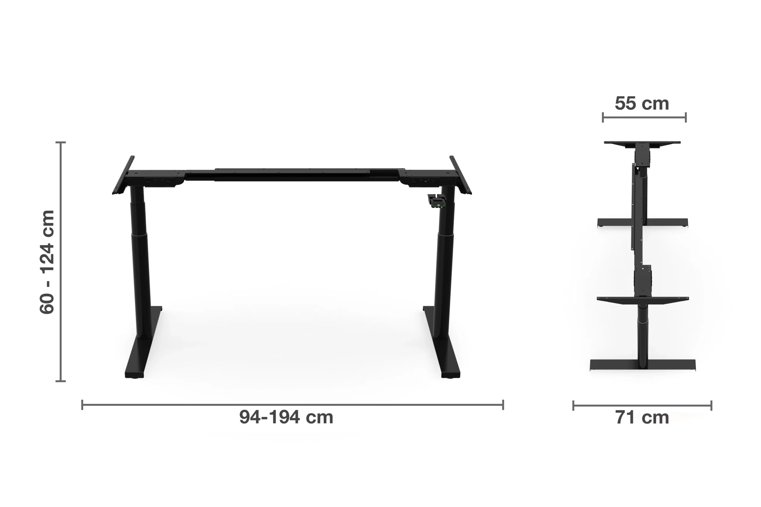 Levi ist aus stabilem Stahl gefertigt und kann ein Gewicht von 120 kg (inklusive Tischplatte) ohne Problem heben. Du kannst Tischplatten aller Art, aus beispielsweise Massivholz oder Spanplatten, von 100 bis 220 cm Breite verwenden. Die Höhe lässt sich von 60 – 124 cm (plus Stärke der Tischplatte) einstellen. So kann das Tischgestell sowohl für Kinder als auch für große Menschen bis 200cm Körpergröße verwendet werden.