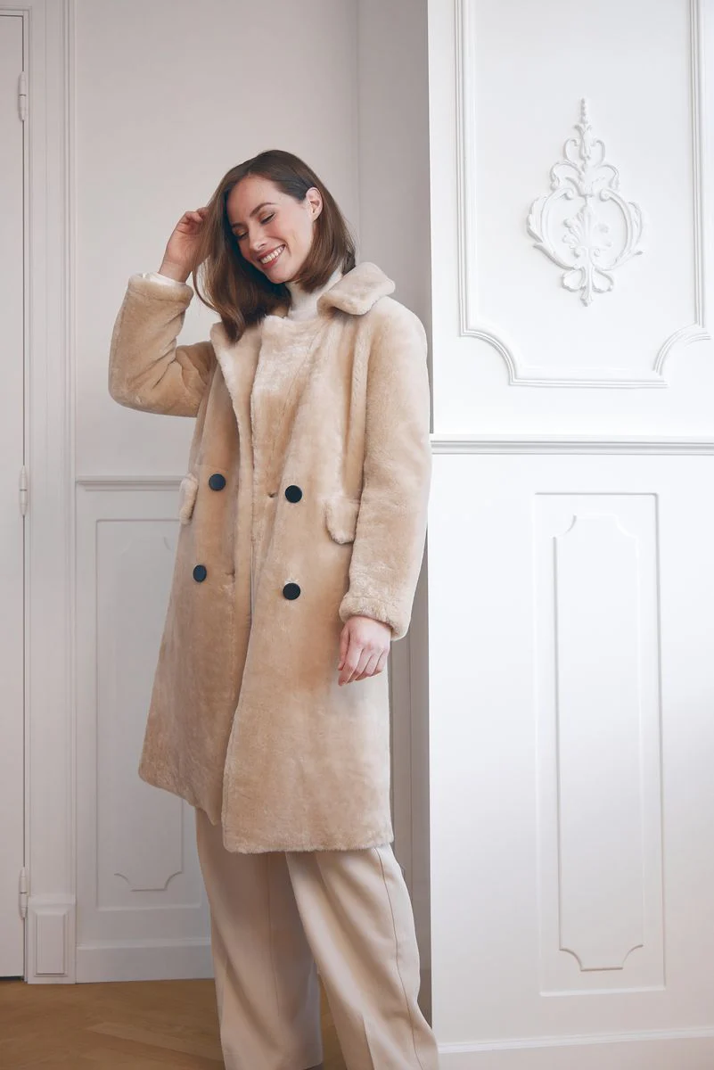 Ivy ist ein weiches Vergnügen. Es ist eine lange Pelzjacke aus doppelseitigem Schafsfell. Doppelseitiges Schaffell ist erstaunlich weich und von sehr hoher Qualität. Man spürt, dass er sowohl innen als auch außen aus Schafsfell besteht, das Sie mit Sicherheit warm und bequem zugleich hält.