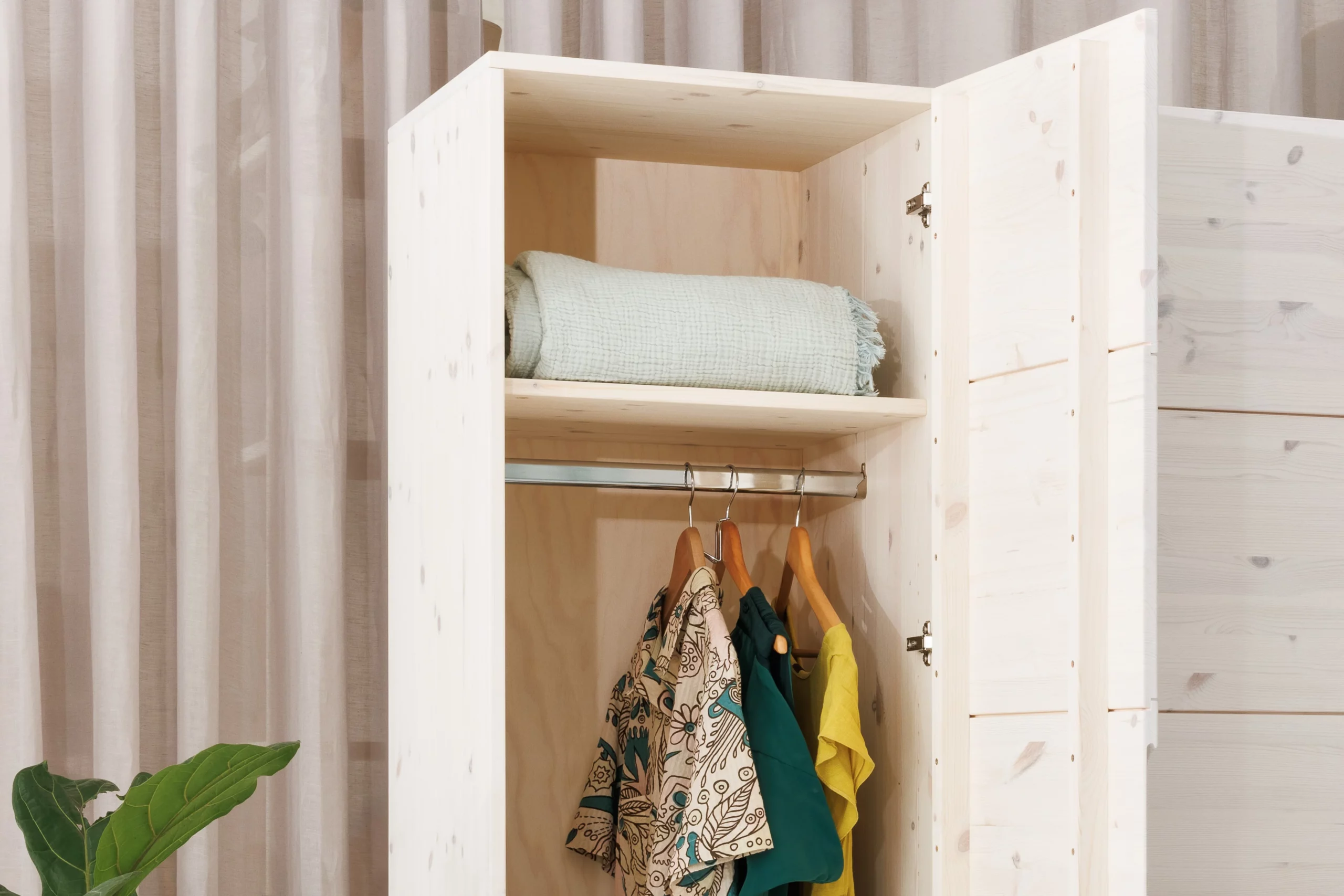Der Kleiderschrank Enorm S hat ein großes Abteil mit Kleiderstange und zwei großen Ablageflächen. Durch die Schublade kannst du deine Kleidung auch im Fußbereich noch komfortabel erreichen. Bei den Schubladen-Führungen und Scharnieren verwenden wir Qualitäts-Komponenten der Firma Haefele, die sich selbstständig lautlos und sanft zuziehen (Soft-Close). Der Kleiderschrank Enorm S ist die perfekte Erweiterung für Enorm M, kann aber auch allein aufgestellt werden.