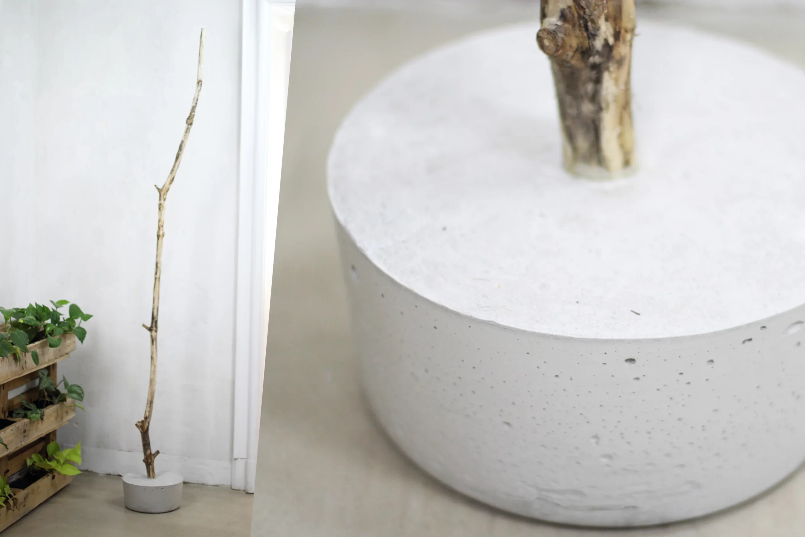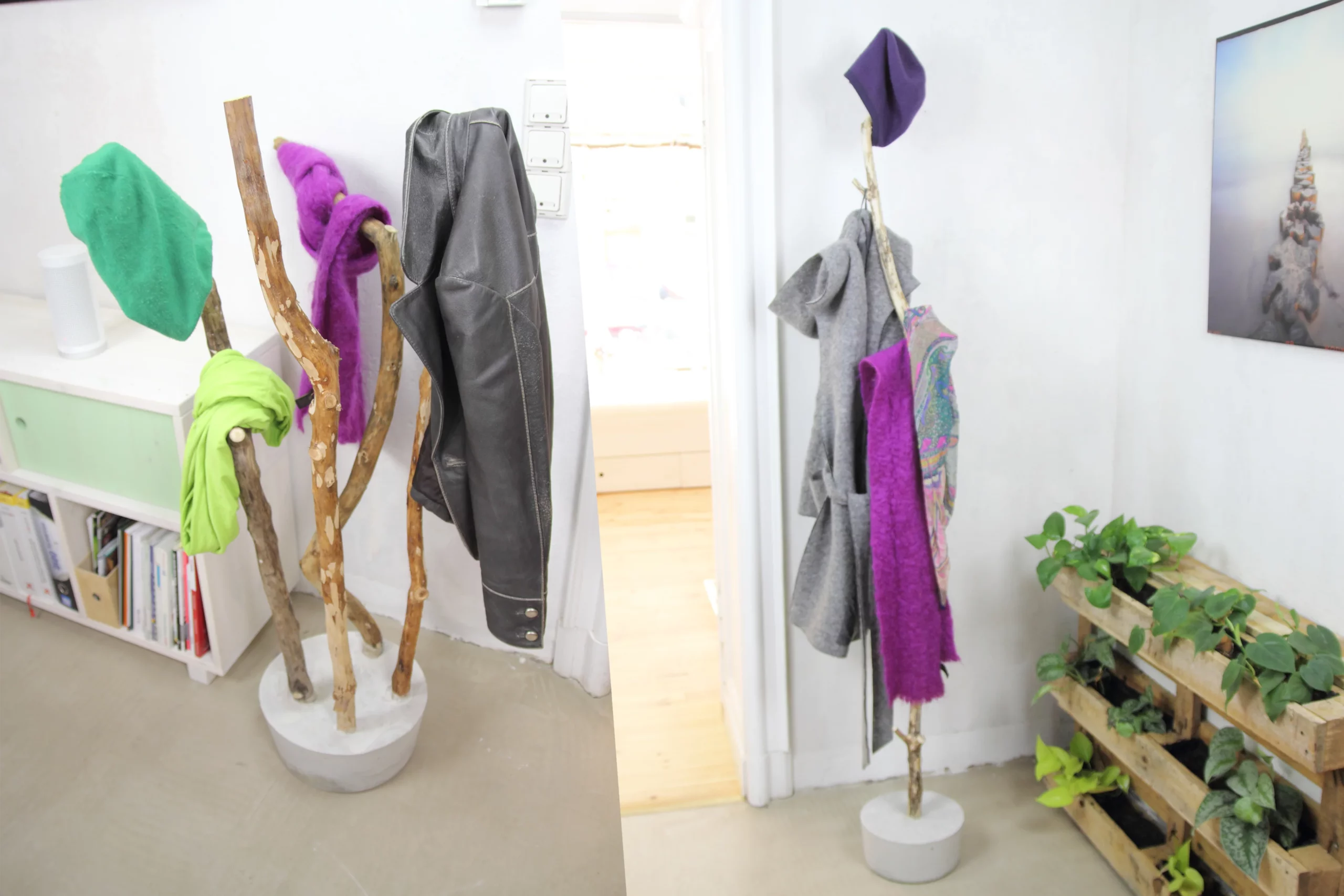 Der Bau des Kleiderständers Walden ist denkbar einfach. Du benötigst nur einen oder mehrere Äste, die gut als Garderobe herhalten und einen Eimer.