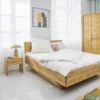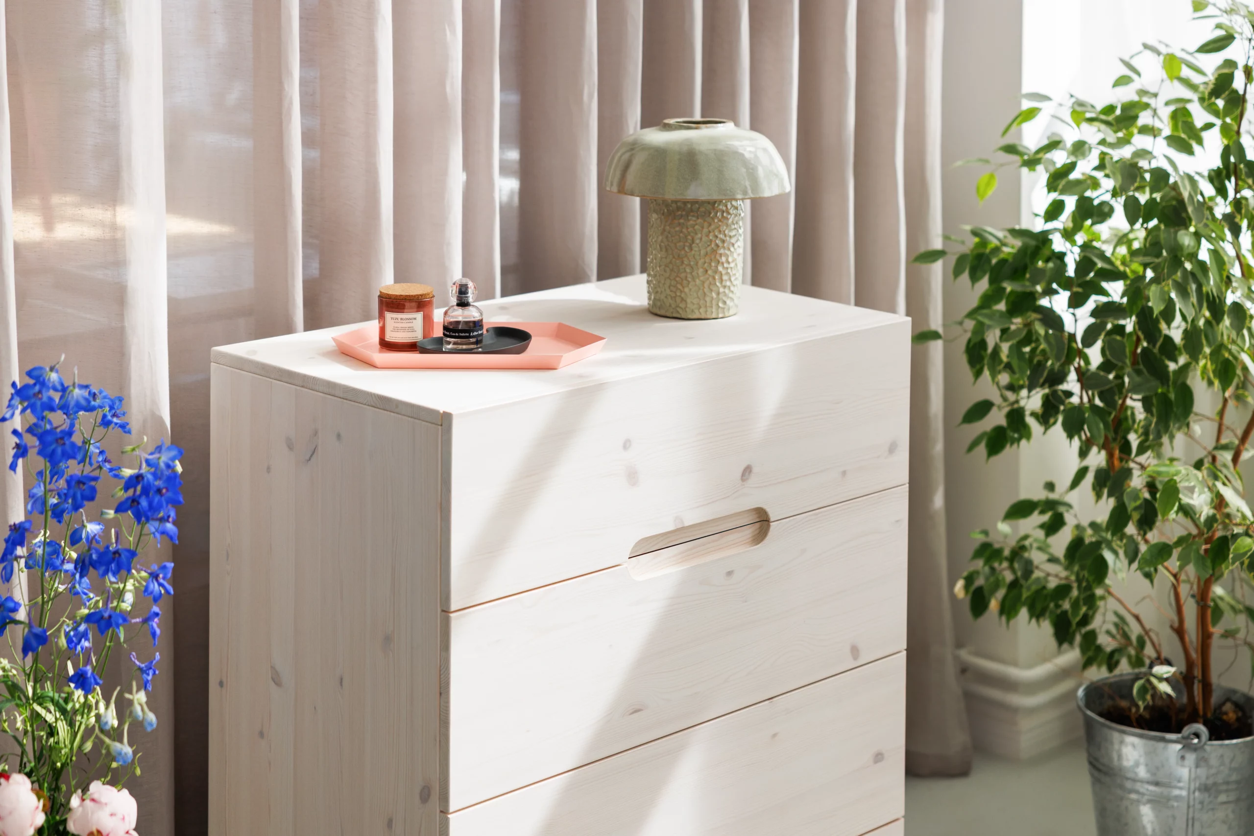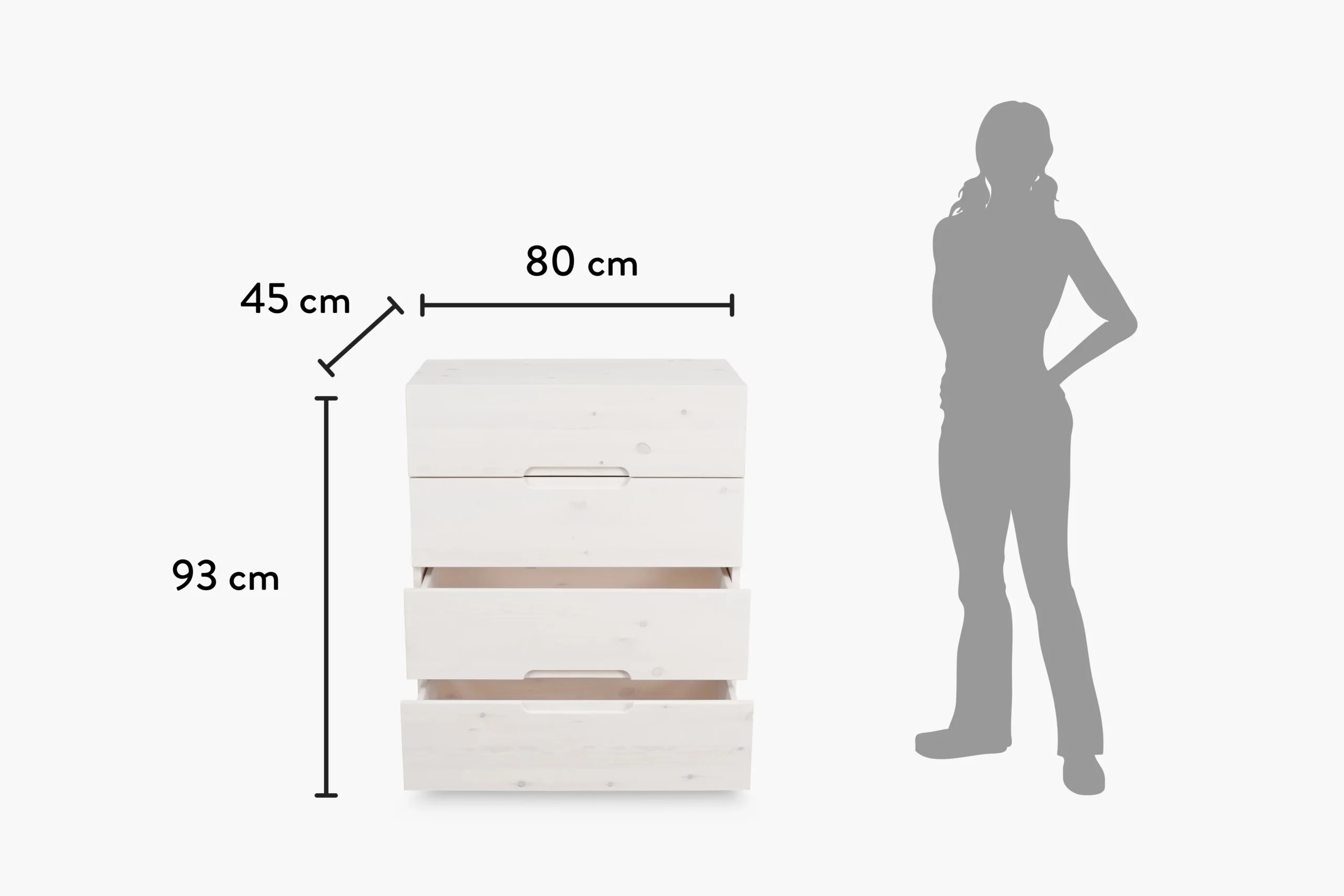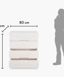 Die Kommode wird aus zertifiziertem massivem Kiefernholz gefertigt und mit einer ökologischen weißen Holzlasur behandelt, bei der die natürliche Maserung des Holzes leicht durchschimmert. Die Griffe werden dezent in das Holz gefräst. Das skandinavisch anmutende Design passt eigentlich in jede Schlafzimmer Umgebung, besonders gut aber zu den weißen ekomia Betten.