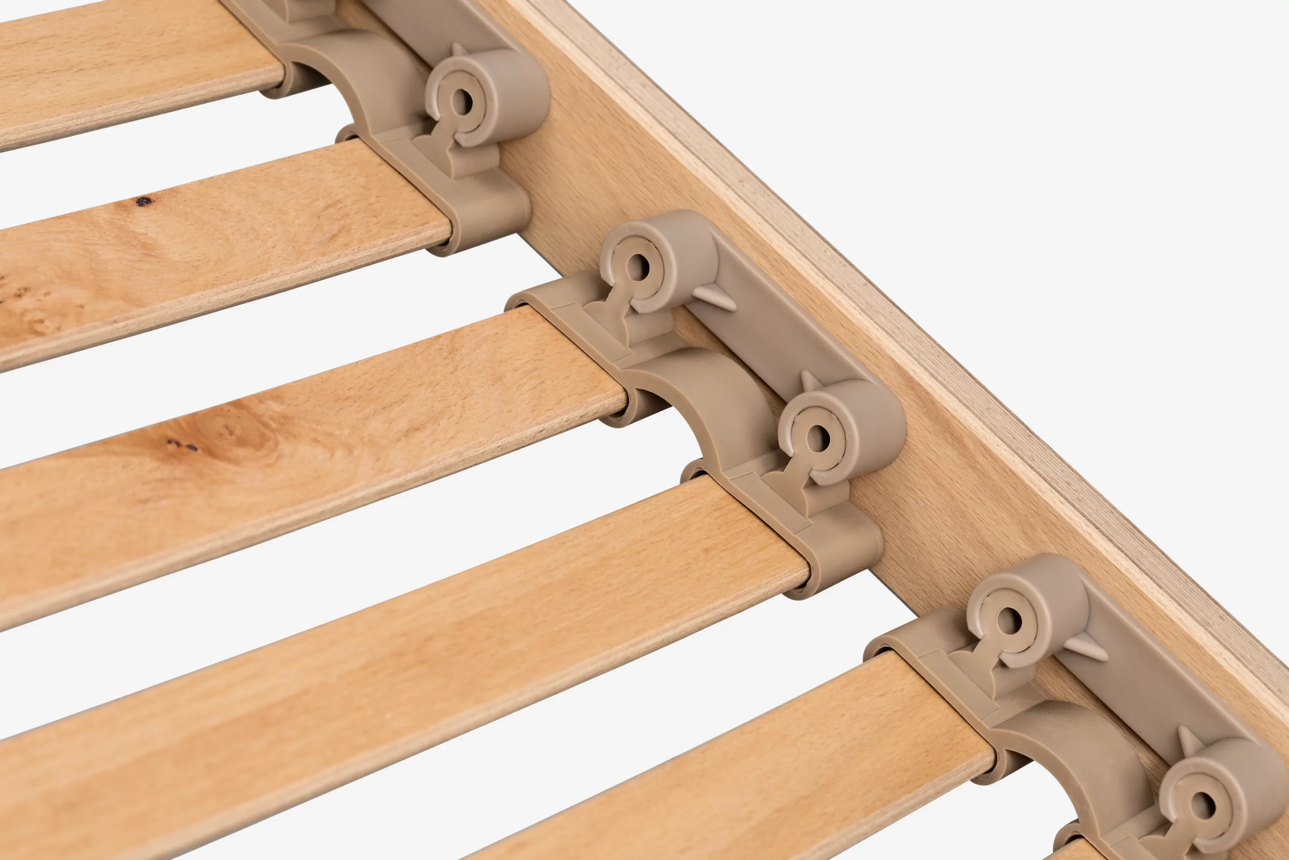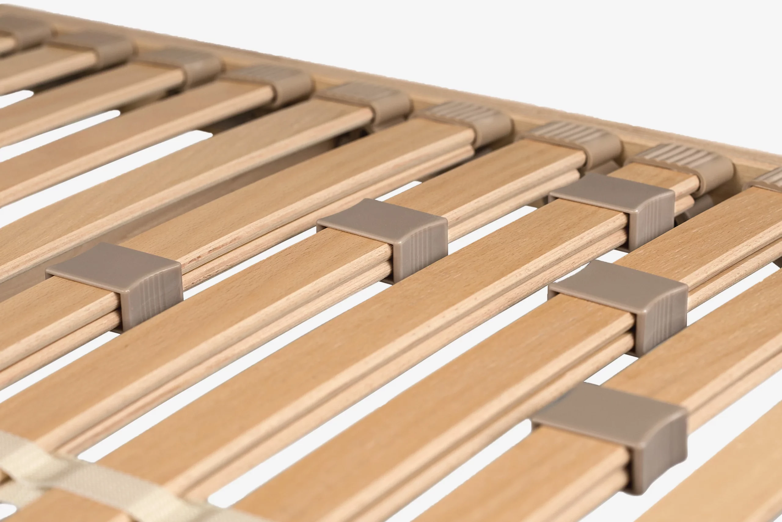 Die Lamellen sind aus 6-fach verleimten Buchenfederholzleisten, die auf Kautschuk-Elementen beweglich gelagert werden. So passen sich die Lamellen deiner Liegeposition individuell an.