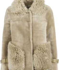 Die Jacke wird mit vier Druckknöpfen geschlossen und hat zwei große Taschen auf der Vorderseite. Die Jacke hat auch eine schöne Schnalle an jedem Ärmel, um den Ärmel noch enger zu machen. Die beiden Taschen sind mit einem langen Schaffell aus Wolle verziert, das zu dem großen und schönen Kragen passt.