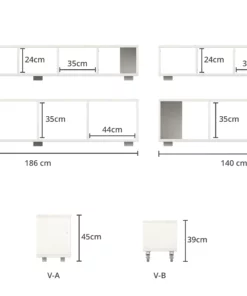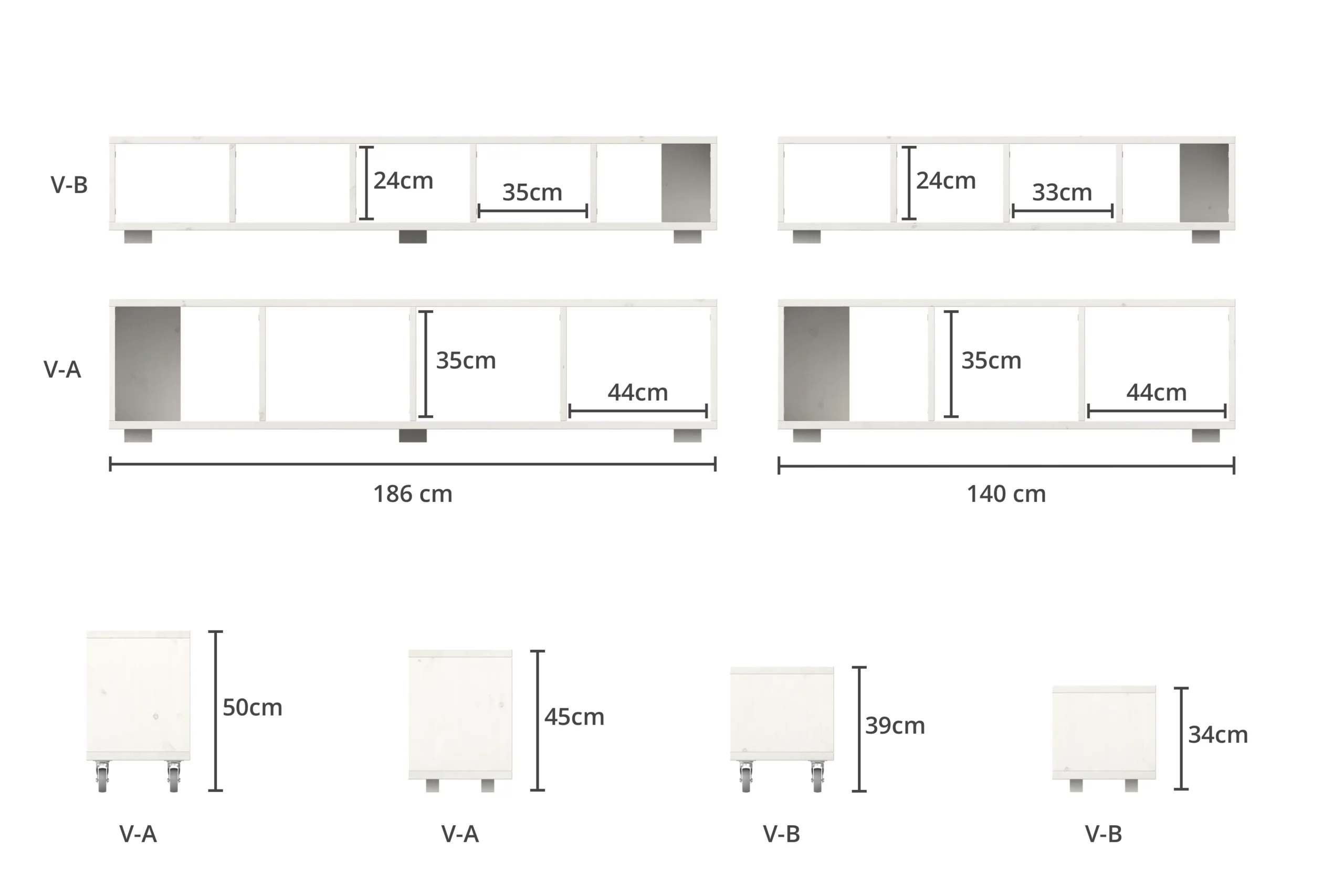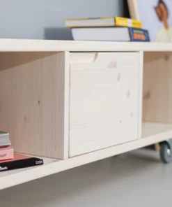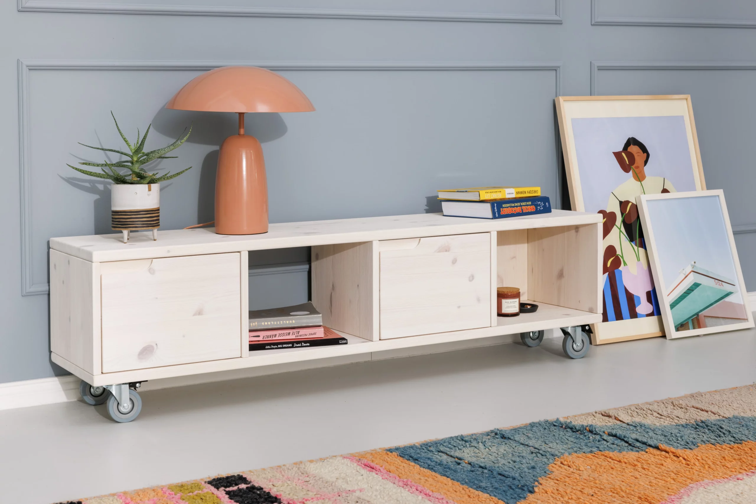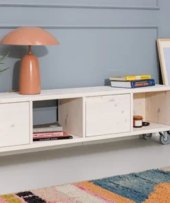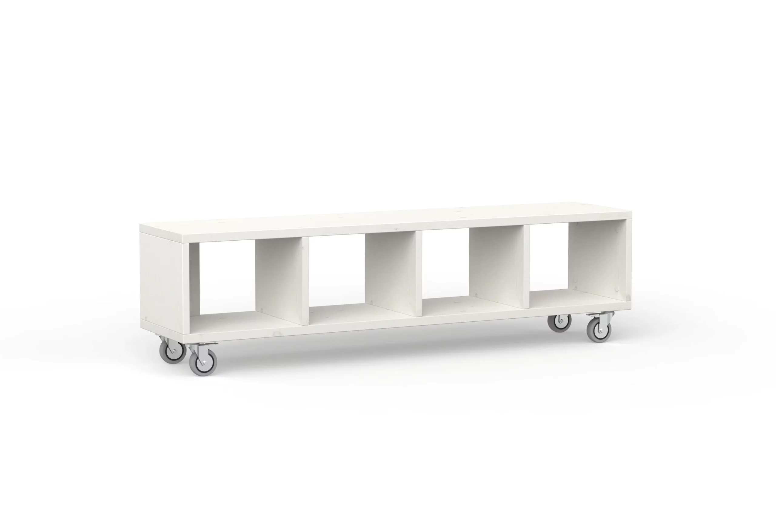 Du kannst das Lowboard in zwei Breiten und mit Rollen oder Füßen bestellen. Die Rollen sind feststellbar. Die Variante A eignet sich als Stauraum für Ordner, Bildbände, Schallplatten oder Kisten. Die Variante B eignet sich für Bücher und dergleichen. Die Variante A mit Rollen hat auch ein gute Höhe zum Sitzen.