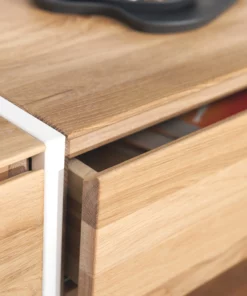 In die schönen Fronten aus handverlesener Eiche sind dezente, weich gerundete Griffe eingefräst. Die Schubladen schließen sanft mit Soft-Close Funktion.