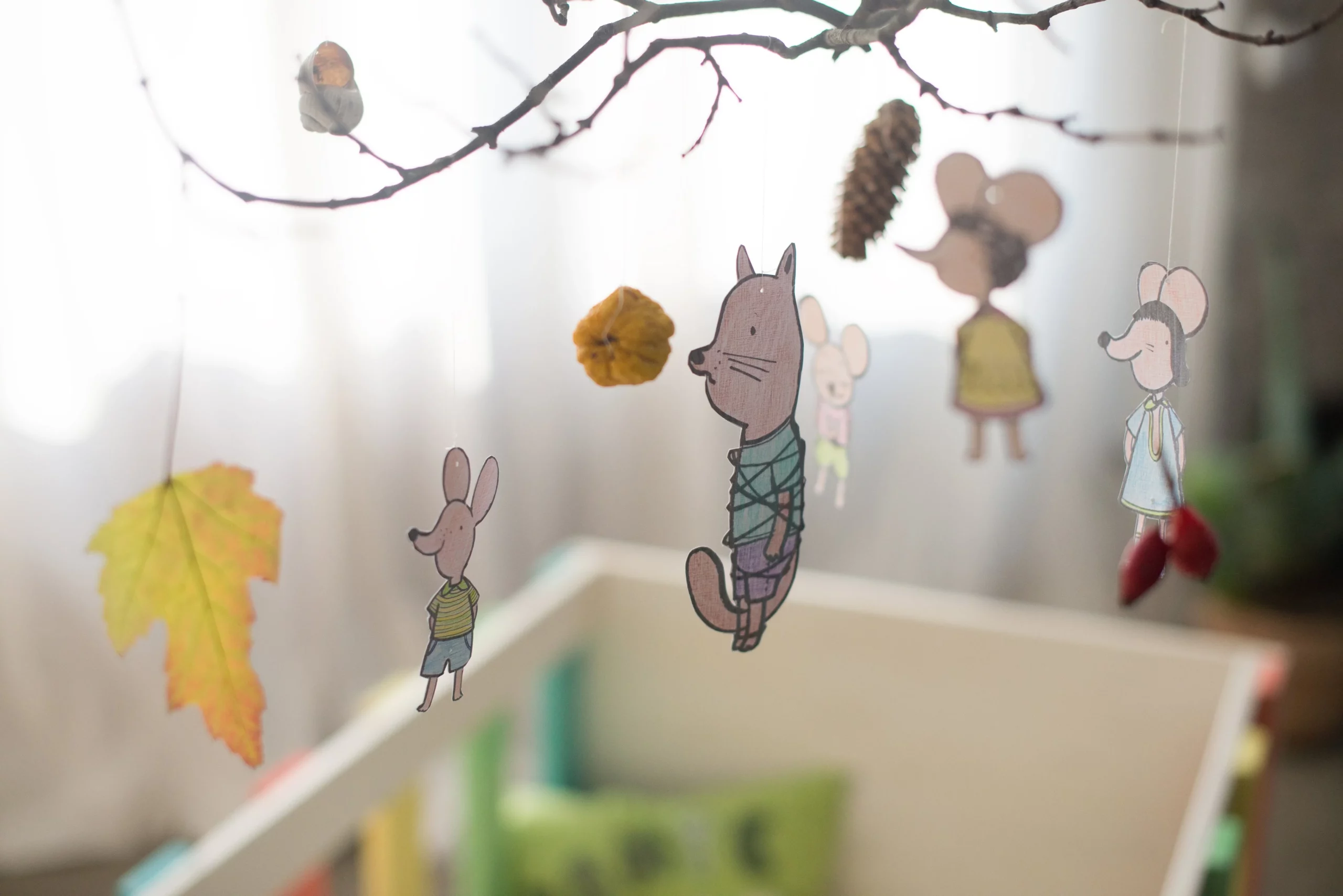 Die Figuren wurden von unserer Lieblings-Kinderbuchautorin Sybille Hein gezeichnet. Du kannst die Figuren einfach ausdrucken, ausschneiden und anmalen. Dann noch einen schönen Ast, Nüsse, Blätter, Tannenzapfen etc im Wald besorgen und dein Mobile ist schon fast fertig.