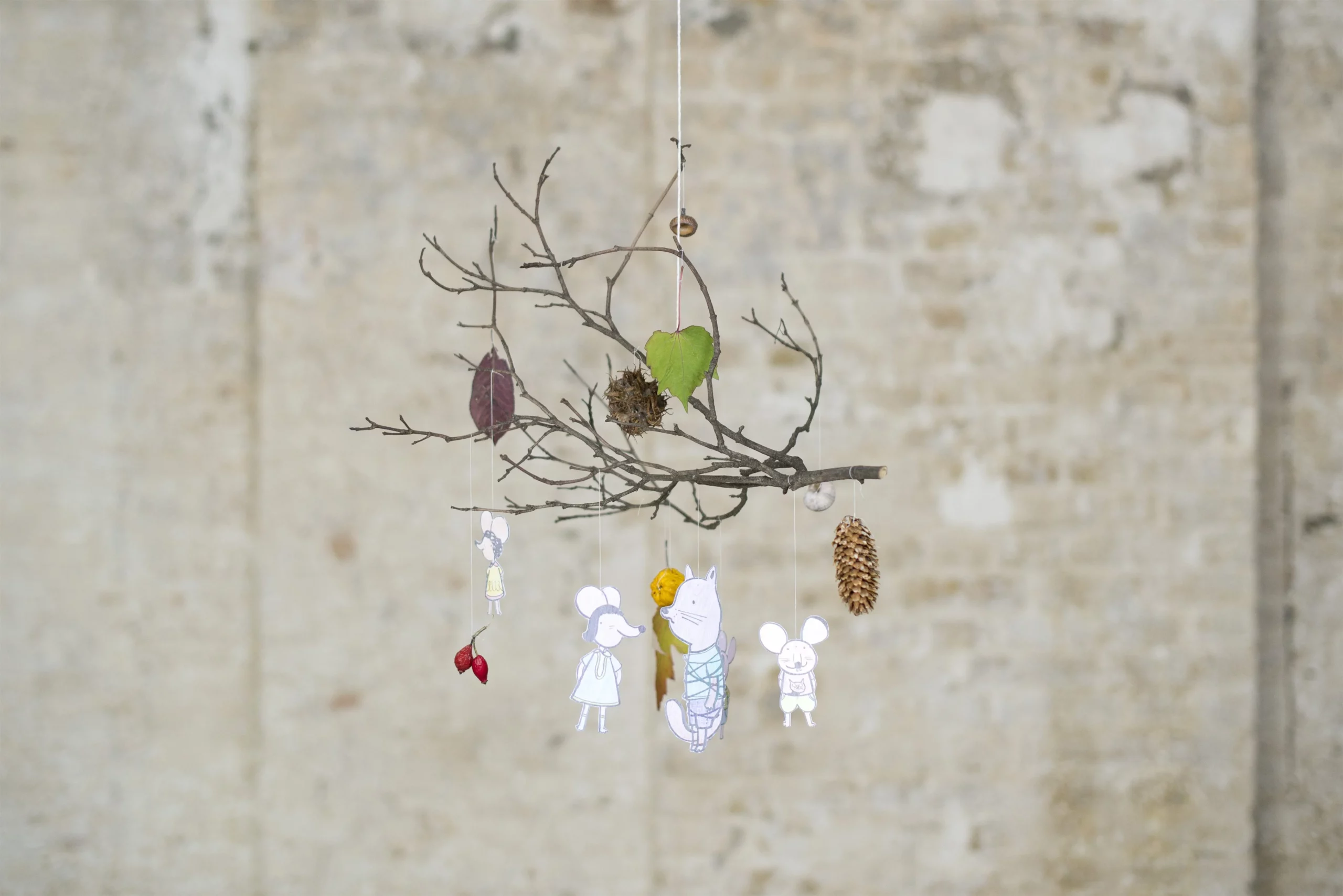 Das zentrale Element des Mobiles sind die Mäuse, die von der Katze gejagt werden (oder ist es doch anders?).