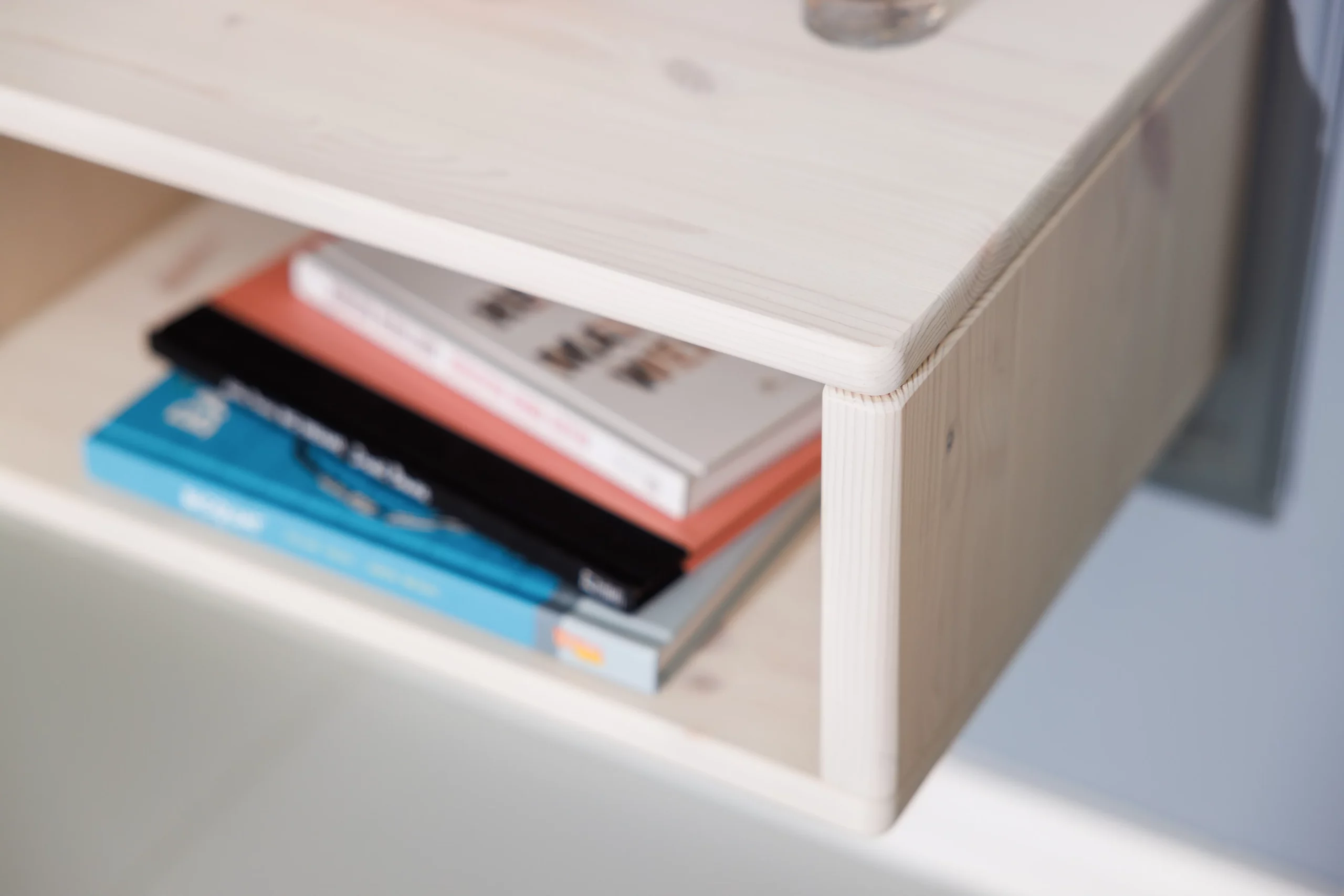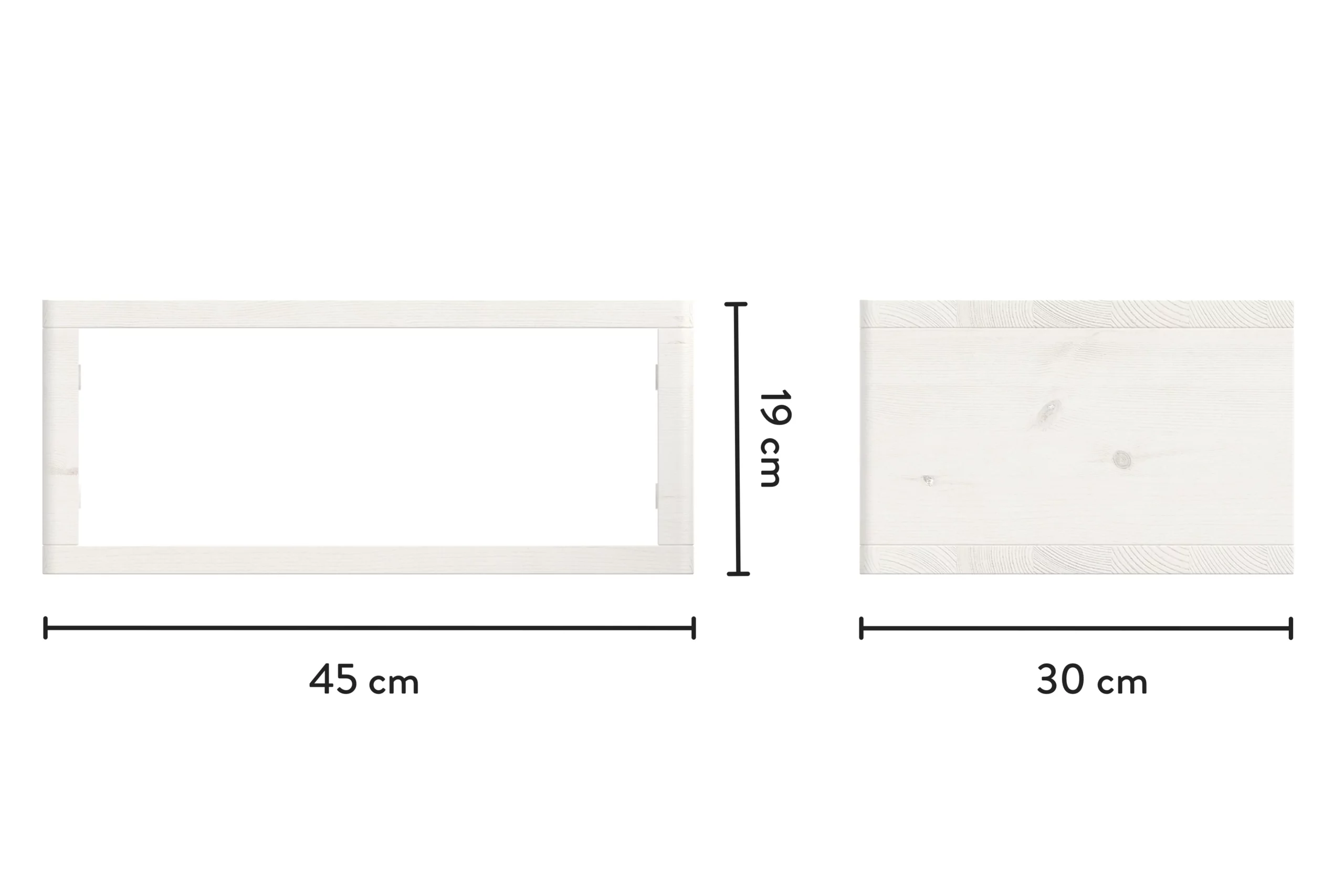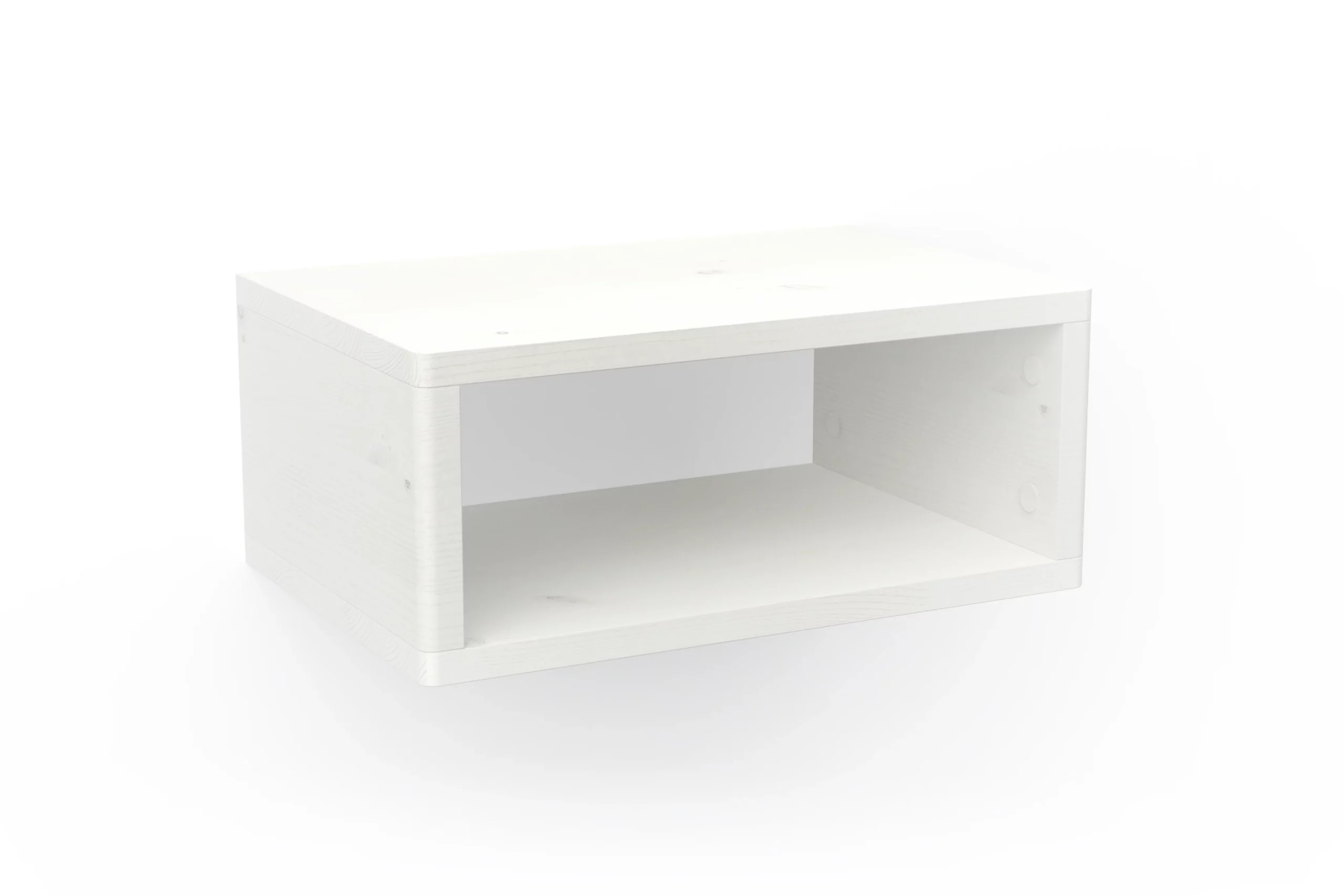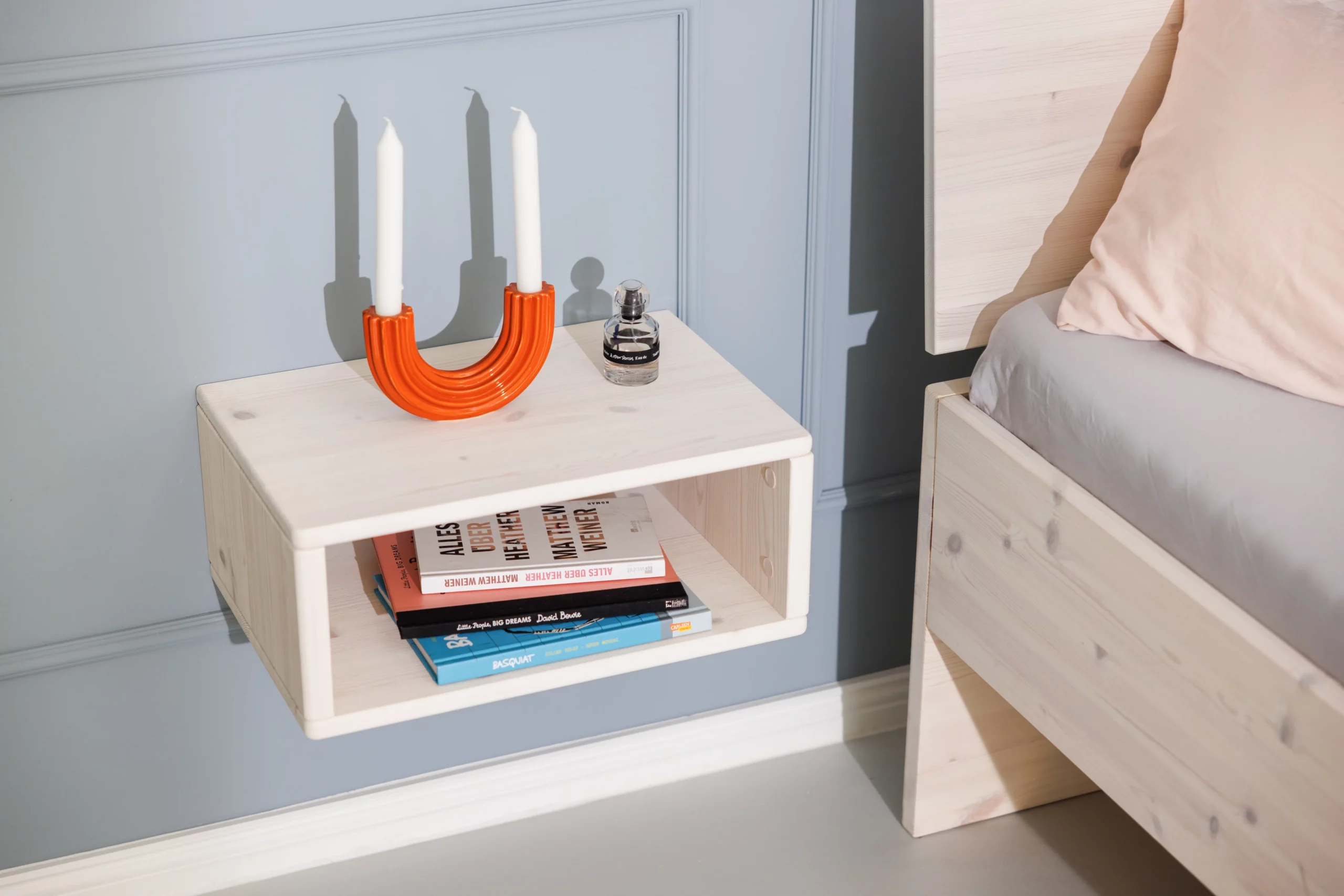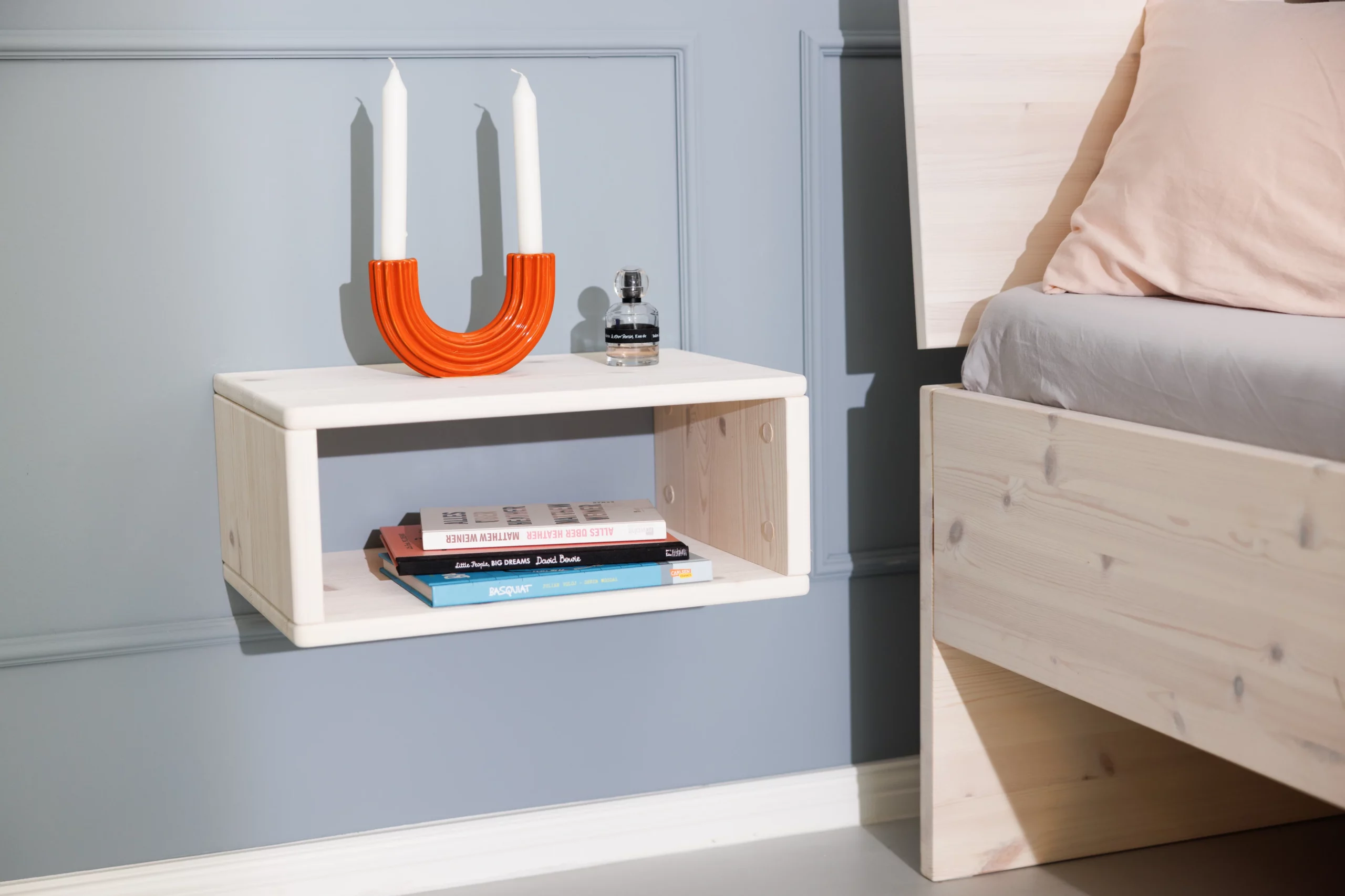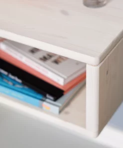 Der minimalistisch gestaltete Nachttisch Swebe wird aus massivem Kiefernholz gefertigt und mit einer ökologischen weißen Lasur behandelt. Er ist schnell montiert und wird einfach an zwei Schrauben oder Haken an der Wand befestigt. So kannst du den Nachtisch passend zur Höhe deines Bettes montieren. Durch die Wandmontage steht er auch Bettkästen nicht im Weg.