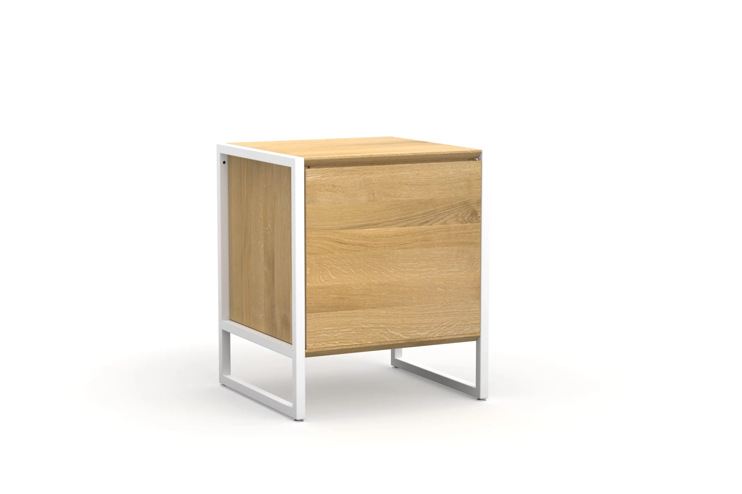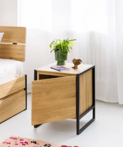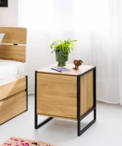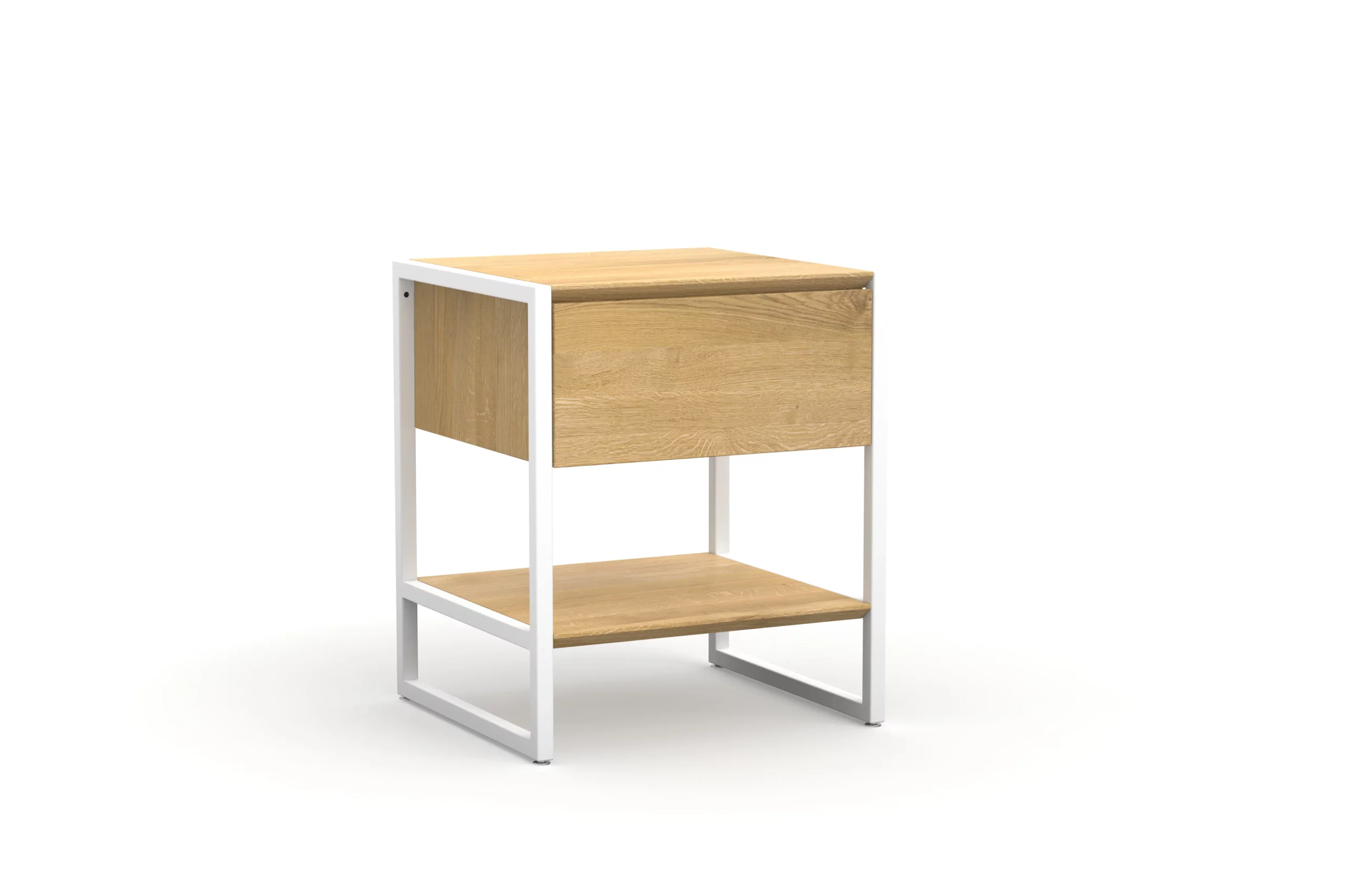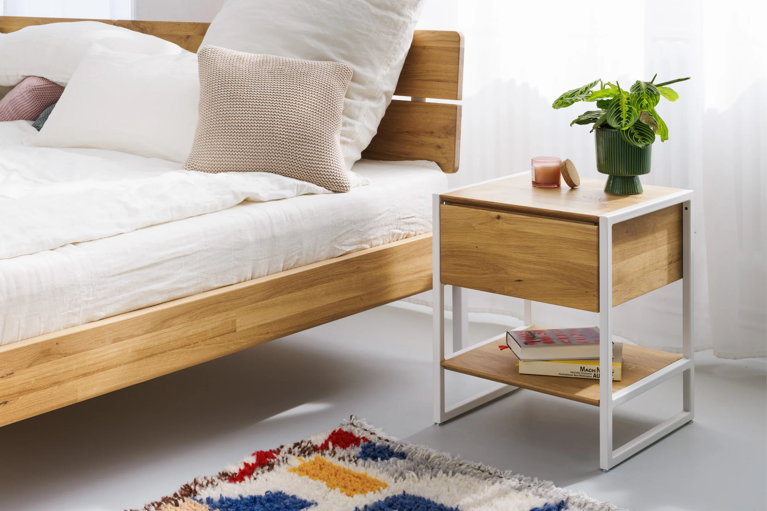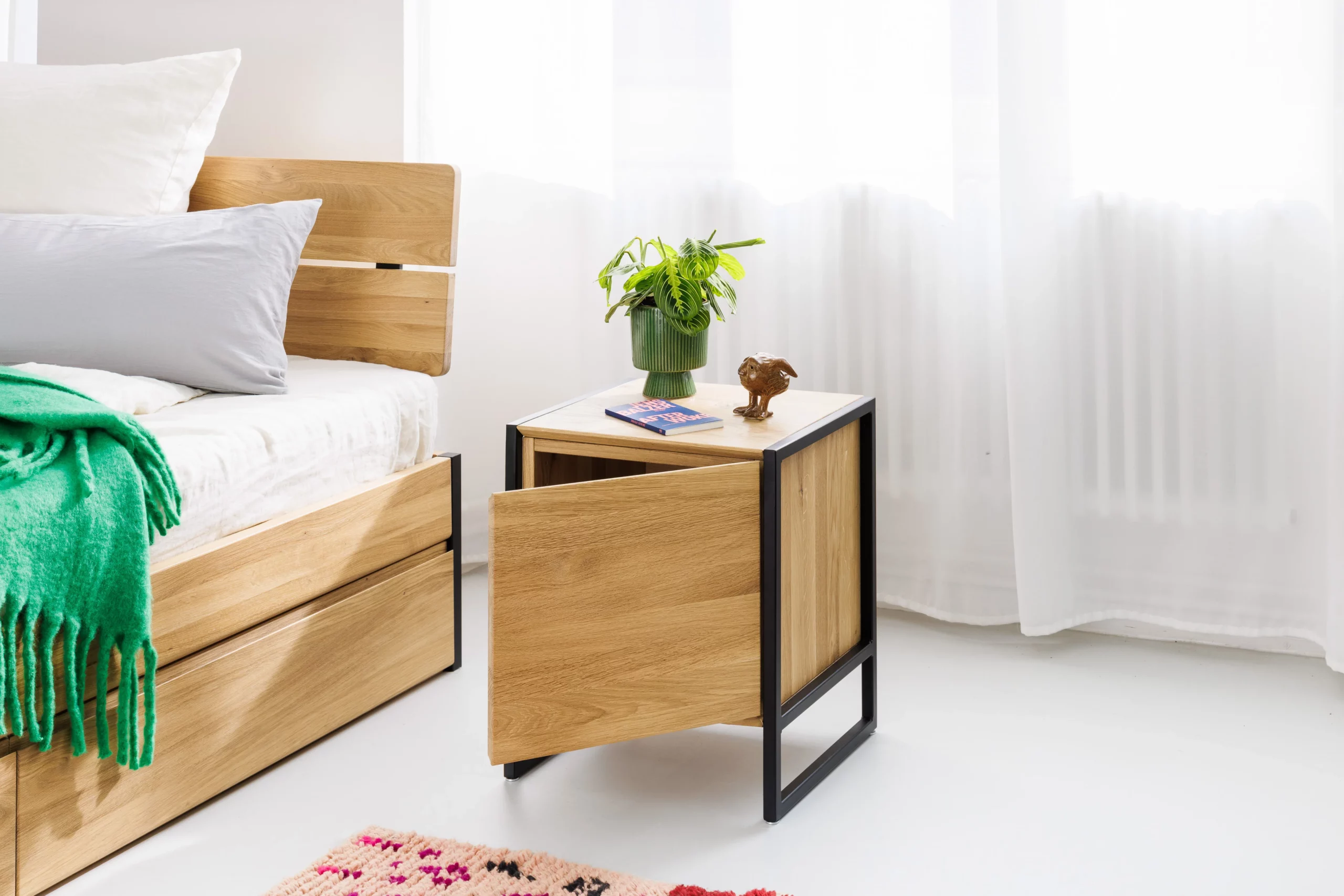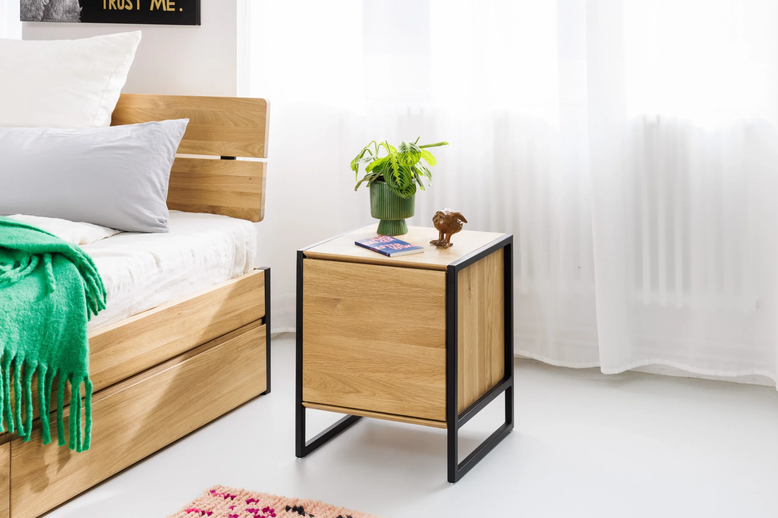 Durch den schlanken Rahmen und Bretter mit schmal gefrästen Kanten kommt der Wega Nachttisch sehr stilvoll daher. Dank des Rahmens aus pulverbeschichtetem Stahl benötigt der Nachttisch weniger Material und ist trotzdem äußerst stabil. Dezente verstellbare Füße gleichen Unebenheiten im Boden aus.