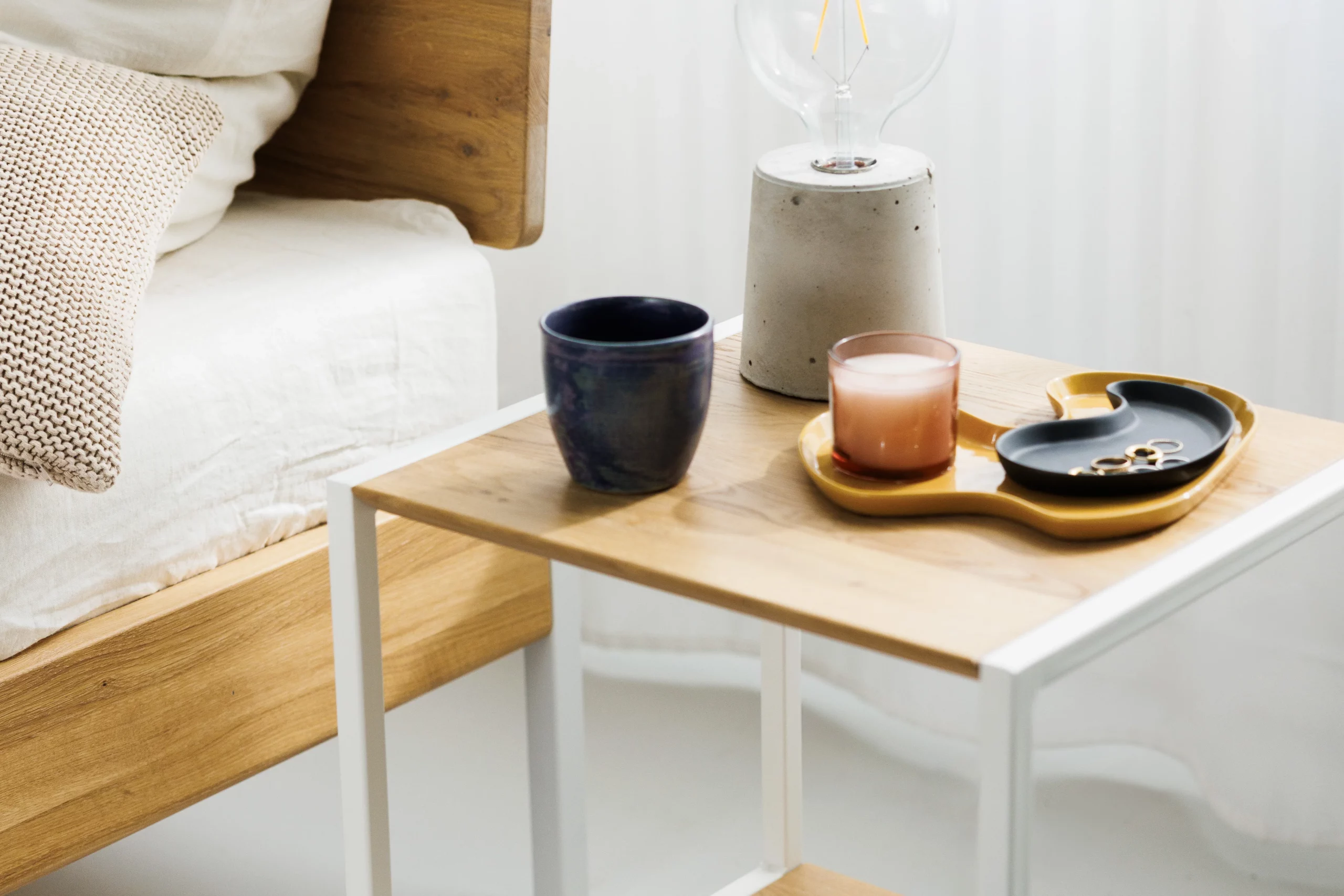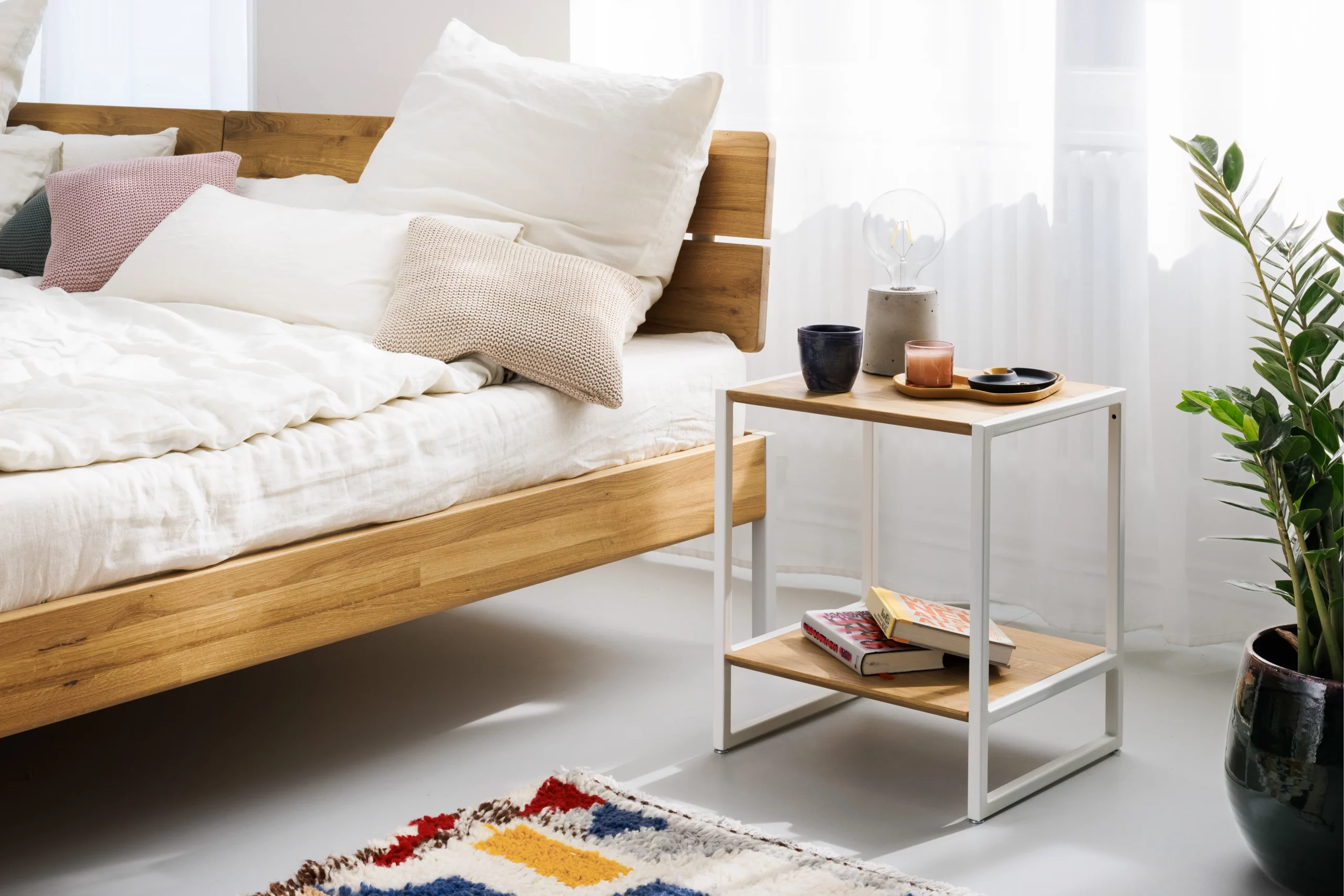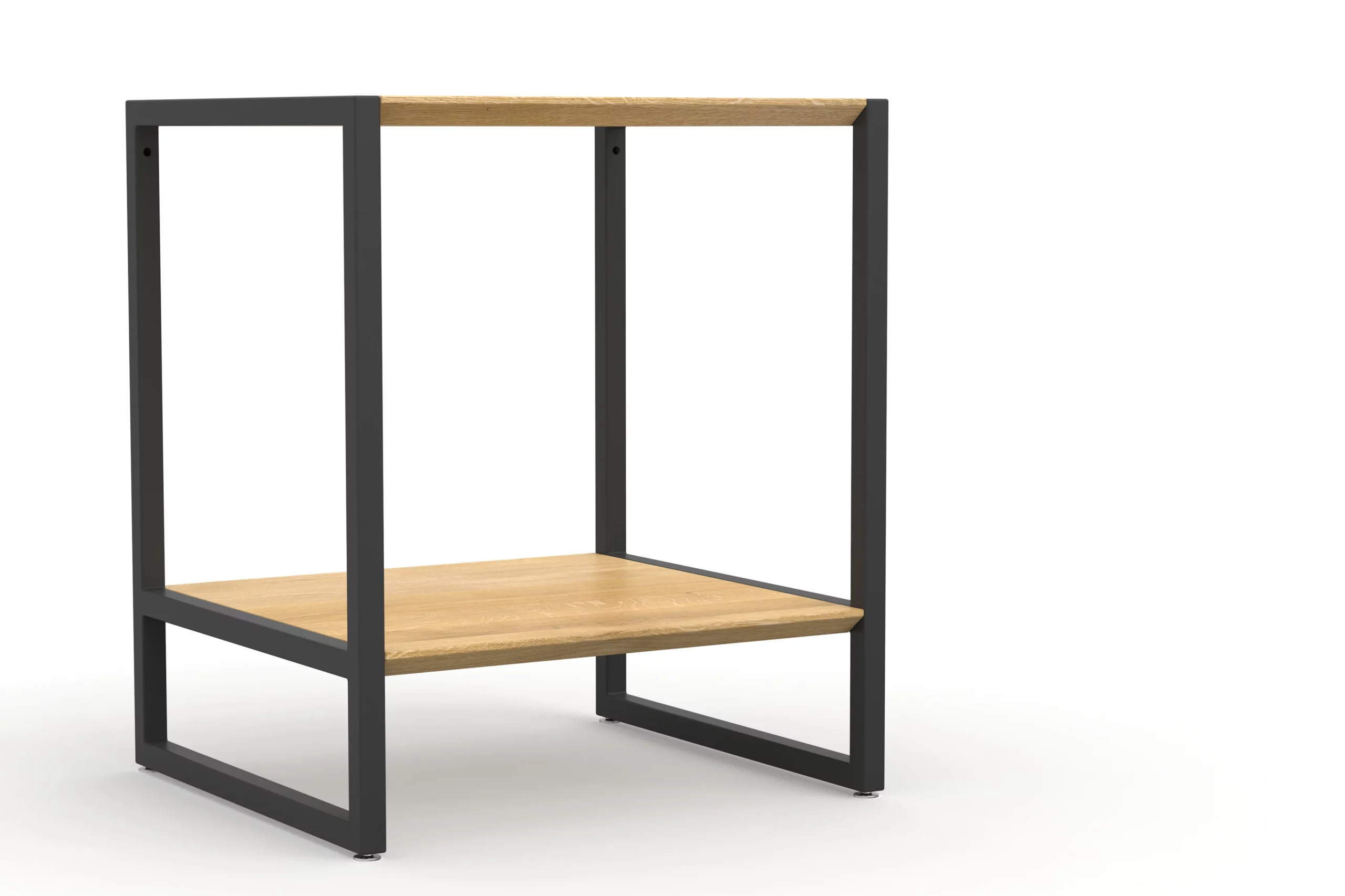 Durch den schlanken Rahmen und Bretter mit schmal gefrästen Kanten kommt der Wega Nachttisch sehr stilvoll daher. Dank des Rahmens aus pulverbeschichtetem Stahl benötigt der Nachttisch weniger Material und ist trotzdem äußerst stabil. Dezente verstellbare Füße gleichen Unebenheiten im Boden aus.