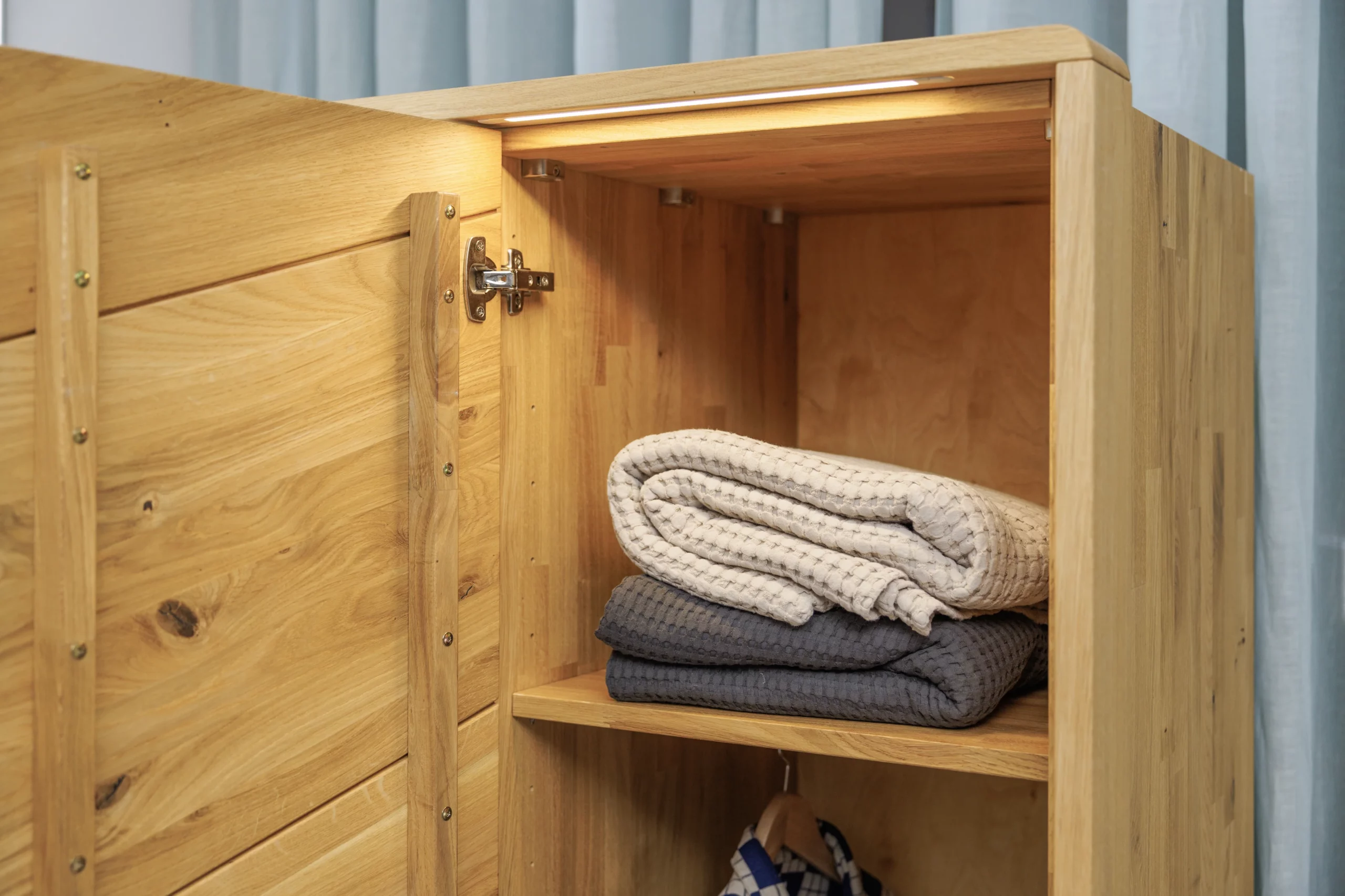Passepartout für den Kleiderschrank Prenzlauer Berg mit im Holz eingelassener LED-Leiste. LED-Leiste wird über einen Fußschalter bedient.