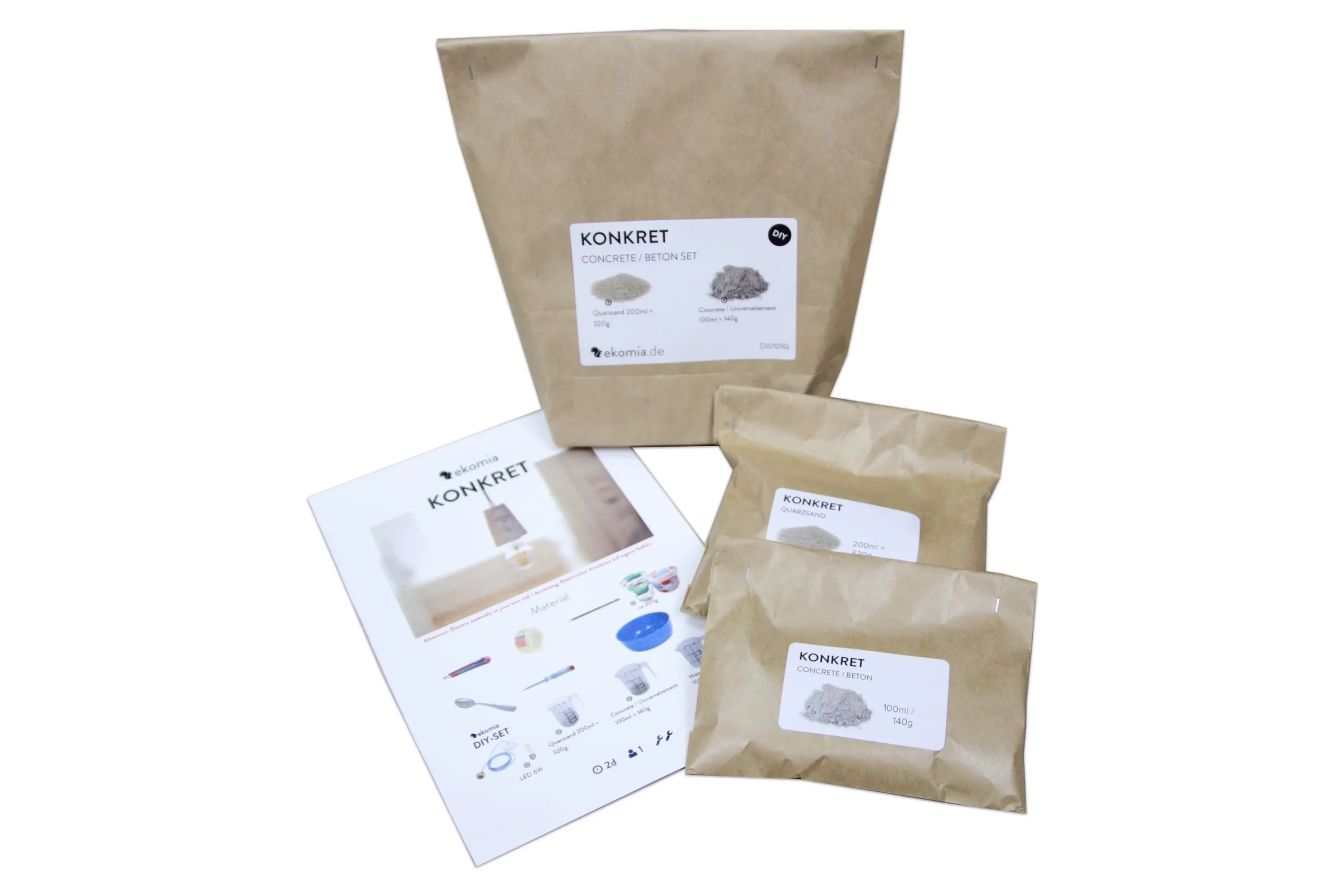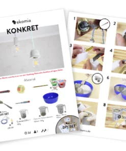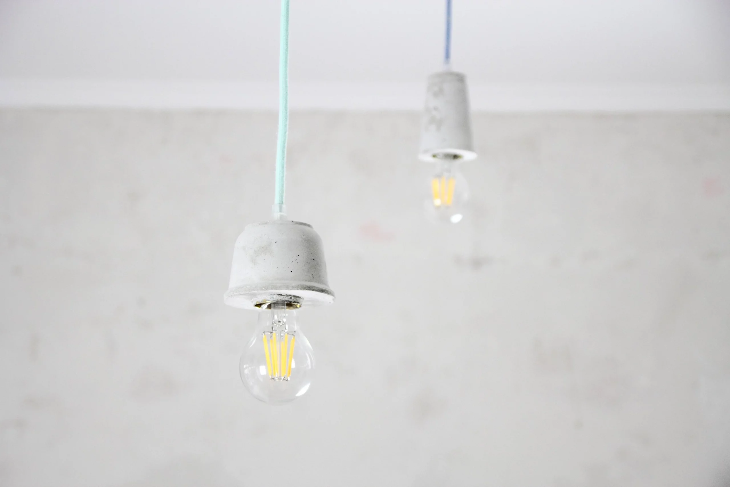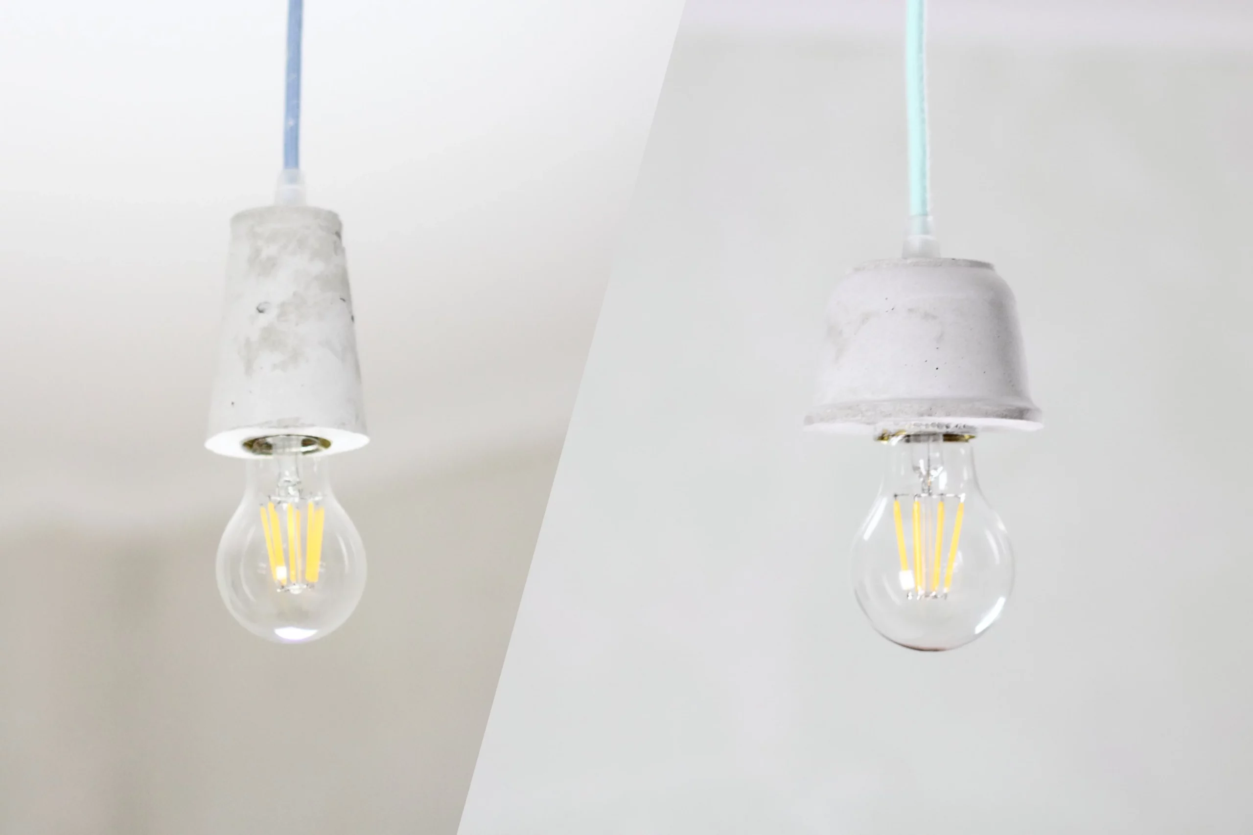 Wir haben vormontierte Pendelleuchten in verschiedenen Farben und ein Beton-Set im Sortiment. Natürlich gehen auch vergleichbare Fassungen und Beton aus dem Baumarkt.