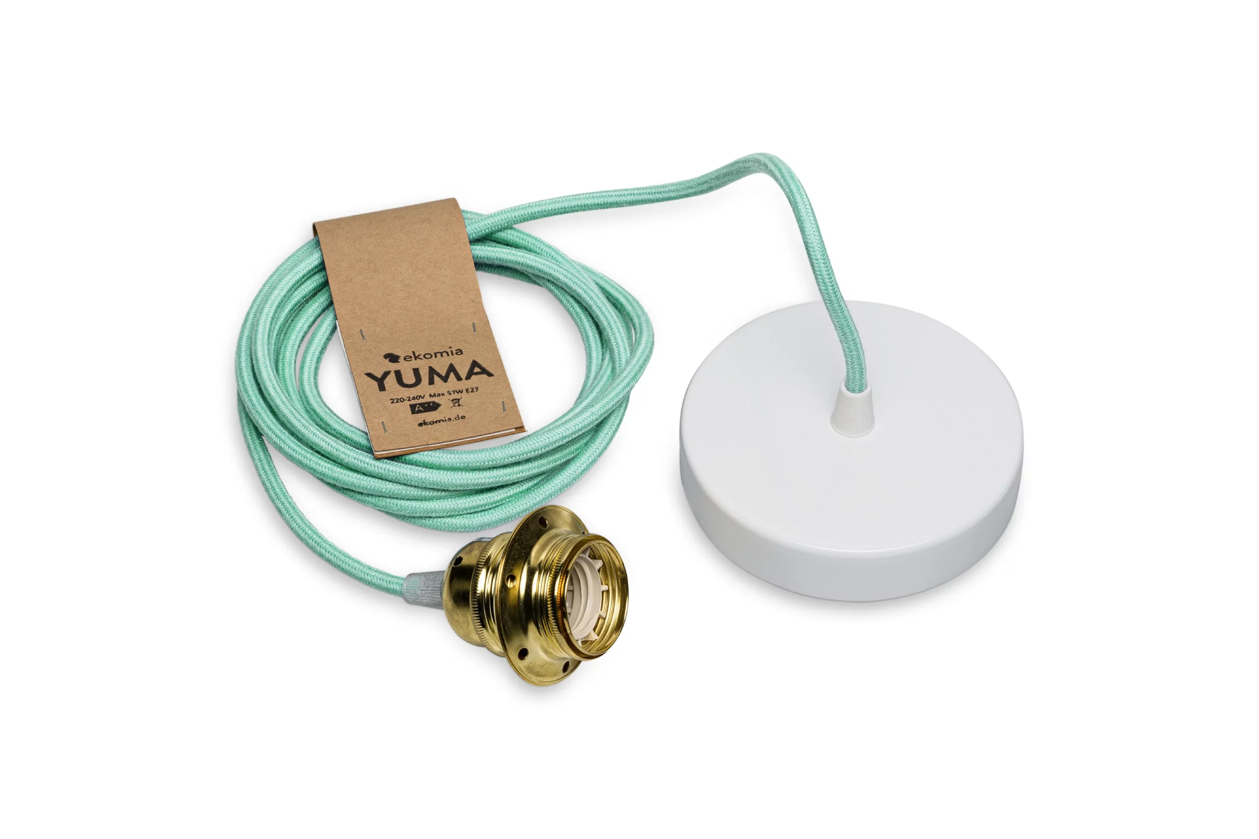 Grüne Pendelleuchte (mint) mit 3 Meter langem Textilkabel aus Baumwolle.