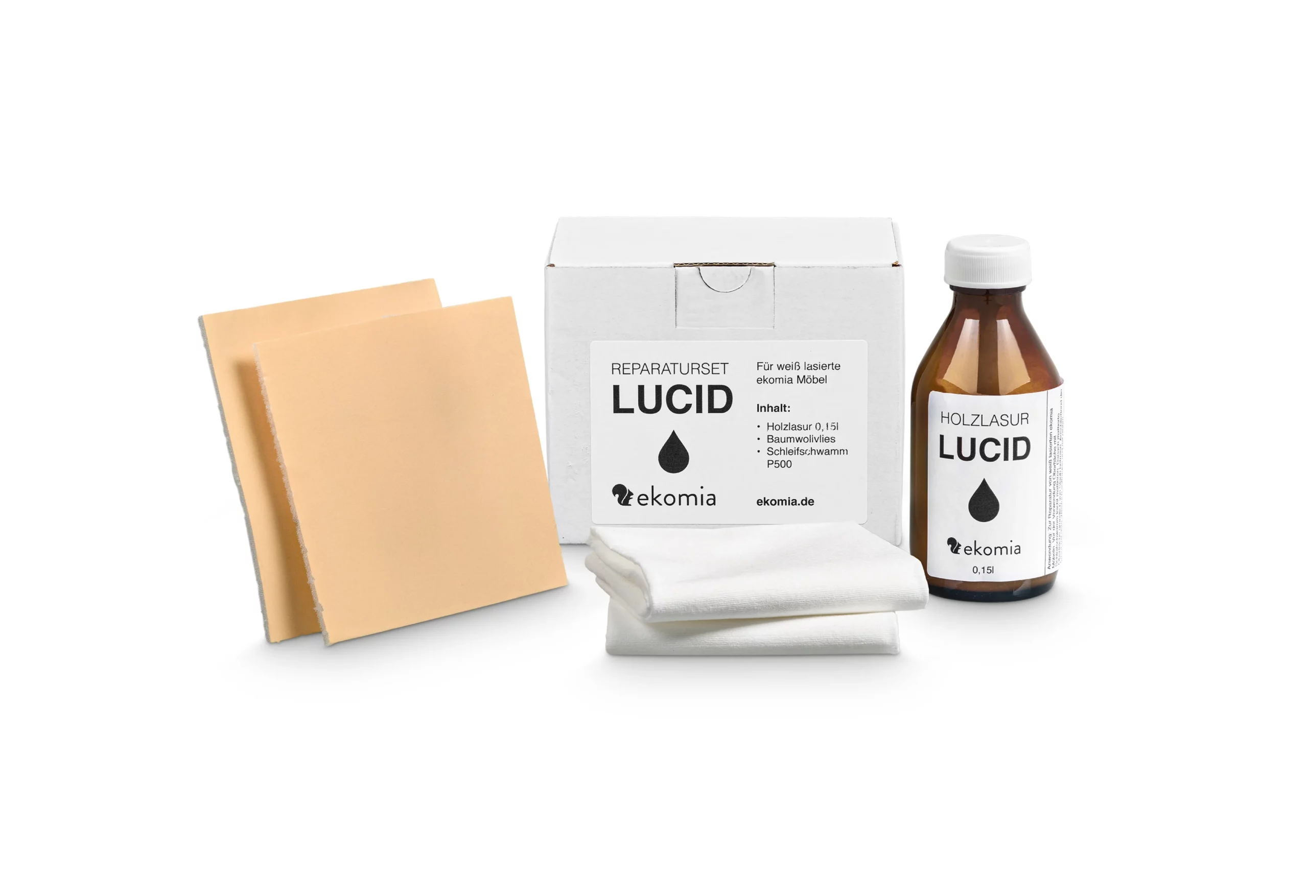 Mit dem Pflegeset Lucid kannst du Flecken an allen weißen ekomia Möbeln reparieren oder die Farbe auffrischen und widerstandsfähiger machen.