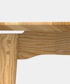 Die leicht gekippten runden Holzbeine verjüngen sich leicht zum Boden hin und sind mit den Tischzargen über ein “Glattes Eckblatt” mit sichtbaren Holzdübeln verbunden. Der Spalt gibt dem Tisch eine fast schwebende Leichtigkeit, die von der schmalen Schweizer Kante besonders hervorgehoben wird.
