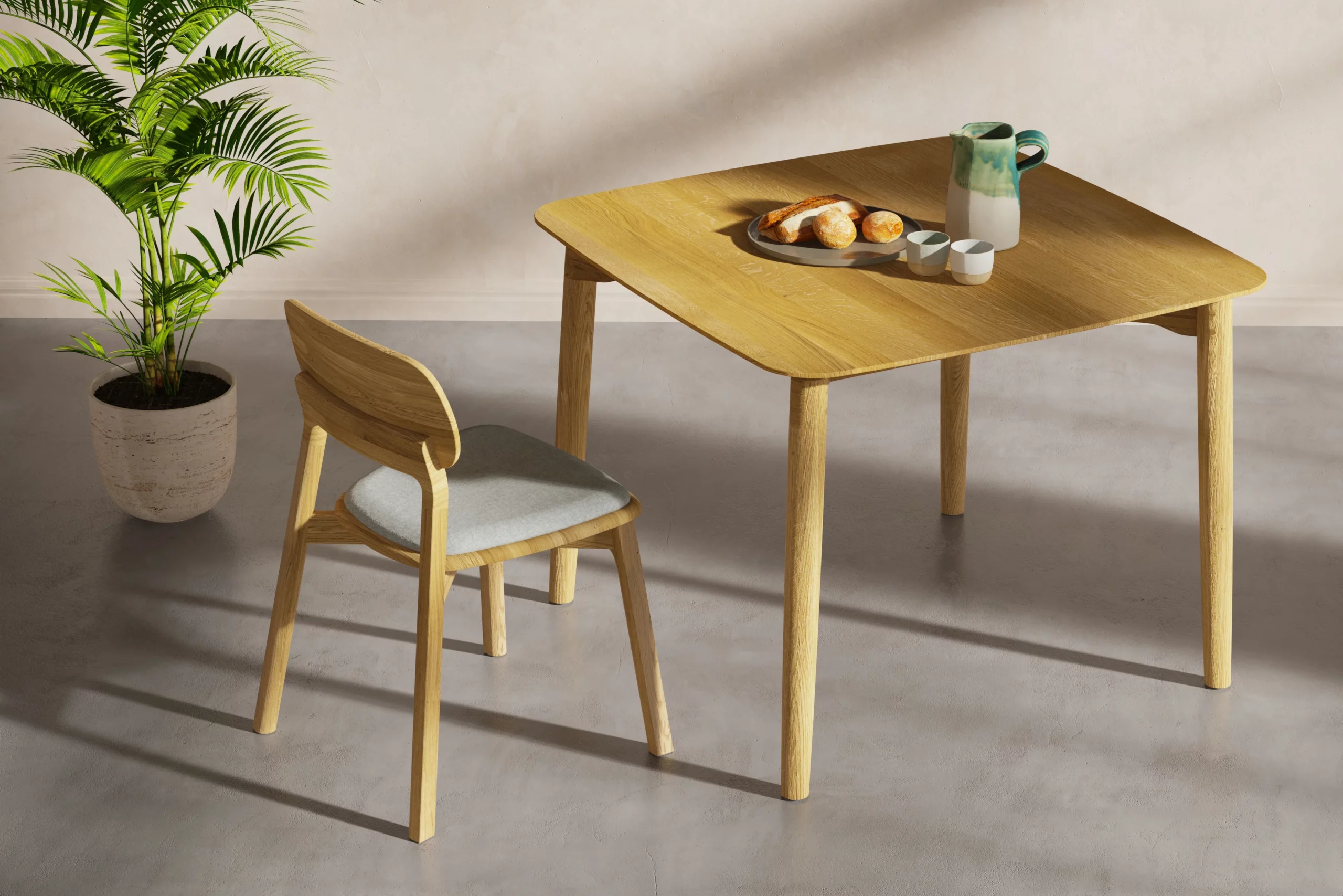 Die Seiten der quadratischen Tischplatte sind leicht nach außen gewölbt. Stabile Gratleisten auf der Unterseite schützen den Tisch vor Verzug. Durch die nah am Rand liegenden Tischbeine eignet sich Form S auch gut für kleine Tische – es bleibt trotz kleiner Größe viel Platz für die Stühle.