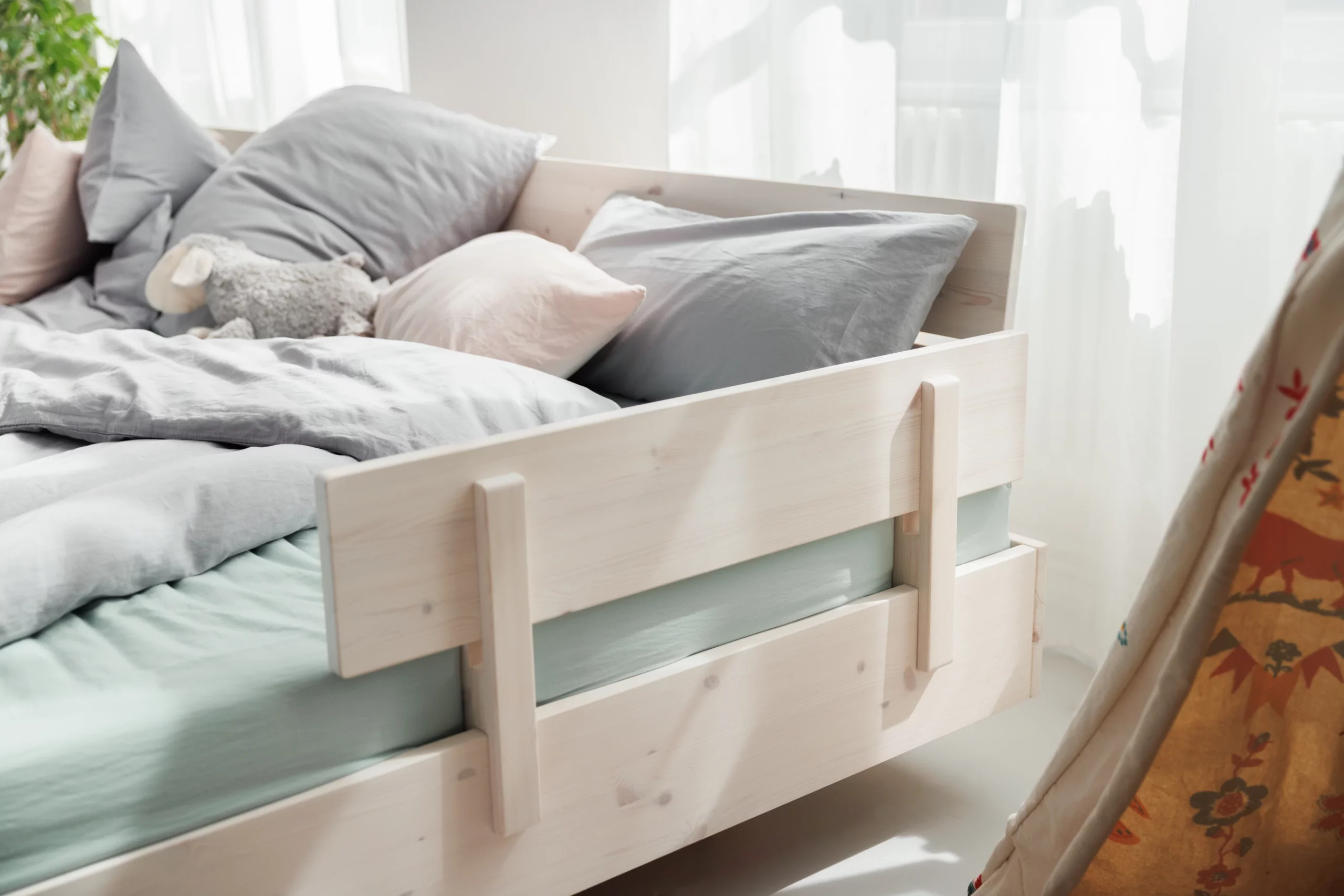 Der Swebe Rausfallschutz hält deine Kinder im Bett. Du kannst drei Höhen einstellen, je nachdem wie hoch deine Matratze ist. Der Rausfallschutz wird einfach auf das Bett geschoben. Dicke Filzstreifen sorgen für festen Halt und schützen das Bett vor Kratzern.