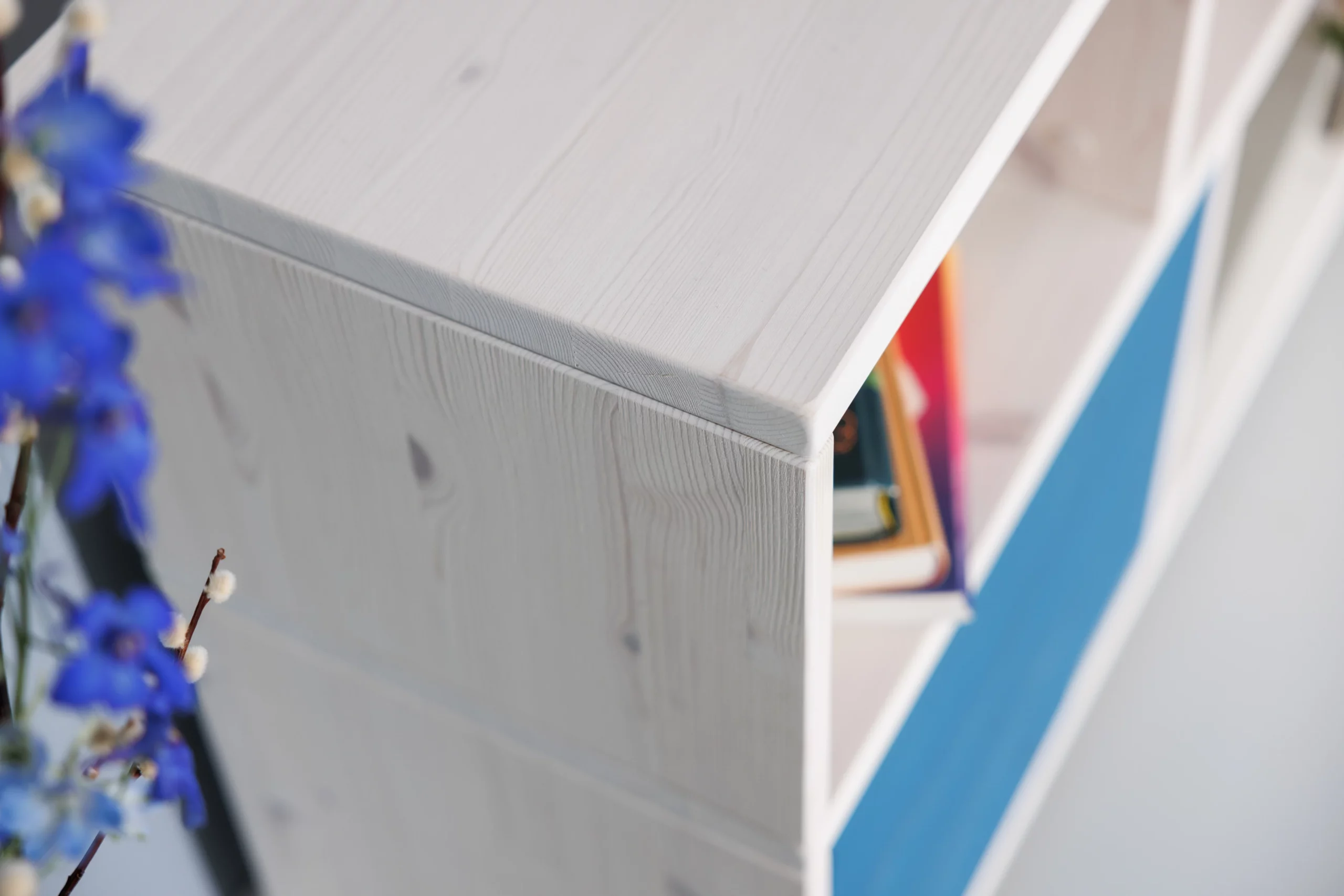 Das Regal Alma wird aus zertifiziertem massivem Kiefernholz gefertigt. Die ökologische Lasur aus natürlichen Rohstoffen lässt die Maserung der Kiefer leicht durchschimmern.