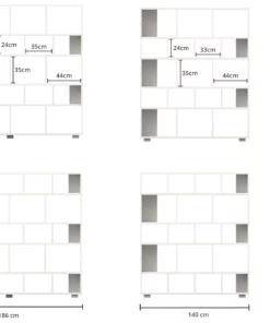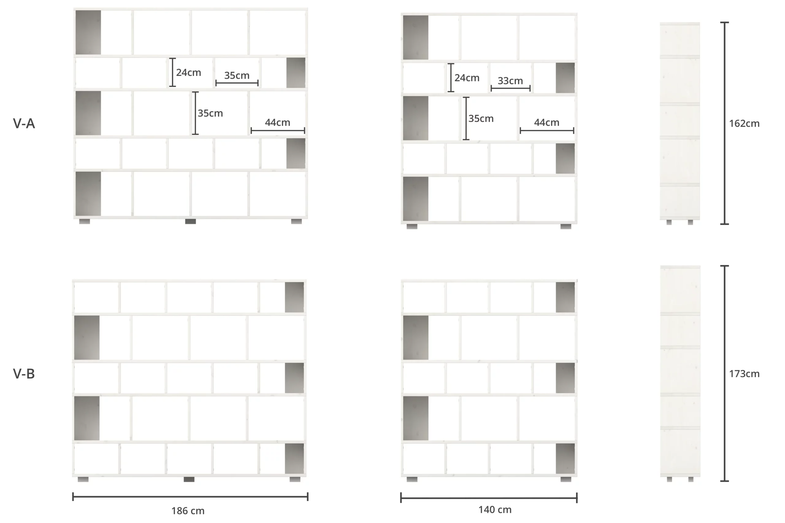 Du kannst das Regal in zwei Breiten und zwei Varianten bestellen. Alma L hat 5 Ebenen in unterschiedlichen Höhen. Die hohen Regalreihen eignen sich sehr gut als Stauraum für Ordner, Bildbände, Schallplatten oder Kisten. Die niedrigeren Reihen sind für Bücher und dergleichen geeignet. Bei Variante A und B sind lediglich die Regalreihen vertauscht.