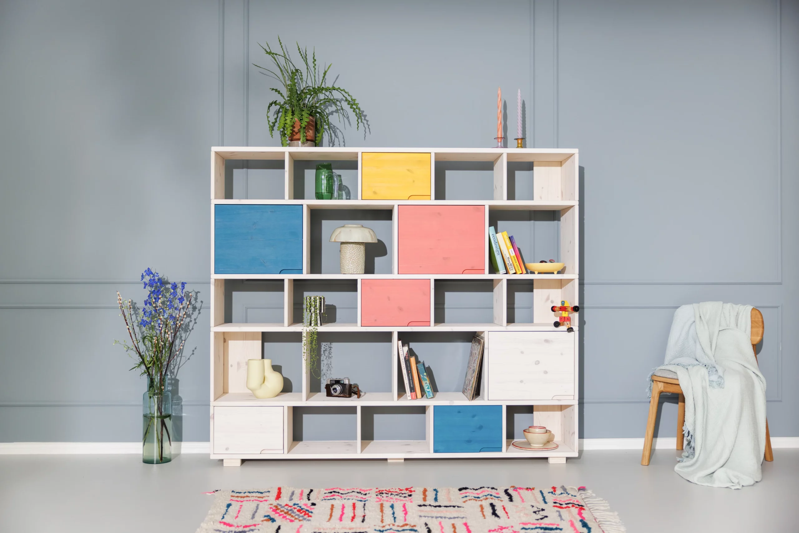 Optional kannst du weiße oder farbige Türen dazu bestellen. Die erdigen Farben bringen frische Akzente in jeden Raum. Die Magneten, die an den Türen befestigt sind, um sie in Position zu halten, schnappen mit einem sanften Ton zu. Du kannst die Türen mit dem Griff nach unten oder nach oben anbringen.