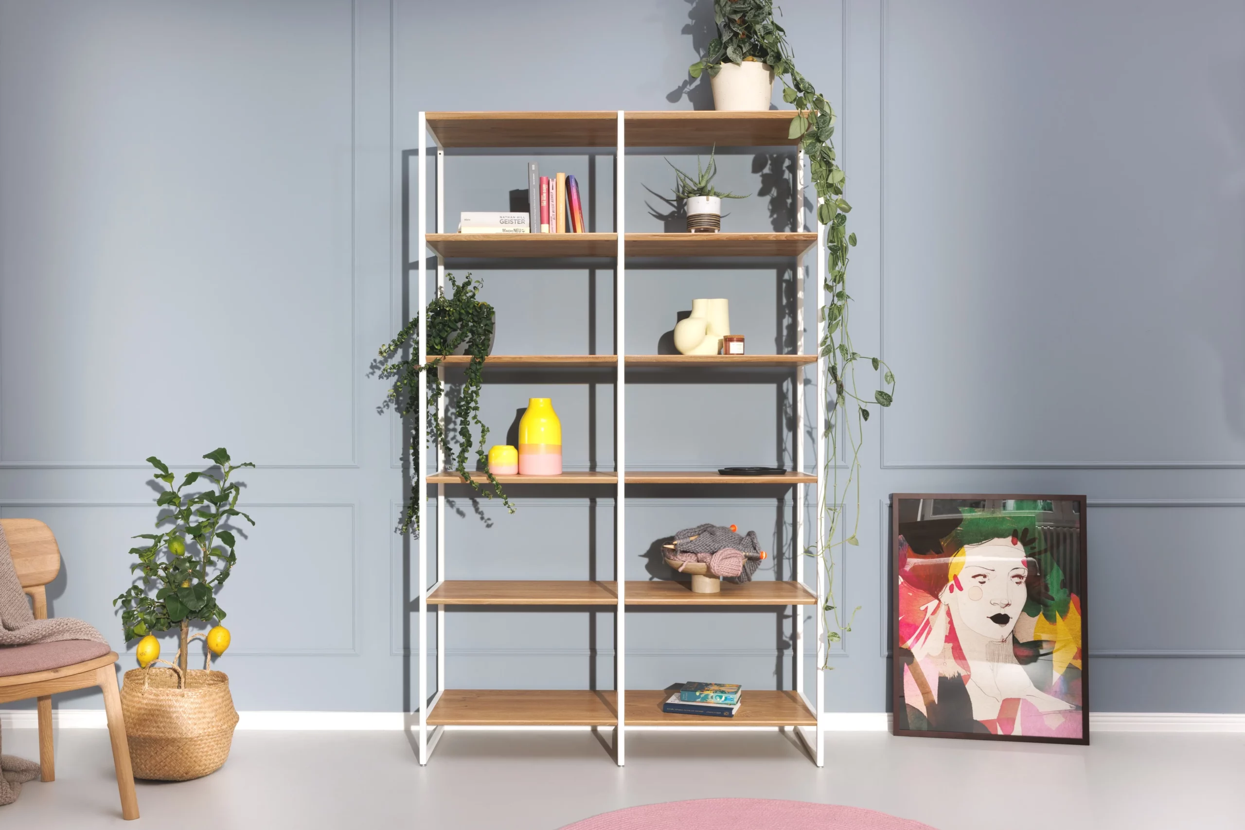 Durch den schlanken Rahmen und Regalfächer in zwei Breiten 40 oder 60 cm mit schmal gefrästen Kanten kommt Wega sehr stilvoll daher. Dank des Rahmens aus pulverbeschichtetem Stahl benötigt das Regal weniger Material und ist trotzdem äußerst stabil. Dezente verstellbare Füße gleichen Unebenheiten im Boden aus.