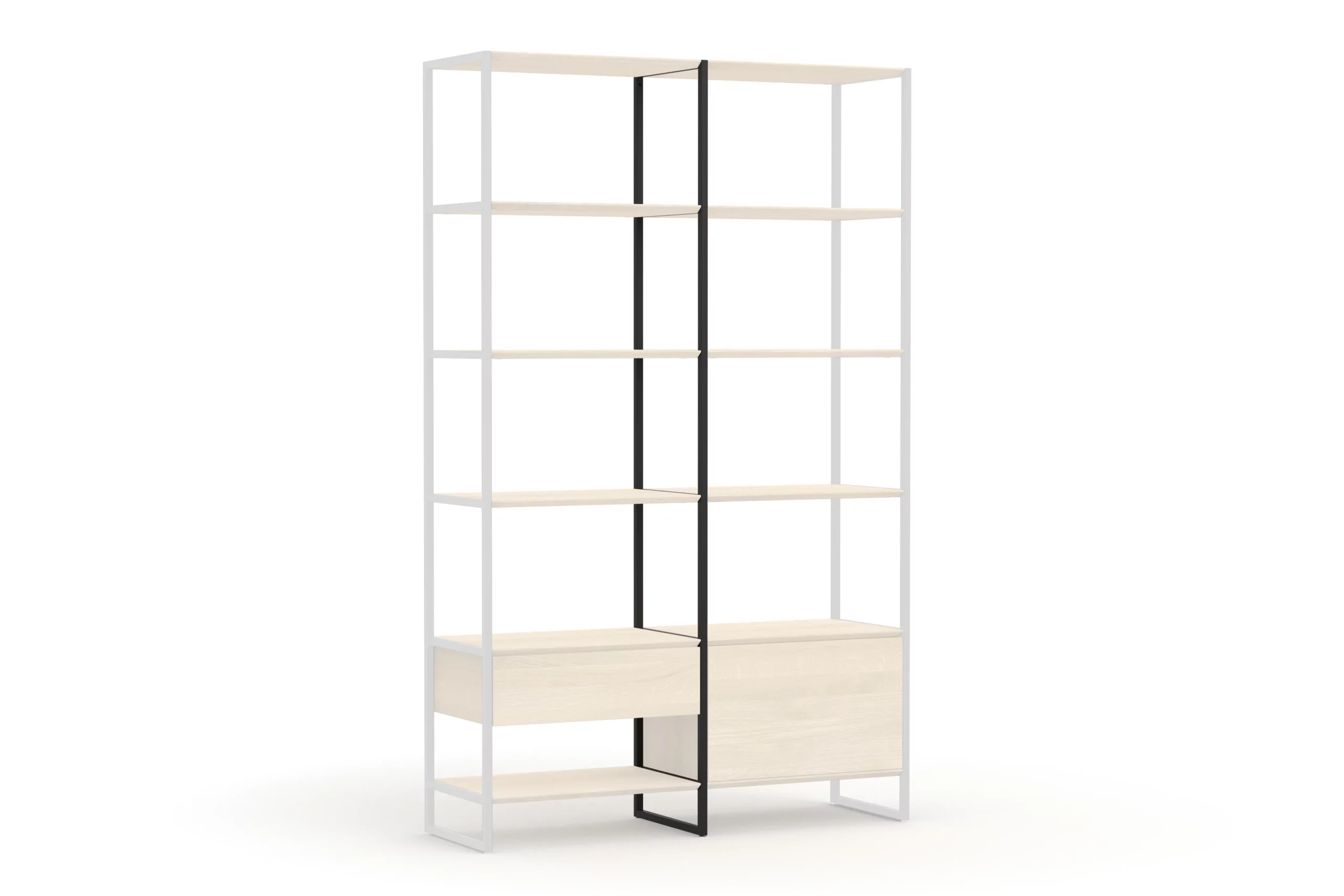 Pro Verbindungsrahmen musst du 6 Regalfächer (Wega Shelf) hinzufügen. Optional kannst du anstelle von 5 Regalfächern wahlweise Schubladen (Wega Drawer) oder Türmodule (Wega Door) hinzufügen.