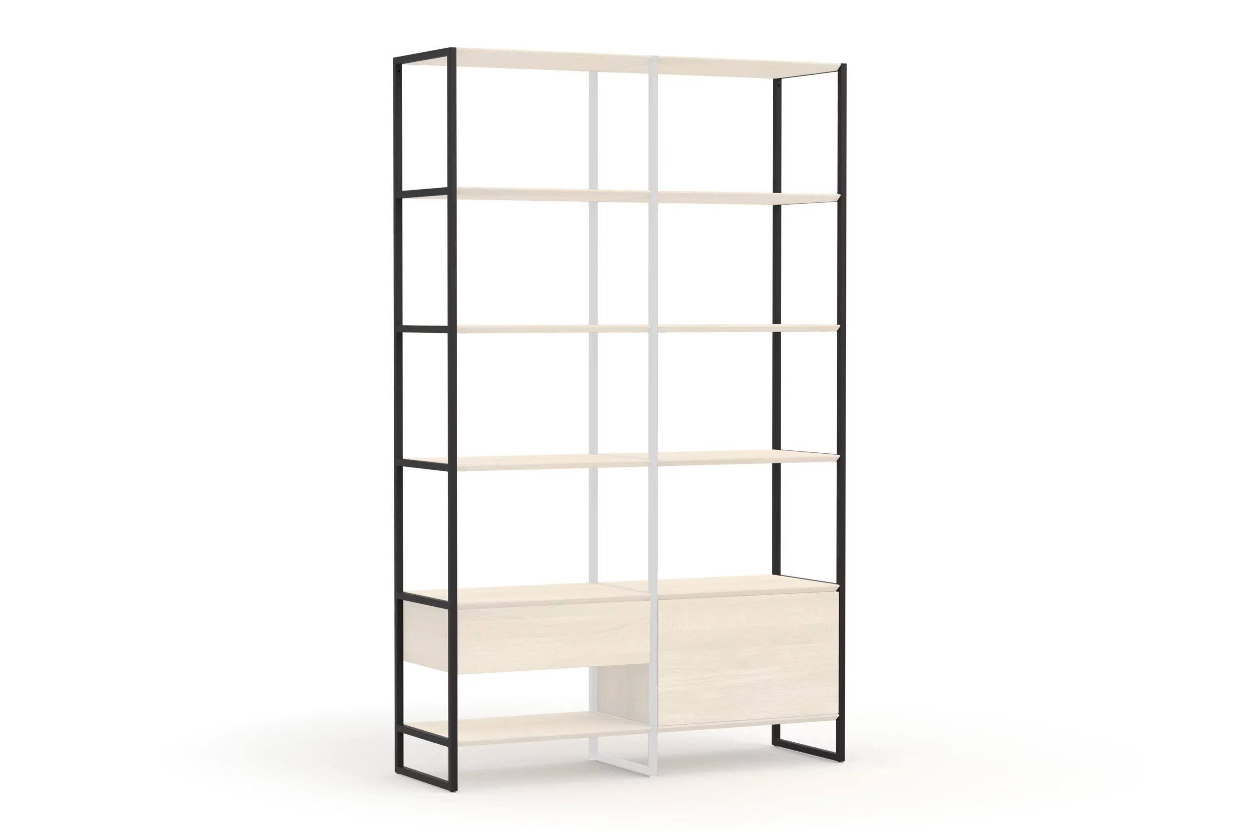 Pro Säule musst du 6 Regalfächer (Wega Shelf) hinzufügen. Optional kannst du anstelle von 5 Regalfächern wahlweise Schubladen (Wega Drawer) oder Türenmodule (Wega Door) hinzufügen.
