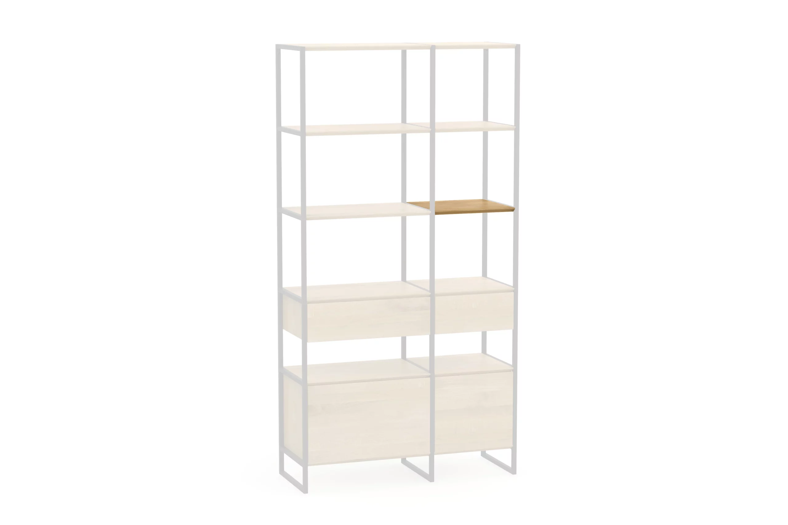Optional kannst du anstelle Regalfächern wahlweise Schubladen (Wega Drawer) oder Türenmodule (Wega Door) hinzufügen.