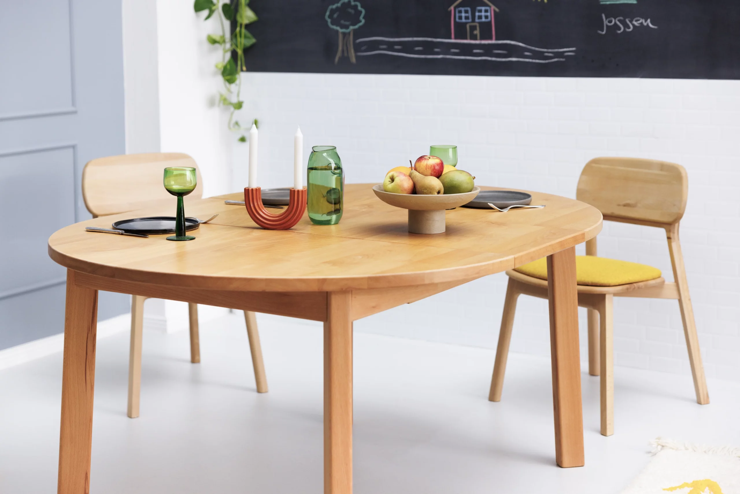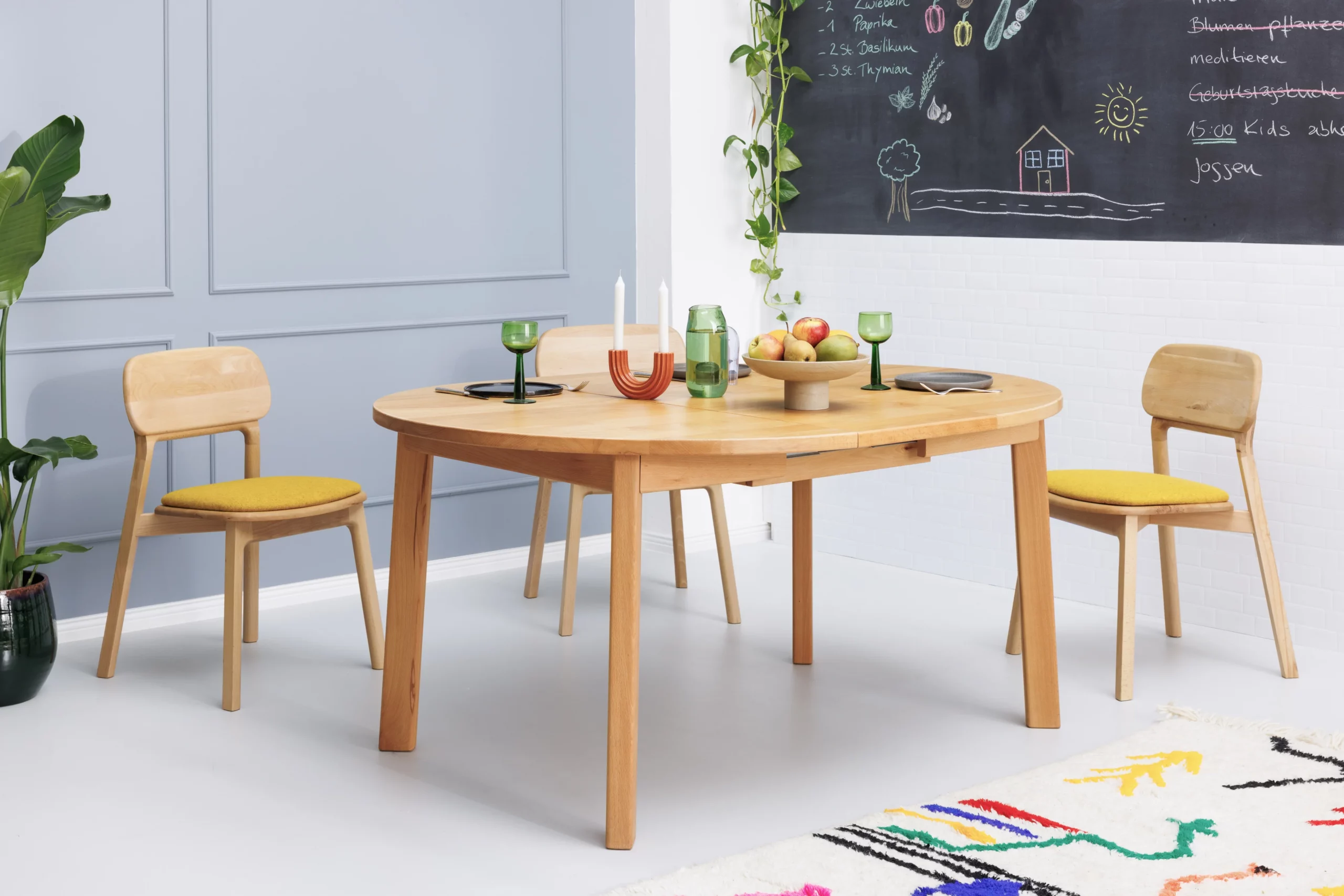 Wir nutzen bewährte Qualitätskomponenten für Massivholztische. Die Erweiterungsplatte hat eingefräste Griffe, wodurch sie sich von einer Person leicht ausklappen lässt. Auch im ausgefahrenen Zustand büßt der Tisch nicht an Stabilität und Standfestigkeit ein.