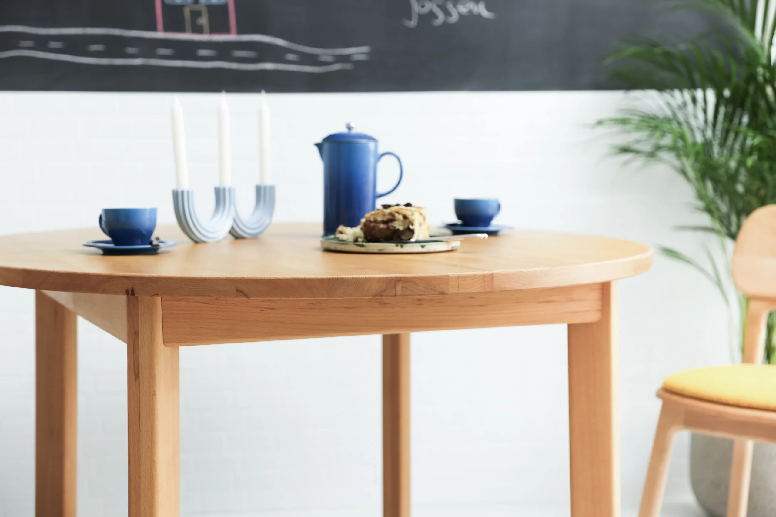 Bestelle den runden Esstisch Form F in einer Holzart deiner Wahl. Durch die große Tischfläche entstehen einzigartige und beeindruckende Maserungen. Das zertifizierte Massivholz wird neben den stabilisierenden Zargen auf der Unterseite mit Gratleisten aus Metall verstärkt, damit die Tischplatte schön gerade bleibt.
