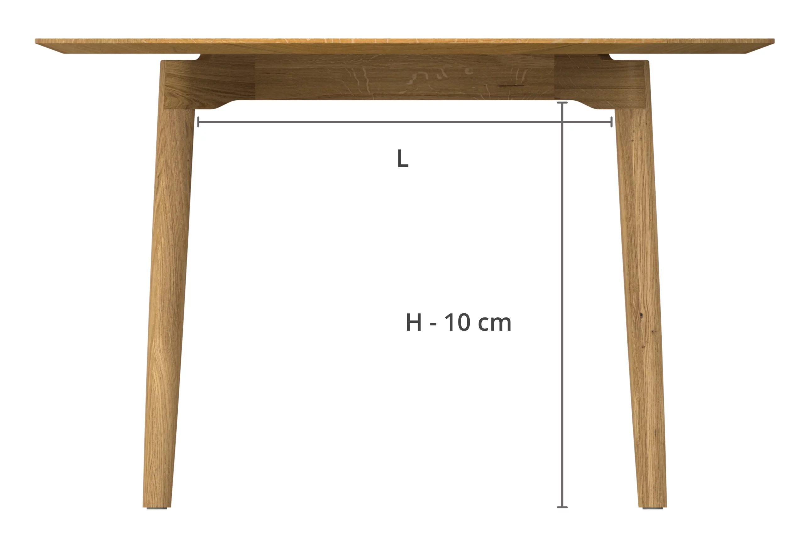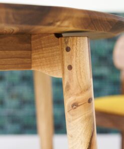 Die leicht gekippten runden Holzbeine verjüngen sich leicht zum Boden hin und sind mit den Tischzargen über ein “Glattes Eckblatt” mit sichtbaren Holzdübeln verbunden. Der Spalt gibt dem Tisch eine fast schwebende Leichtigkeit, die von der schmalen Schweizer Kante besonders hervorgehoben wird.