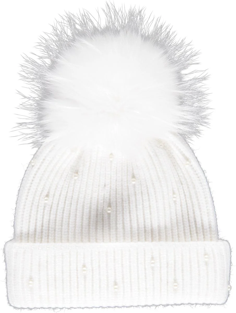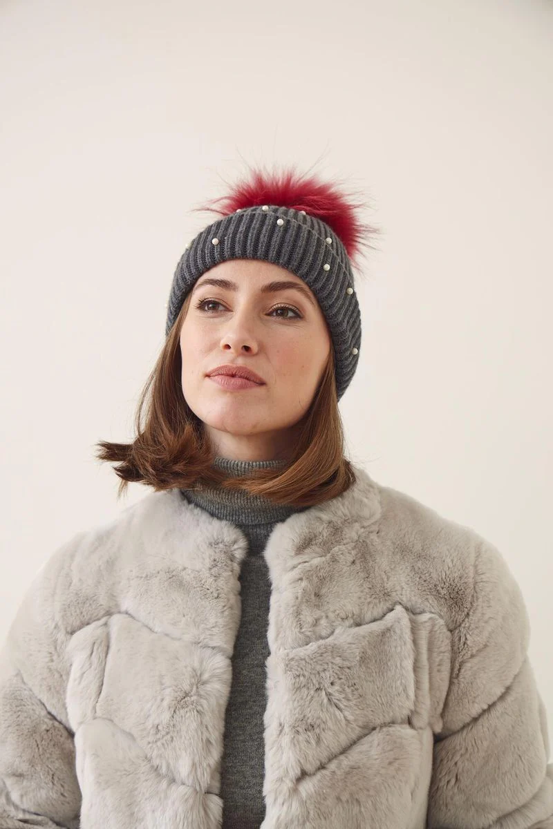 Hier ist eine Mütze mit einem femininen Look. Die Mütze ist aus gestrickter Wolle, Nylon und Viskose gefertigt und hat feine kleine Perlen in einer natürlichen Verteilung. Die Mütze hat ein Waschbär-Büschel auf der Oberseite, ist eine Einheitsgröße und ist perfekt, um dich warm und stilvoll zugleich zu halten.